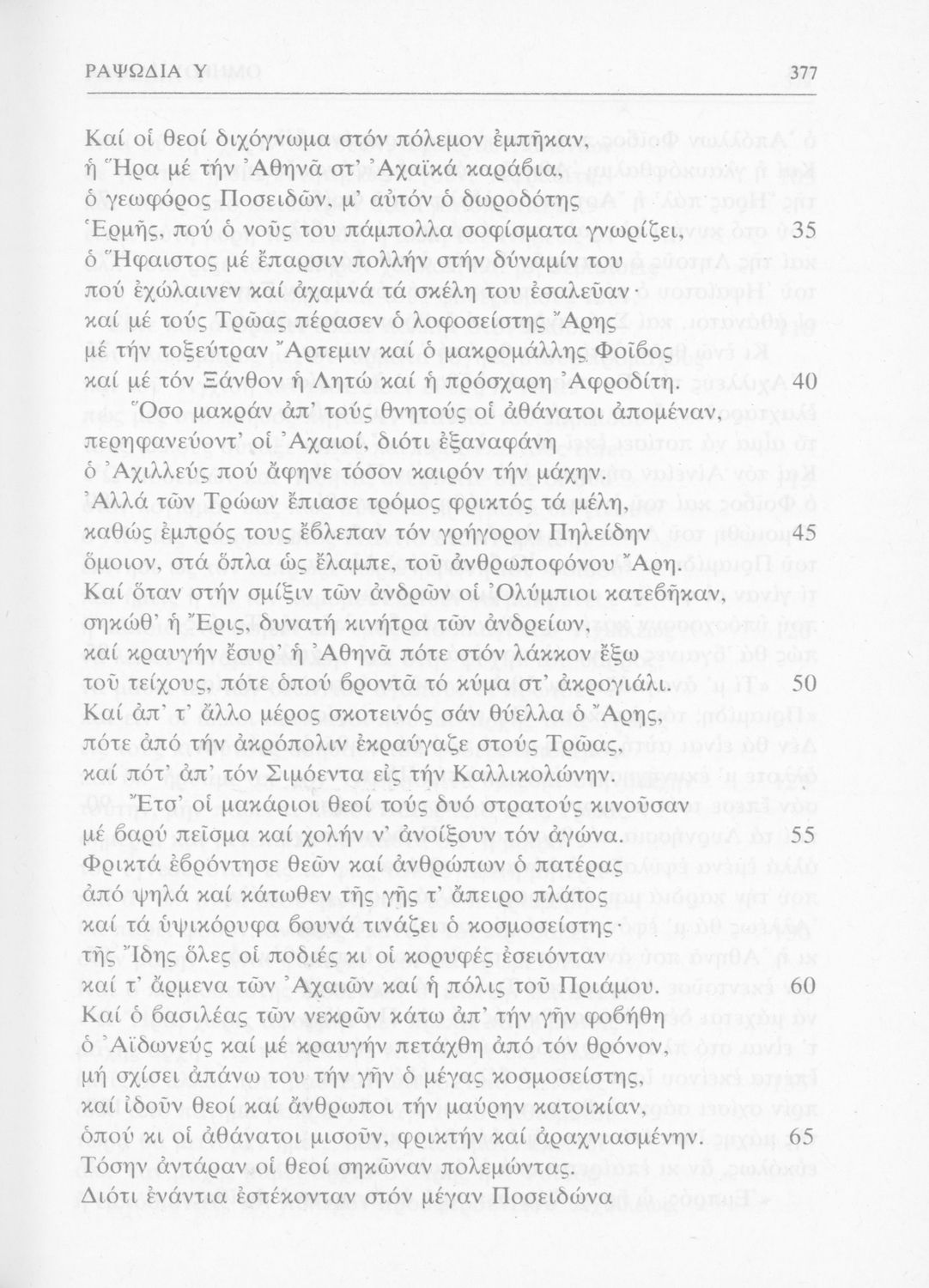 Σχολικό εγχειρίδιο Ε' Γυμνασίου για το μάθημα των Αρχαίων Ελληνικών. Περιλαμβάνει αποσπάσματα από ραψωδίες της Ιλιάδας, ερμηνευτικά και πραγματολογικά σχόλια και λεξιλογικές παρατηρήσεις.