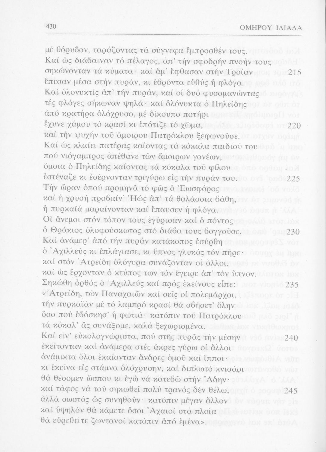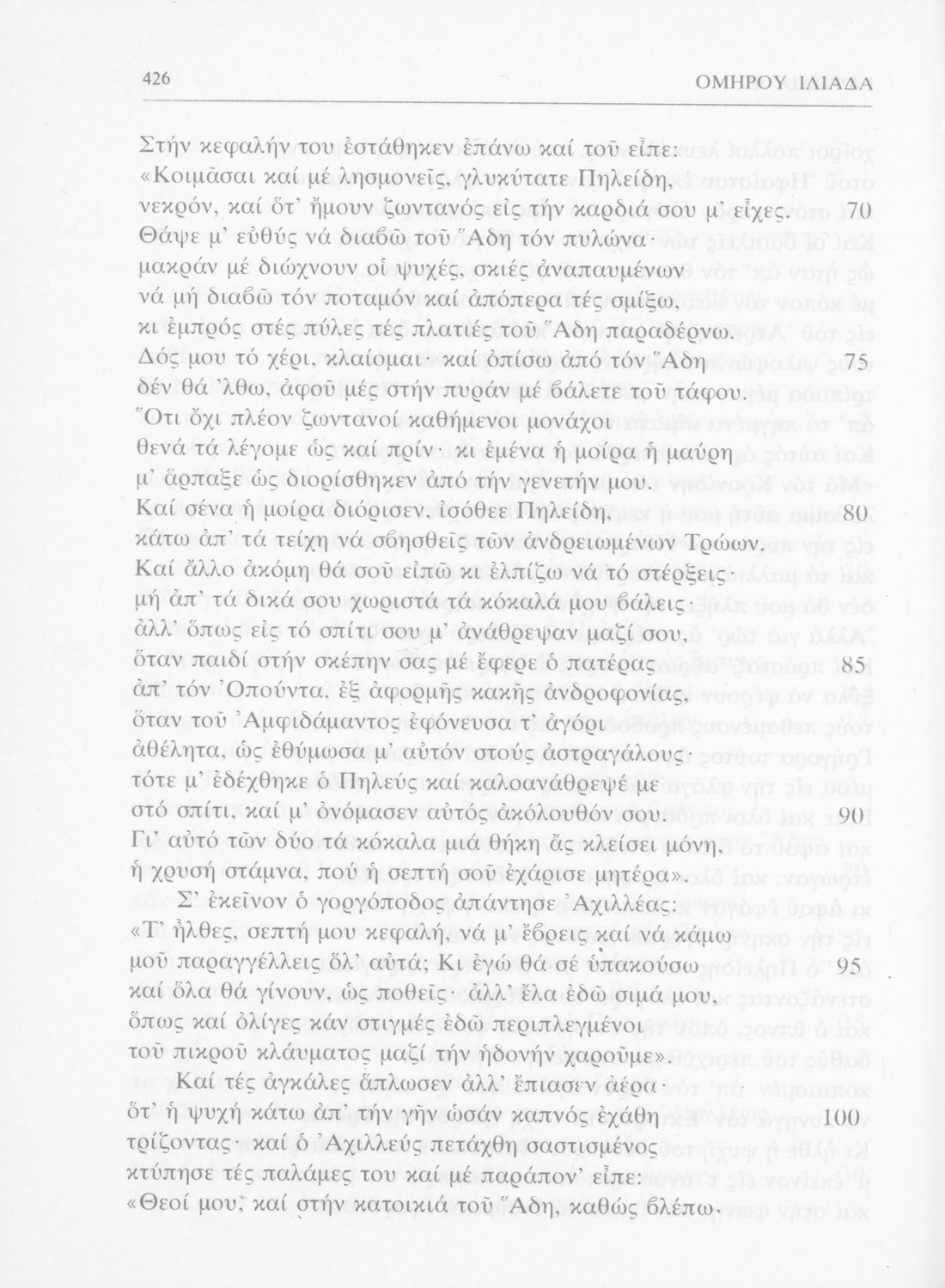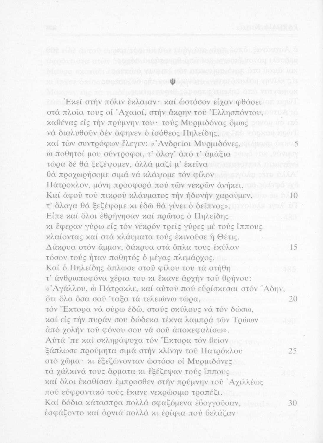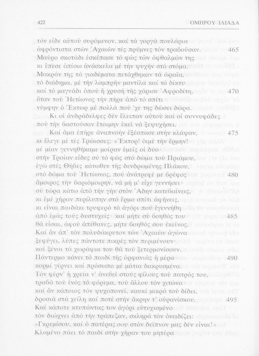 Σχολικό εγχειρίδιο της Δευτεροβάθμιας Εκπαίδευσης για το μάθημα των Αρχαίων Ελληνικών. Πρόκειται για το κείμενο της Ιλιάδας μεταφρασμένο, με πραγματολογικές παρατηρήσεις. Στο τέλος περιλαμβάνει λεξιλόγιο.