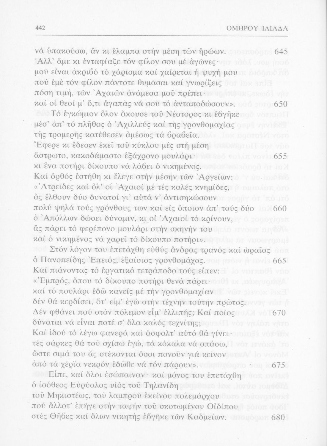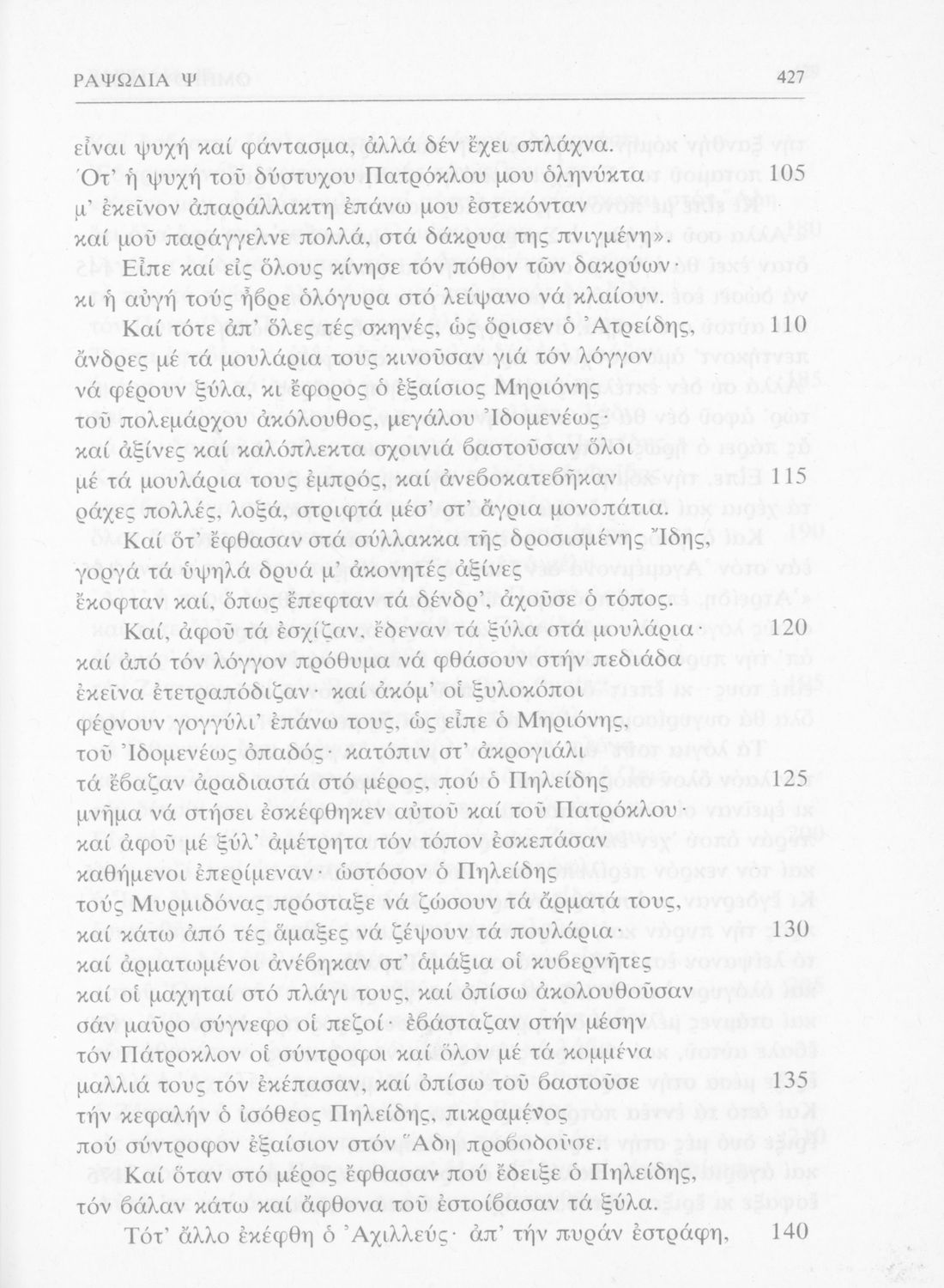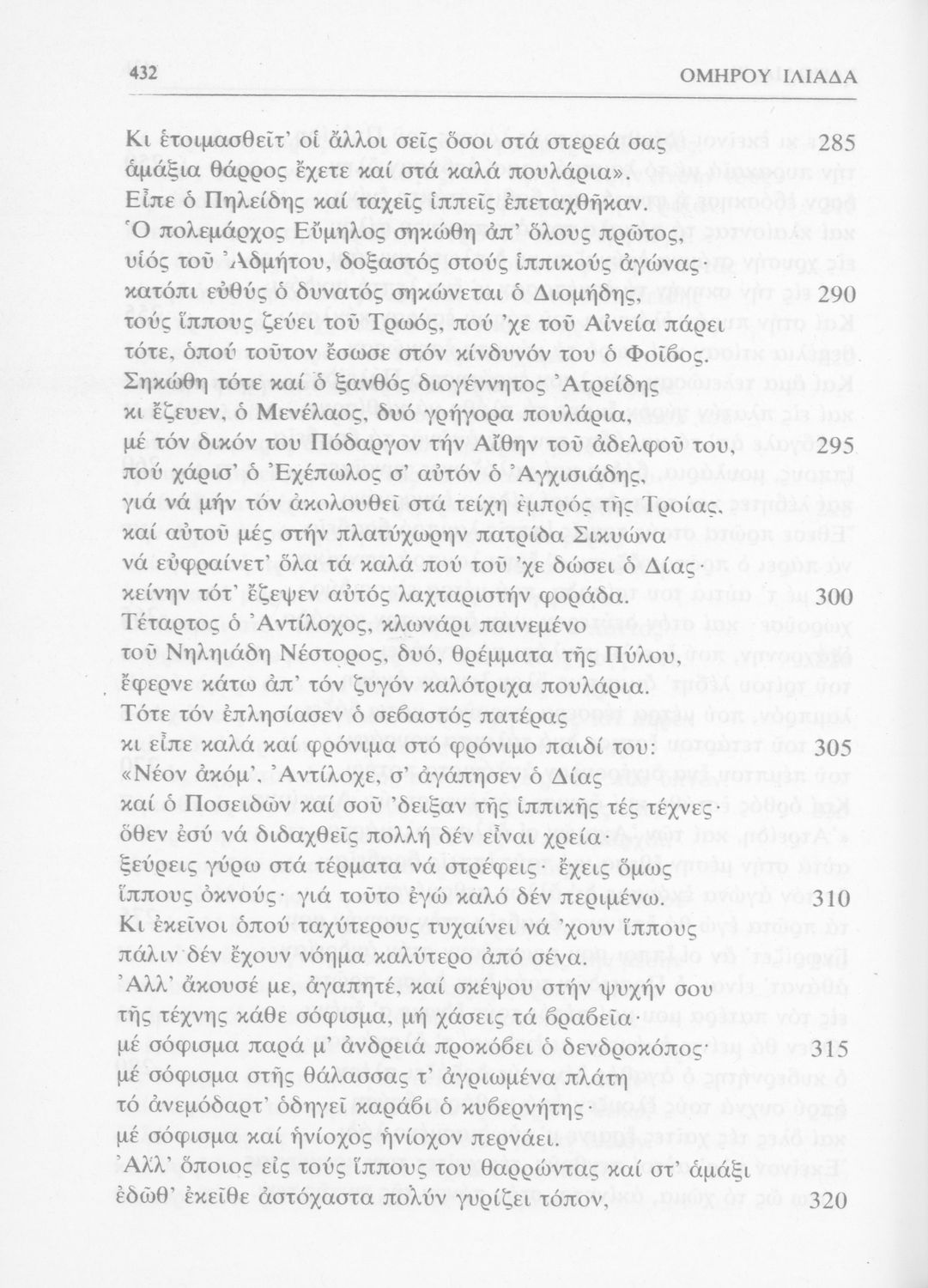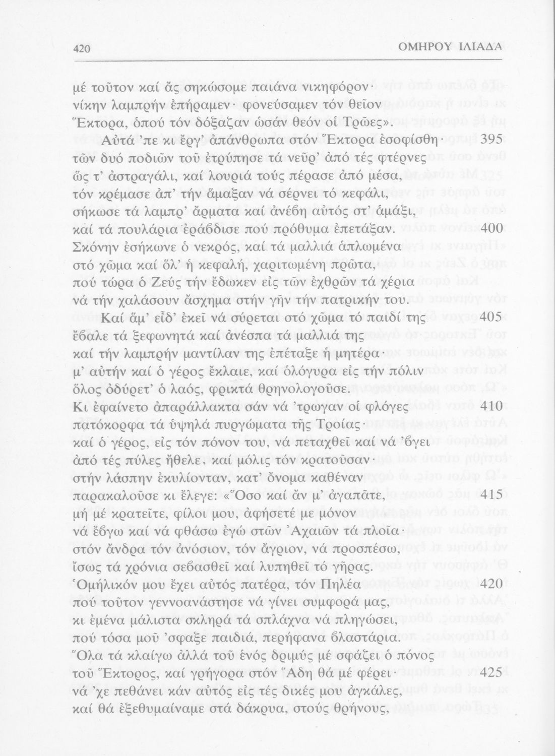 Σχολικό εγχειρίδιο της Δευτεροβάθμιας Εκπαίδευσης για το μάθημα των Αρχαίων Ελληνικών. Πρόκειται για το κείμενο της Ιλιάδας μεταφρασμένο, με πραγματολογικές παρατηρήσεις. Στο τέλος περιλαμβάνει λεξιλόγιο.