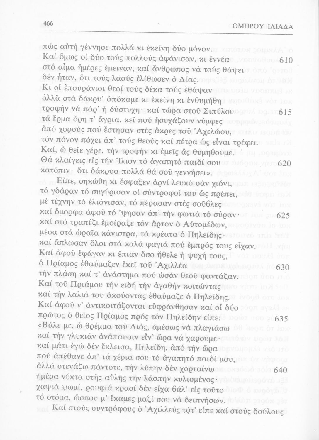 Σχολικό εγχειρίδιο Αρχαίων Ελληνικών. Το βιβλίο περιλαμβάνει εισαγωγή σχετικά με τις διαφορές Οδύσσειας και Ιλιάδας, το περιεχόμενο της Ιλιάδας, το ομηρικό πρόβλημα και την επίδραση των ομηρικών επών στον Ελληνικό και Δυτικό πολιτισμό. Ακολουθεί η Ιλιάδα του Ομήρου σε μετάφραση του Ιάκωβου Πολυλά και σχετικά σχόλια. Η εισαγωγή και τα ερμηνευτικά σχόλια έγιναν από την Ελένη Ι. Κακριδή.