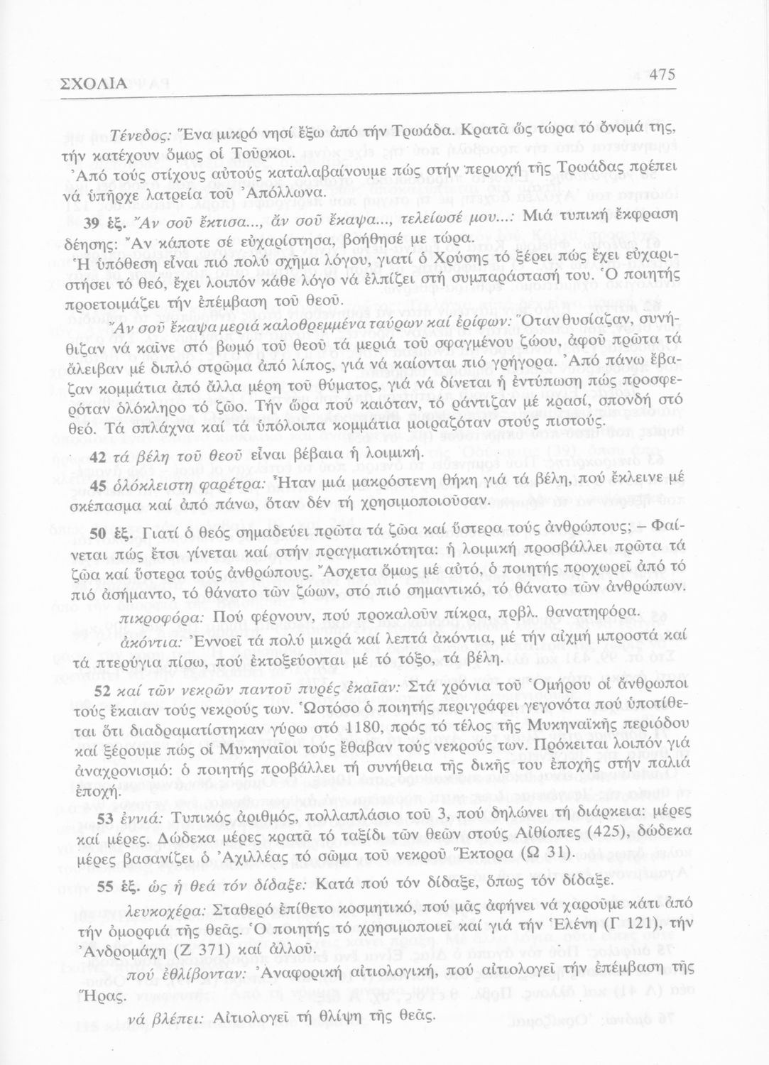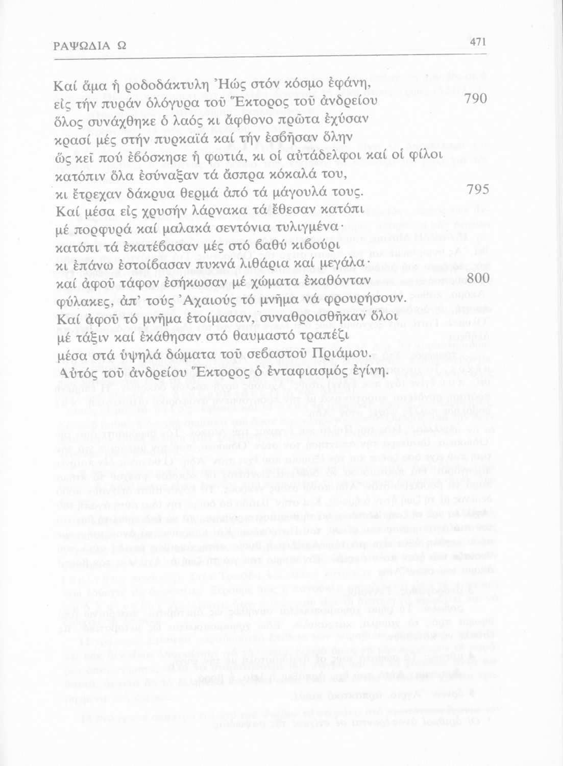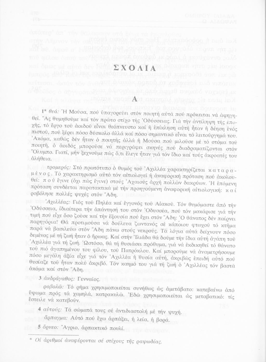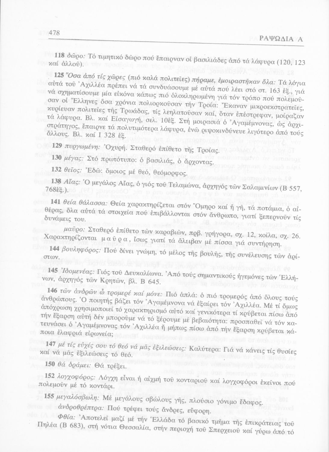 Μαθητικό βοήθημα του Ελληνικού Σχολείου, των Παρθεναγωγείων και του Γυμνασίου για το μάθημα των Αρχαίων Ελληνικών. Περιέχει τις ραψωδίες Ο, Π, Ρ, Σ, Τ, Χ, ψ, Ω από το πρωτότυπο με σχόλια και ερμηνευτικές ...