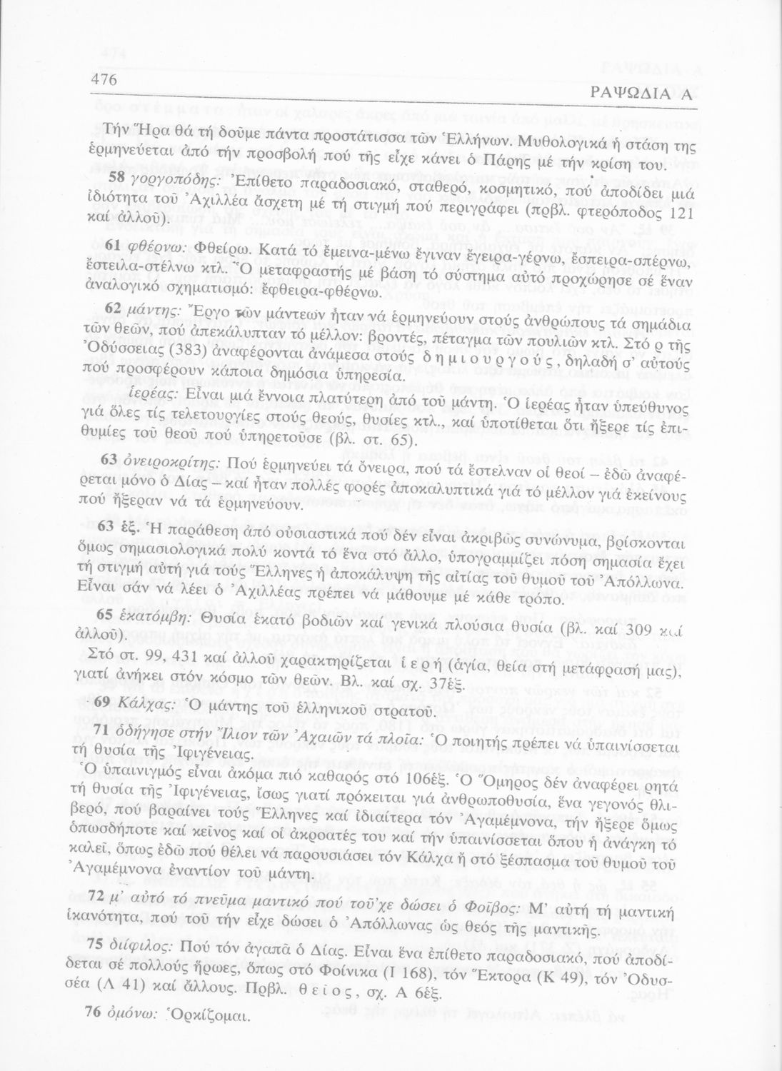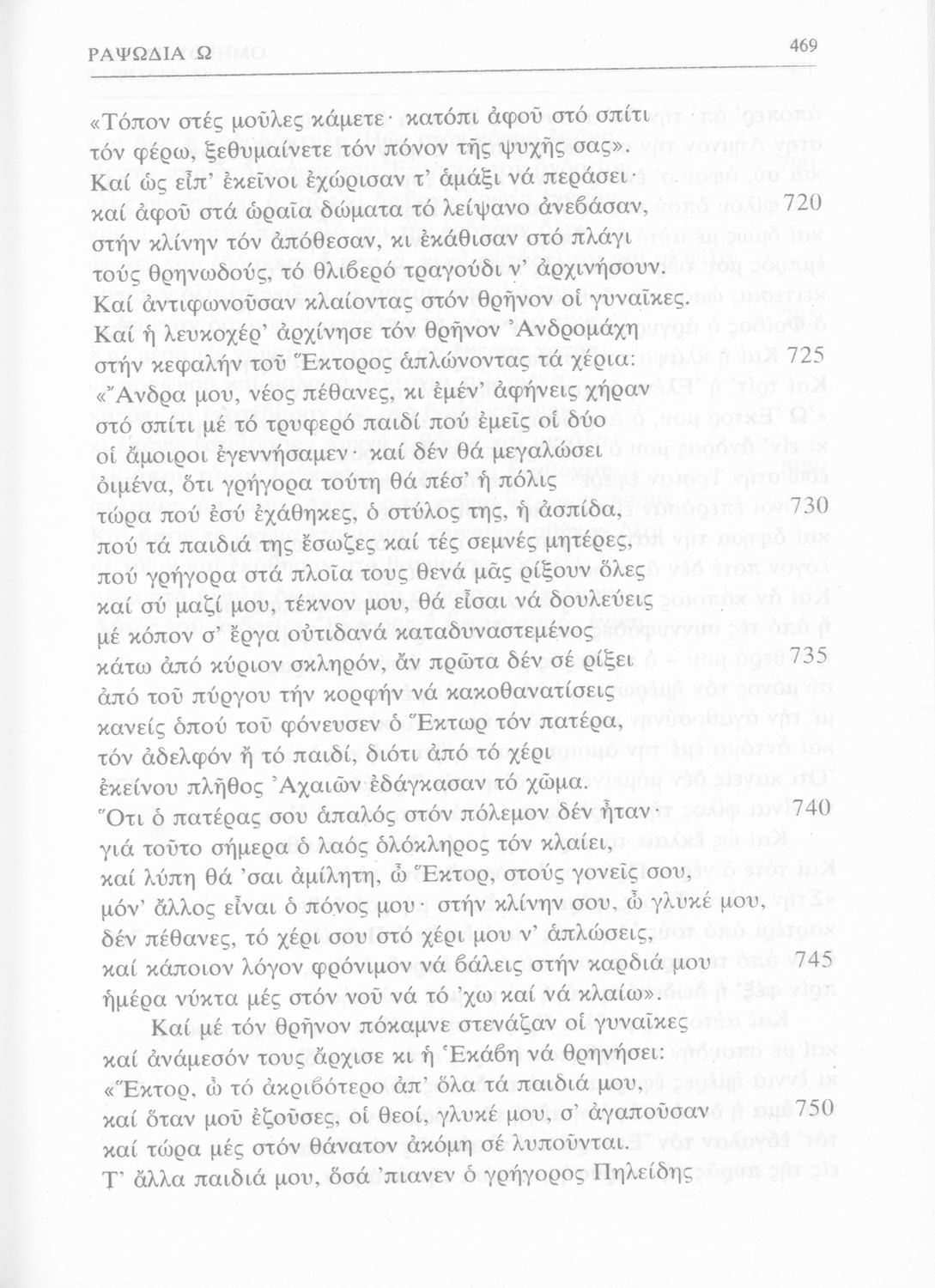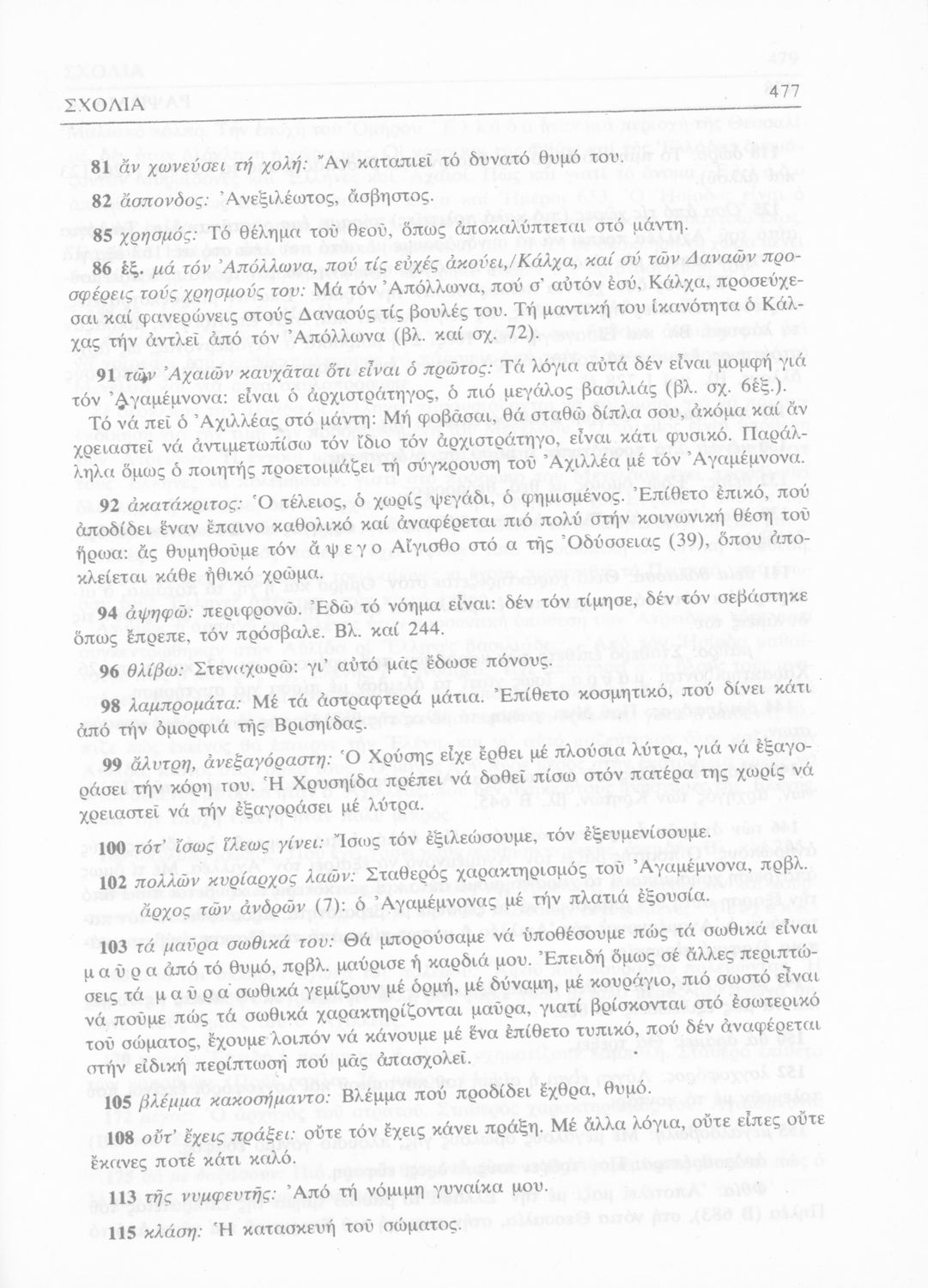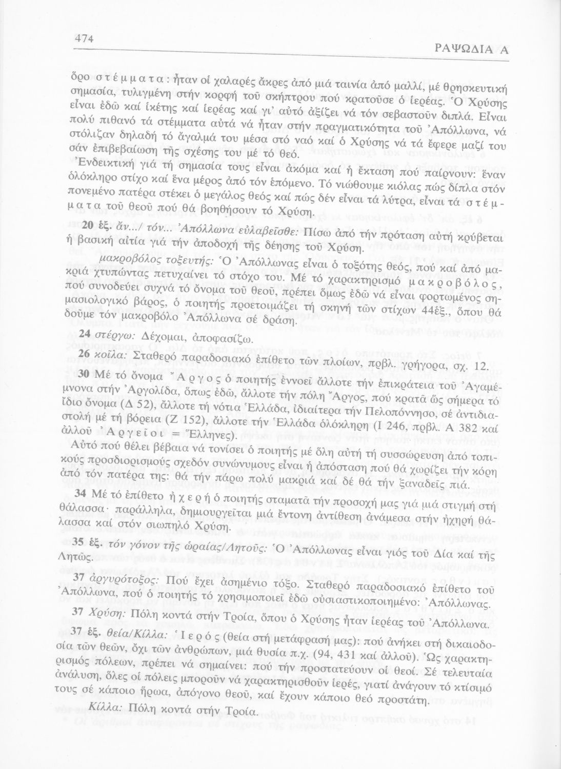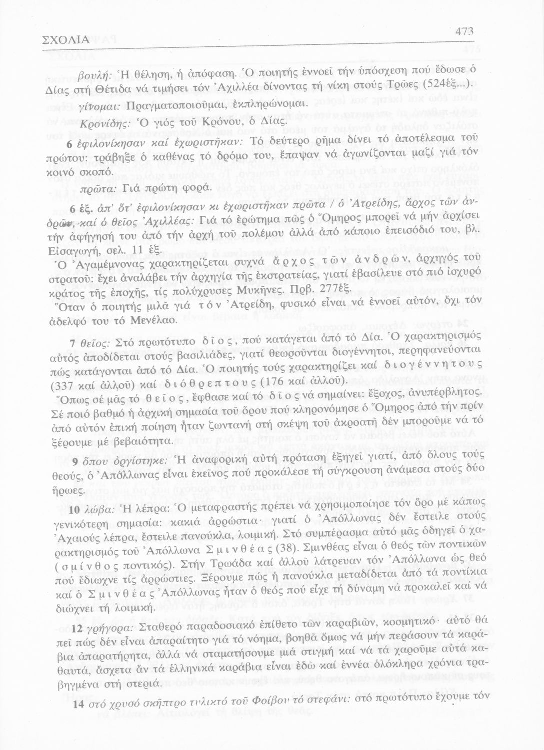 Μαθητικό βοήθημα του Ελληνικού Σχολείου, των Παρθεναγωγείων και του Γυμνασίου για το μάθημα των Αρχαίων Ελληνικών. Περιέχει τις ραψωδίες Ο, Π, Ρ, Σ, Τ, Χ, ψ, Ω από το πρωτότυπο με σχόλια και ερμηνευτικές ...