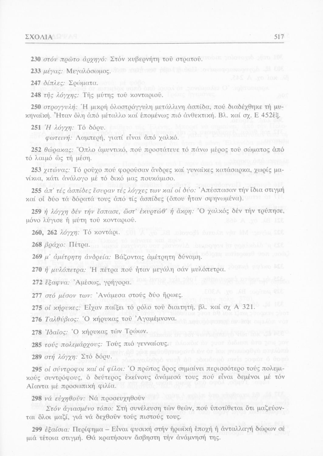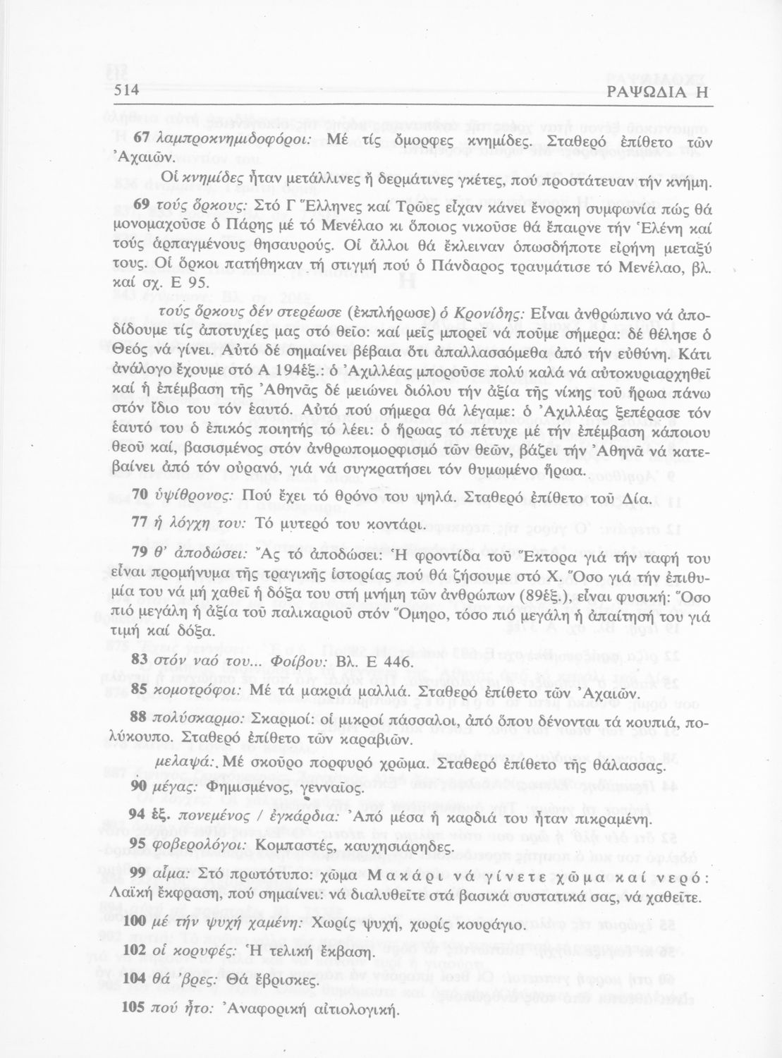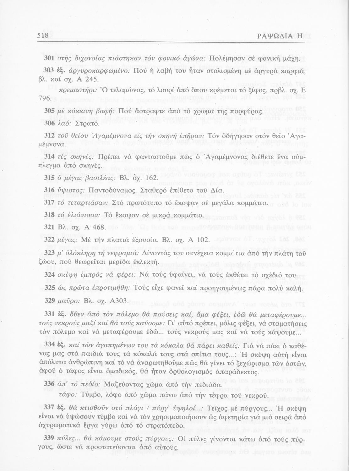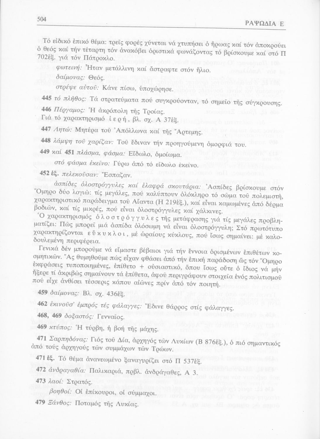 Μαθητικό βοήθημα του Ελληνικού Σχολείου, των Παρθεναγωγείων και του Γυμνασίου για το μάθημα των Αρχαίων Ελληνικών. Περιέχει τις ραψωδίες Ο, Π, Ρ, Σ, Τ, Χ, ψ, Ω από το πρωτότυπο με σχόλια και ερμηνευτικές ...