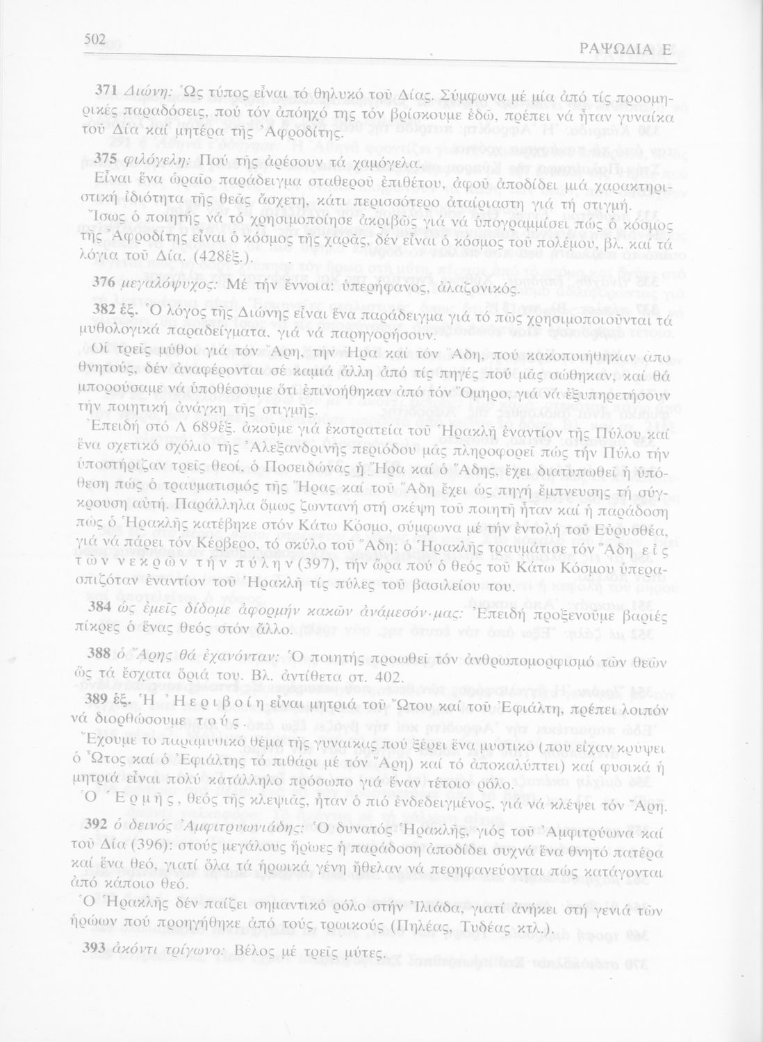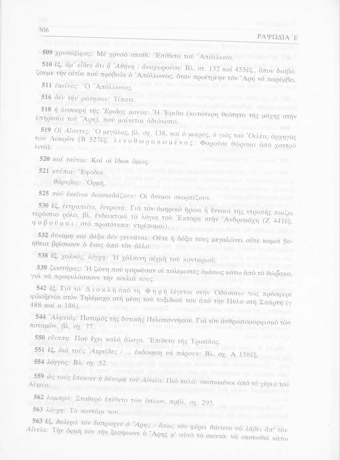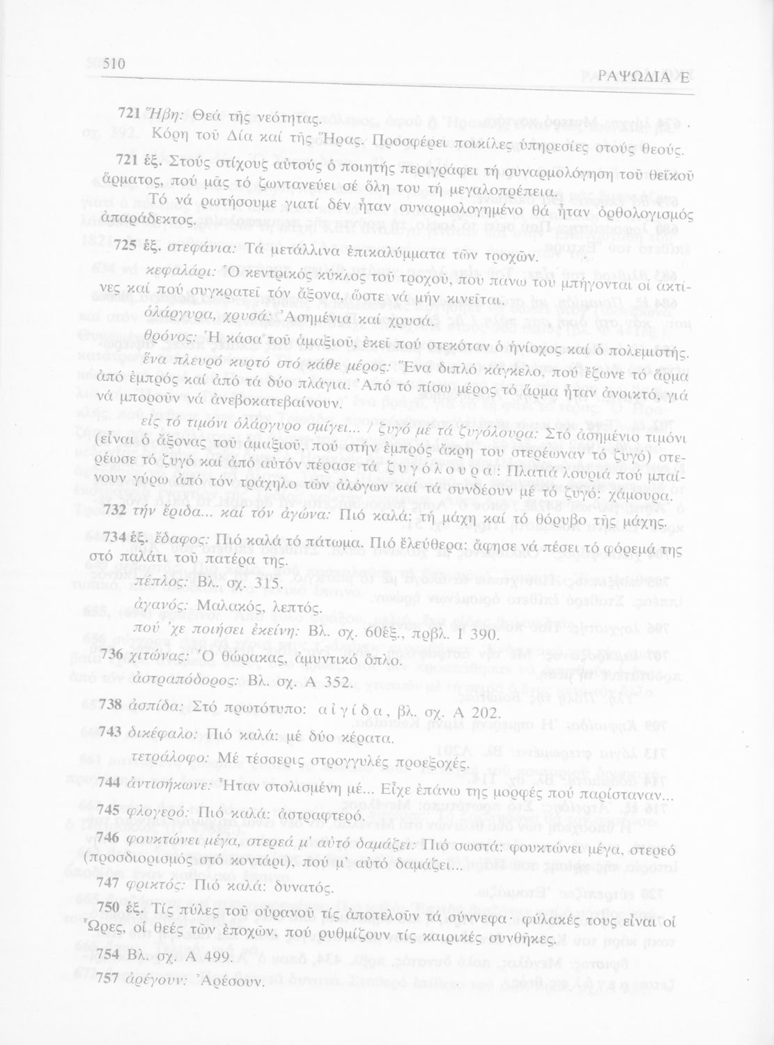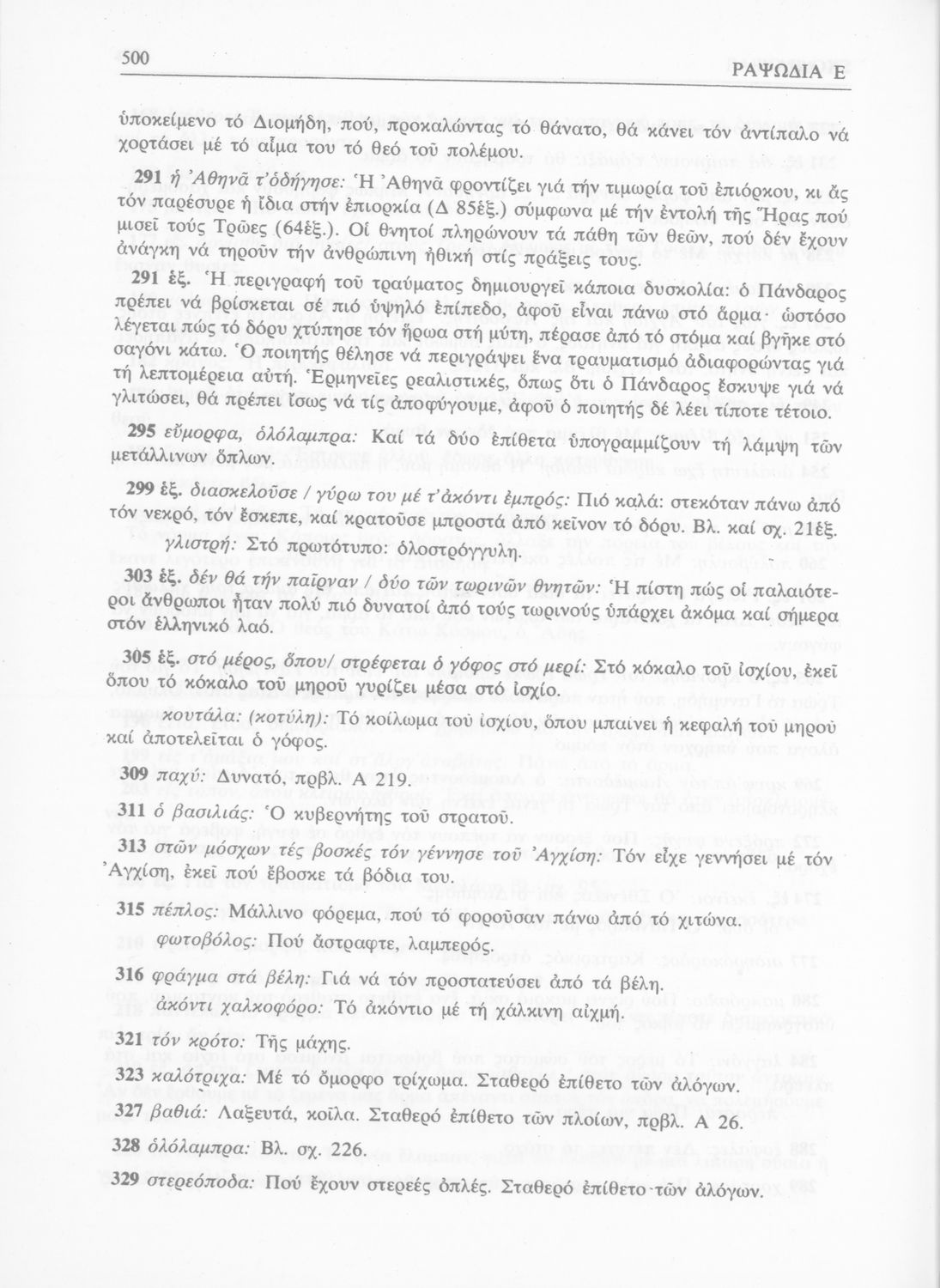 Μαθητικό βοήθημα του Ελληνικού Σχολείου, των Παρθεναγωγείων και του Γυμνασίου για το μάθημα των Αρχαίων Ελληνικών. Περιέχει τις ραψωδίες Ο, Π, Ρ, Σ, Τ, Χ, ψ, Ω από το πρωτότυπο με σχόλια και ερμηνευτικές ...