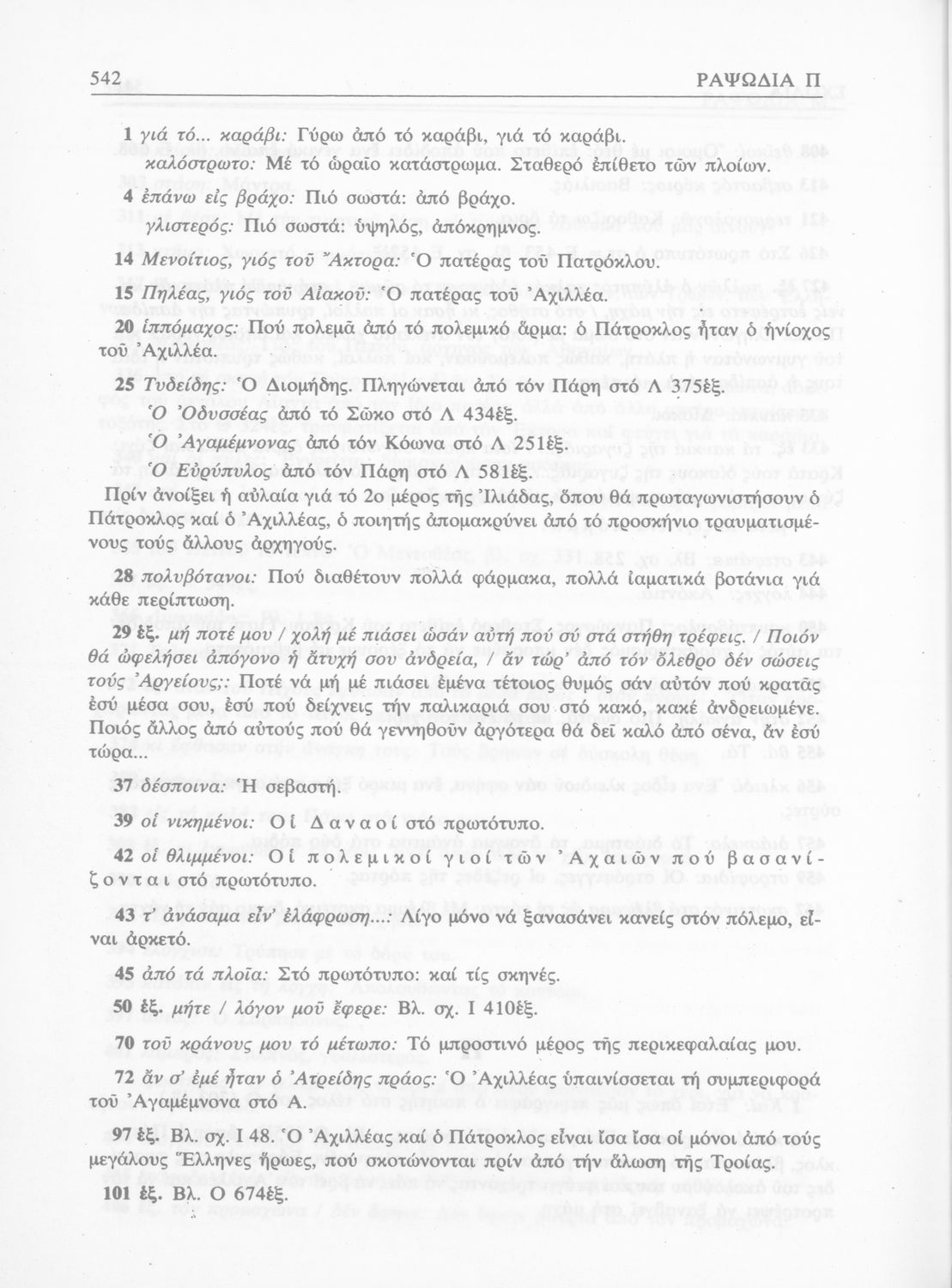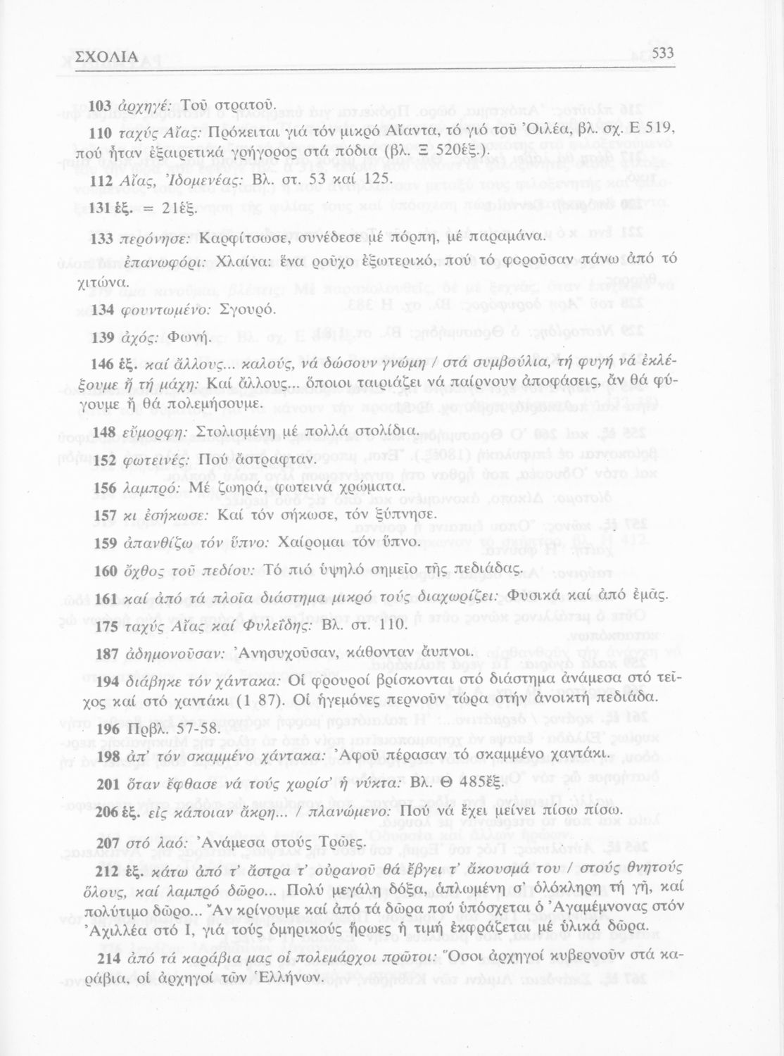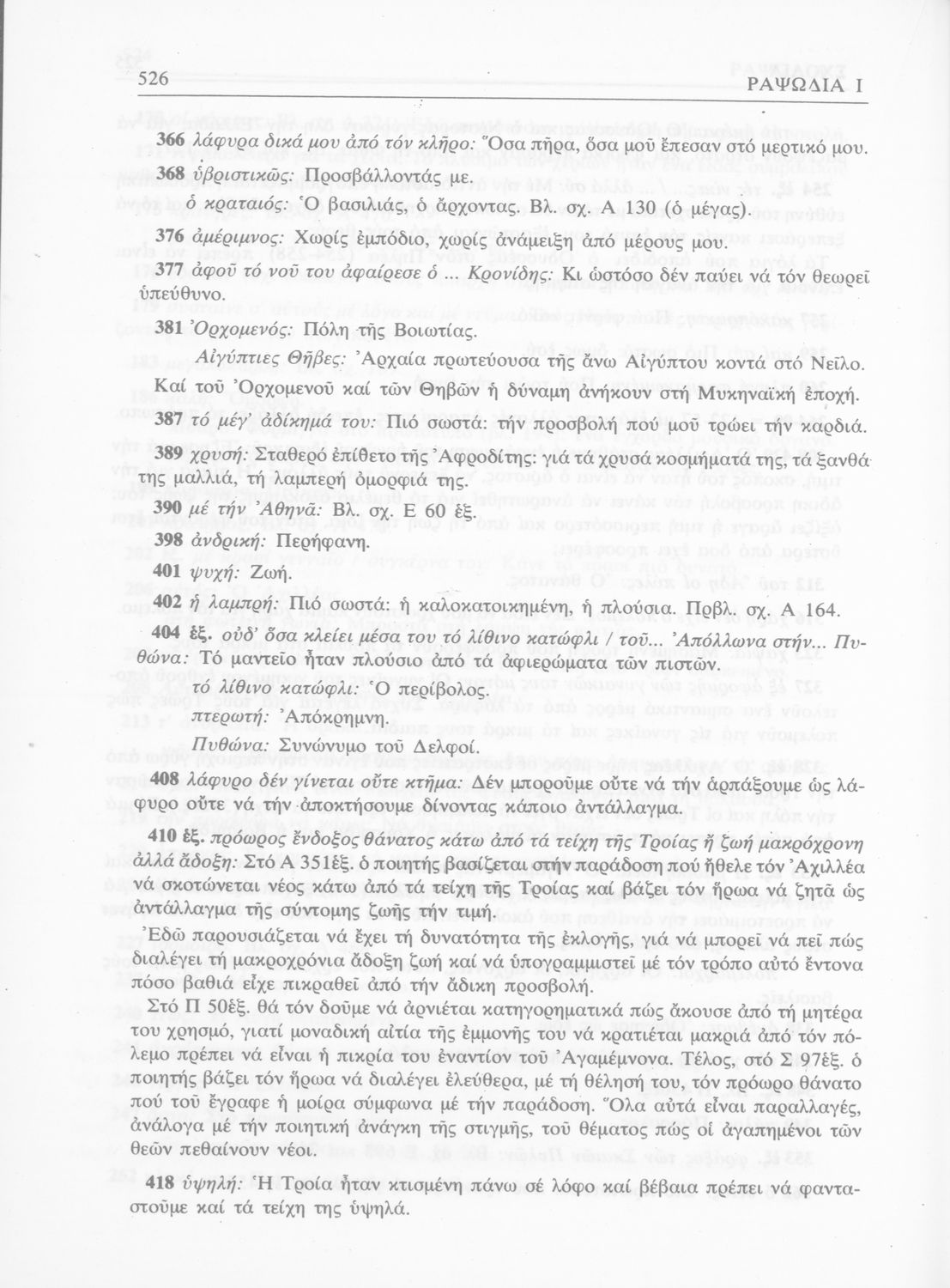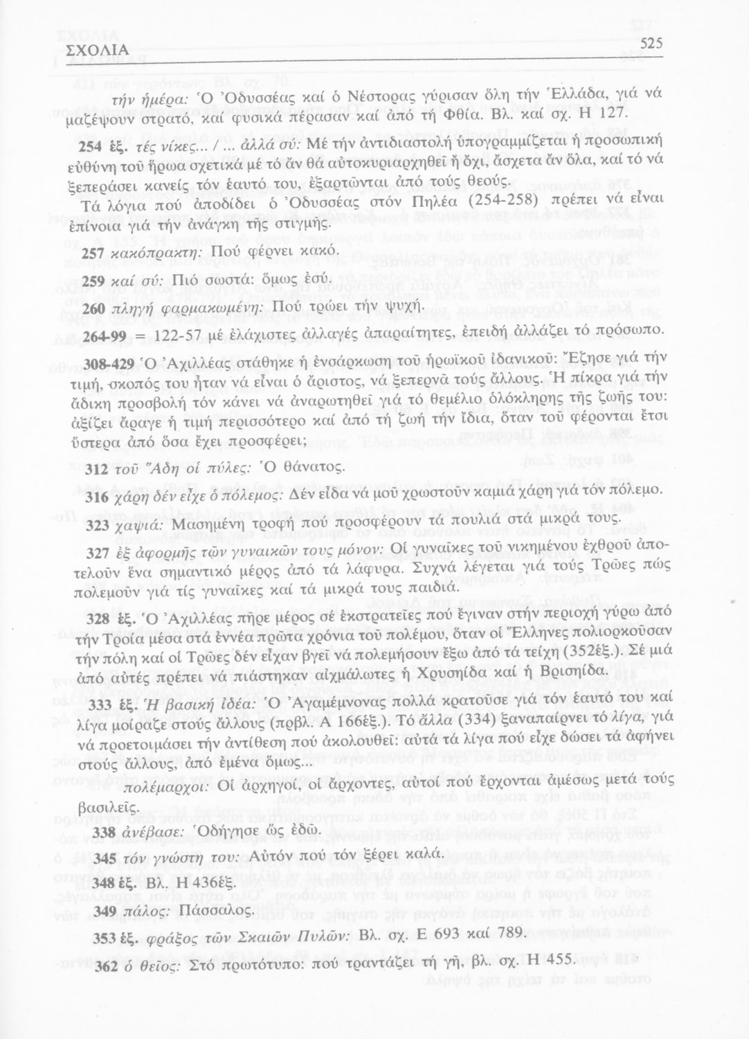 Μαθητικό βοήθημα του Ελληνικού Σχολείου, των Παρθεναγωγείων και του Γυμνασίου για το μάθημα των Αρχαίων Ελληνικών. Περιέχει τις ραψωδίες Ο, Π, Ρ, Σ, Τ, Χ, ψ, Ω από το πρωτότυπο με σχόλια και ερμηνευτικές ...