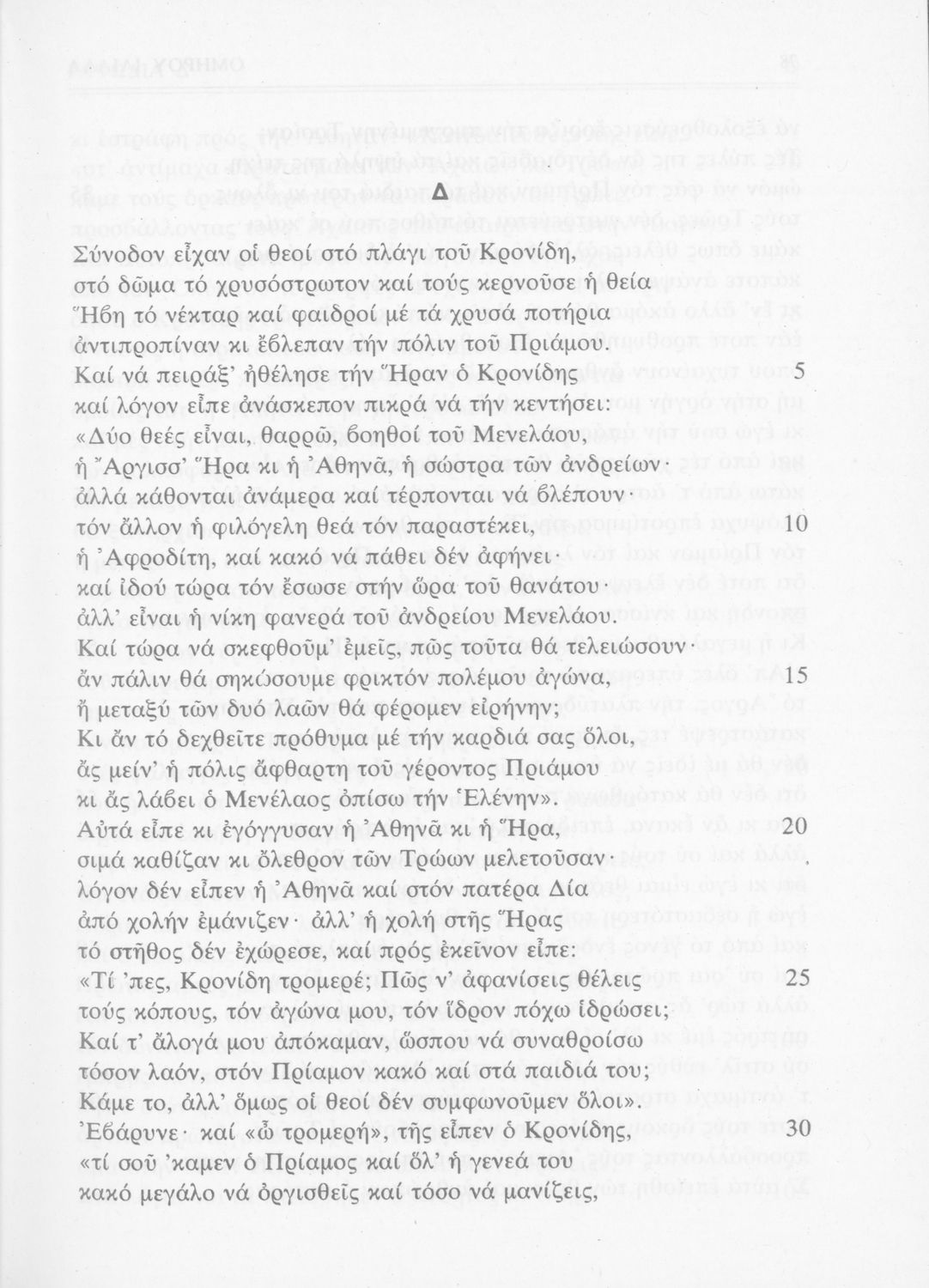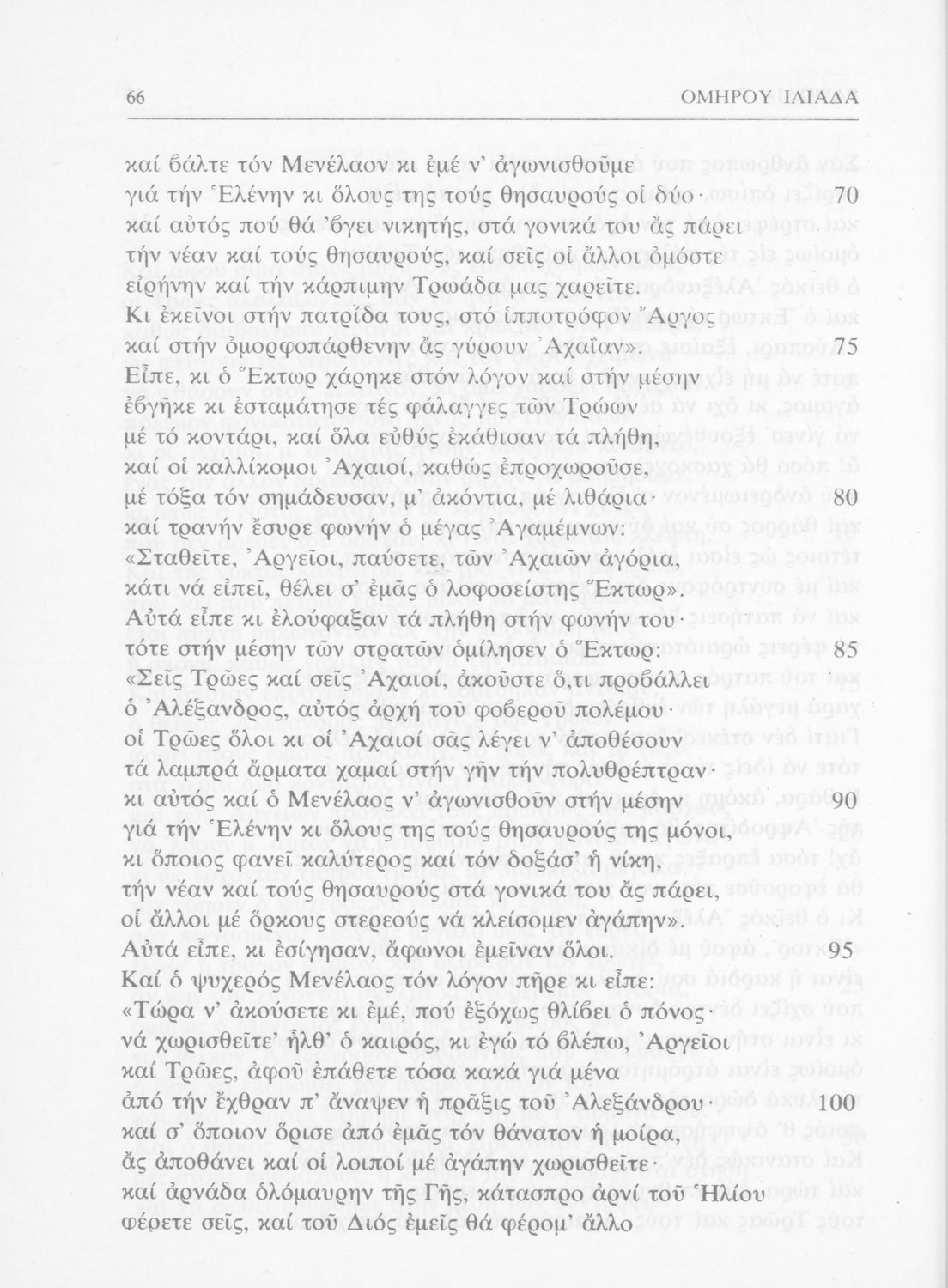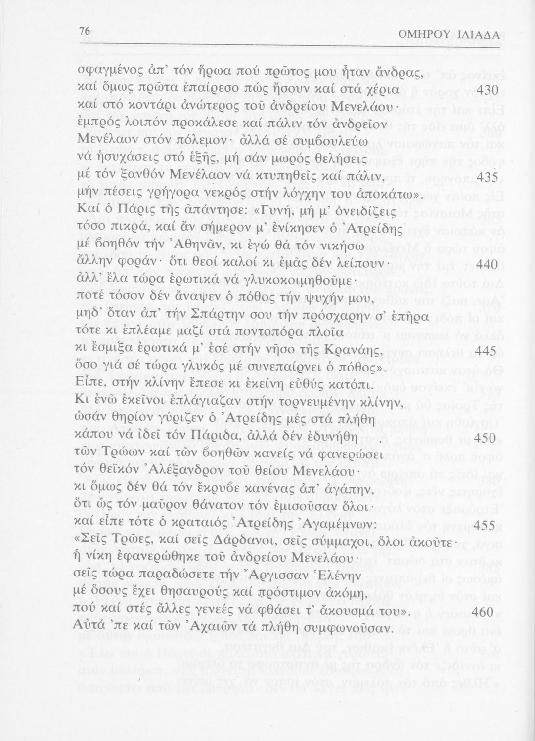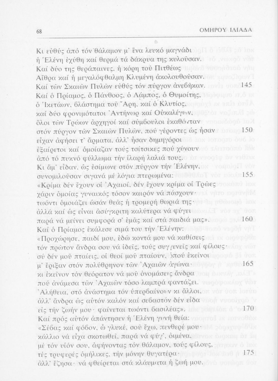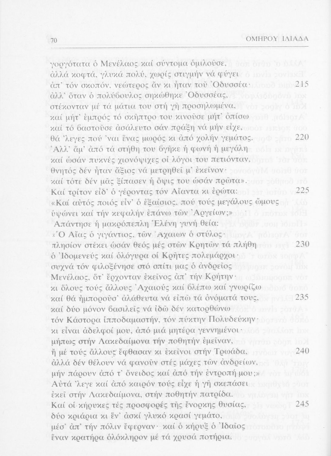 Σχολικό εγχειρίδιο Αρχαίων Ελληνικών. Το βιβλίο περιλαμβάνει εισαγωγή σχετικά με τις διαφορές Οδύσσειας και Ιλιάδας, το περιεχόμενο της Ιλιάδας, το ομηρικό πρόβλημα και την επίδραση των ομηρικών επών στον Ελληνικό και Δυτικό πολιτισμό. Ακολουθεί η Ιλιάδα του Ομήρου σε μετάφραση του Ιάκωβου Πολυλά και σχετικά σχόλια. Η εισαγωγή και τα ερμηνευτικά σχόλια έγιναν από την Ελένη Ι. Κακριδή.