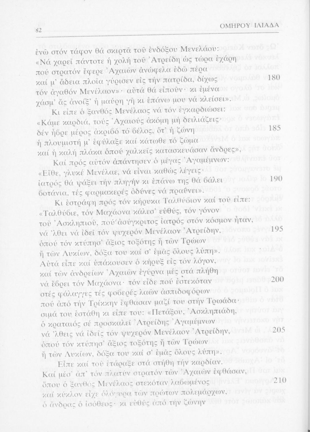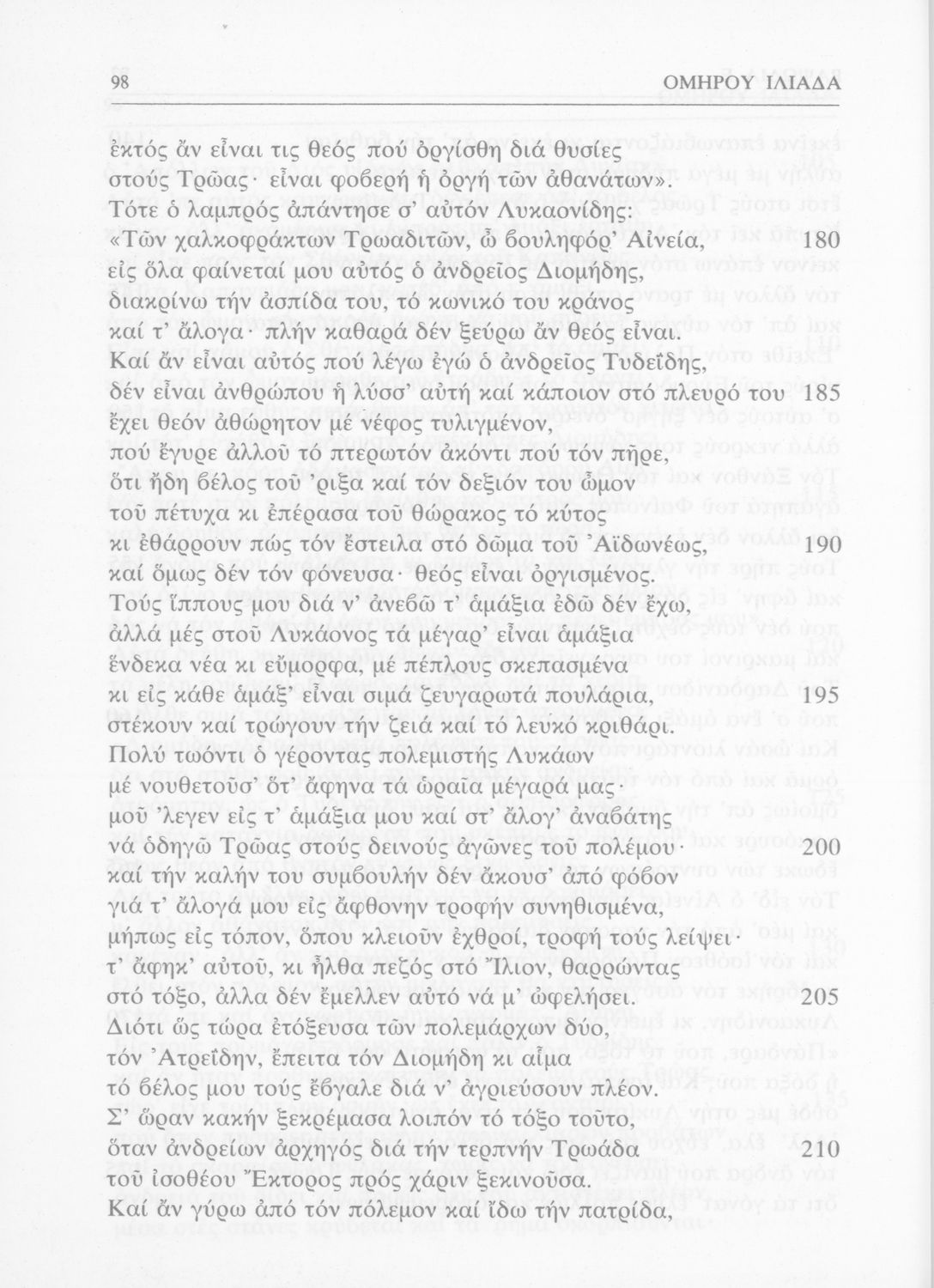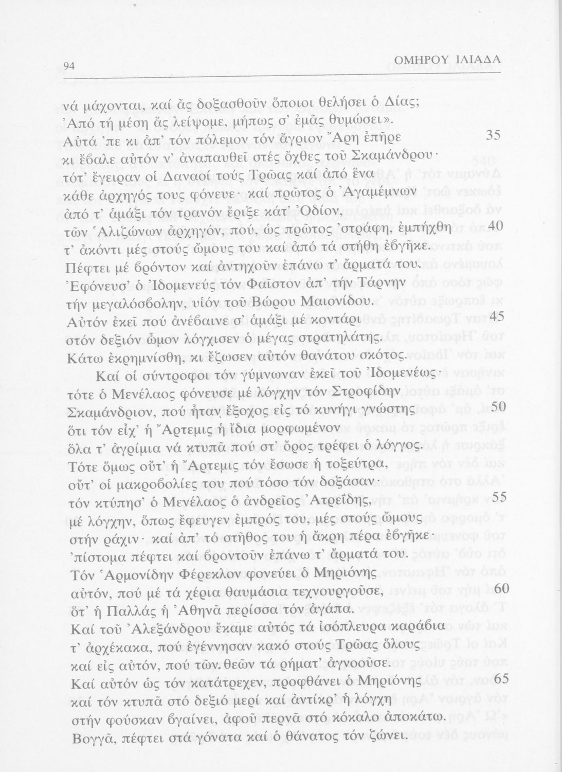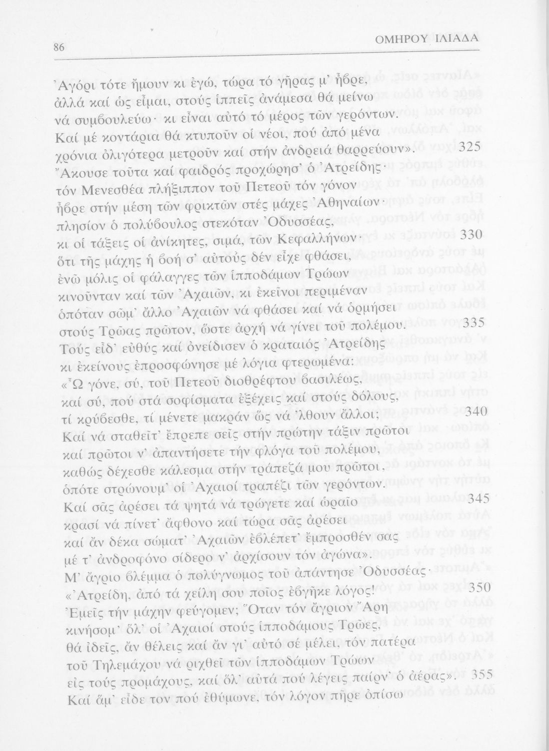 Σχολικό εγχειρίδιο της Δευτεροβάθμιας Εκπαίδευσης για το μάθημα των Αρχαίων Ελληνικών. Πρόκειται για το κείμενο της Ιλιάδας μεταφρασμένο, με πραγματολογικές παρατηρήσεις. Στο τέλος περιλαμβάνει λεξιλόγιο.