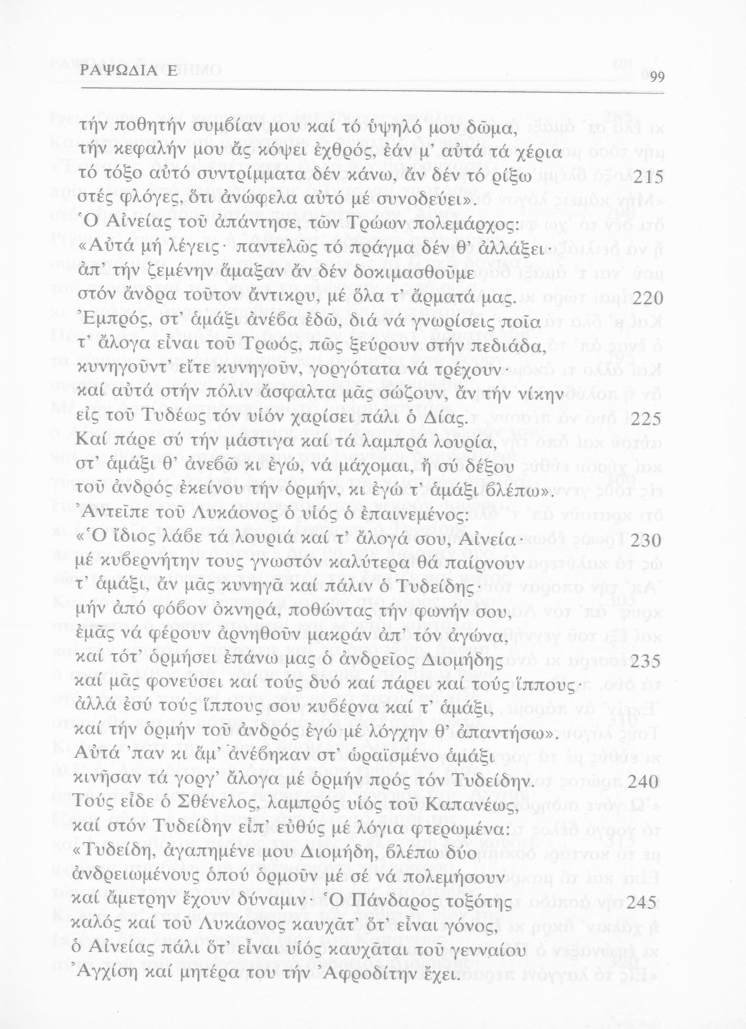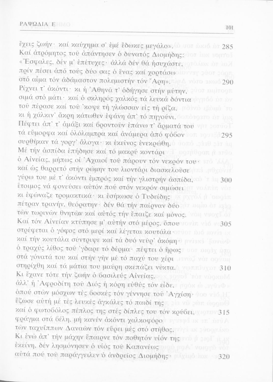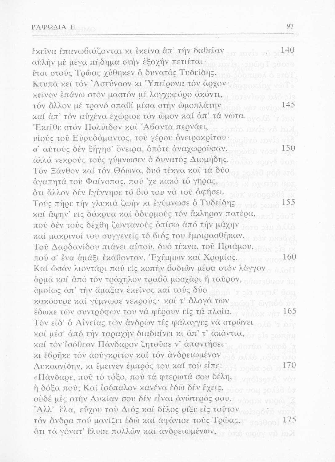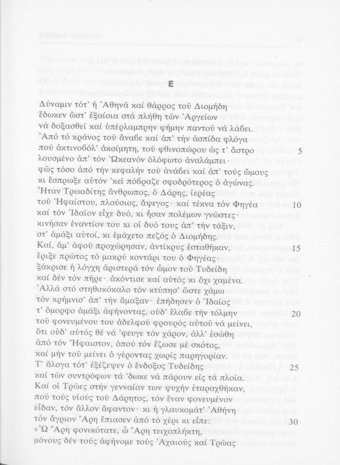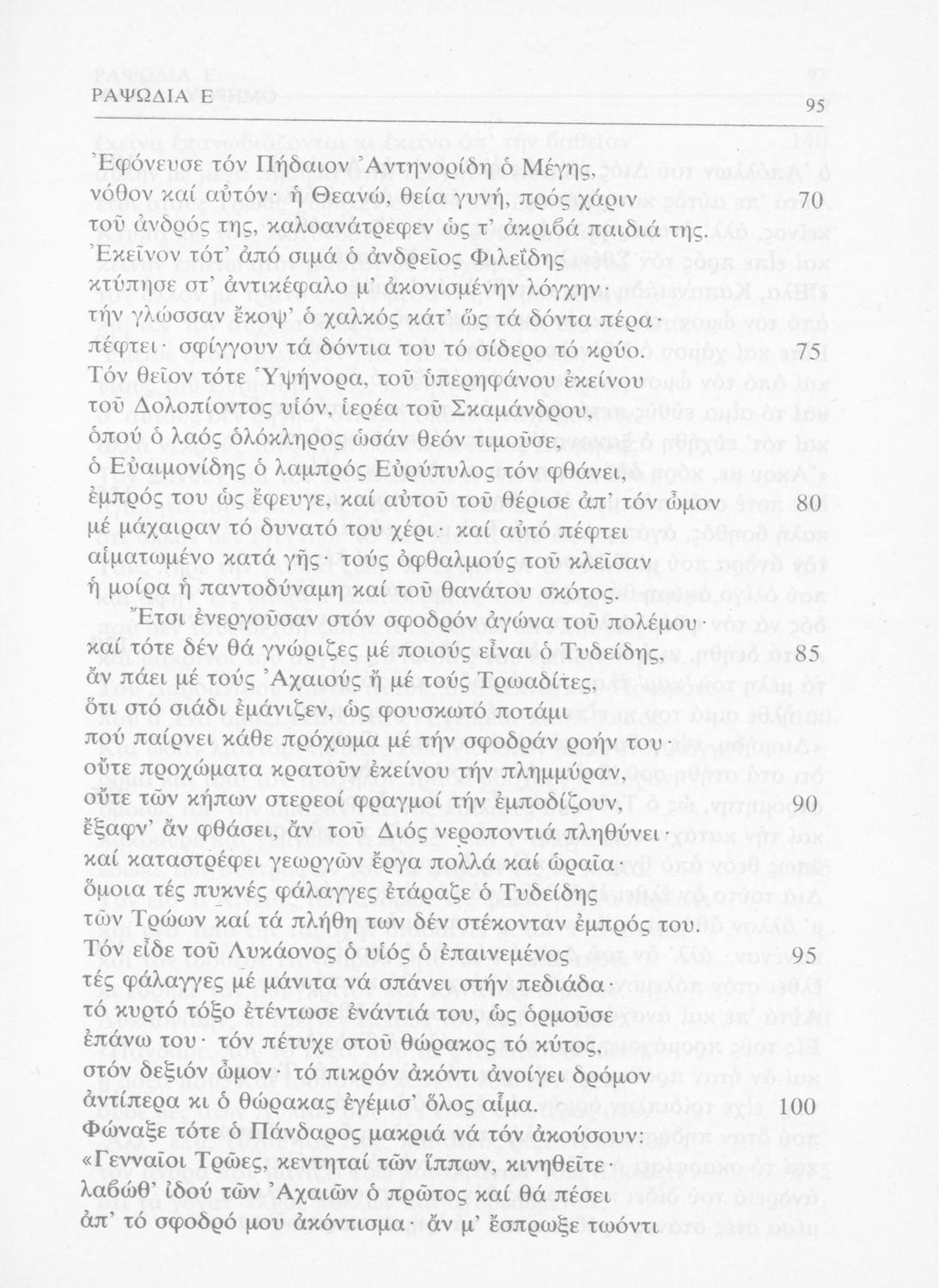 Σχολικό εγχειρίδιο Ε' Γυμνασίου για το μάθημα των Αρχαίων Ελληνικών. Περιλαμβάνει αποσπάσματα από ραψωδίες της Ιλιάδας, ερμηνευτικά και πραγματολογικά σχόλια και λεξιλογικές παρατηρήσεις.