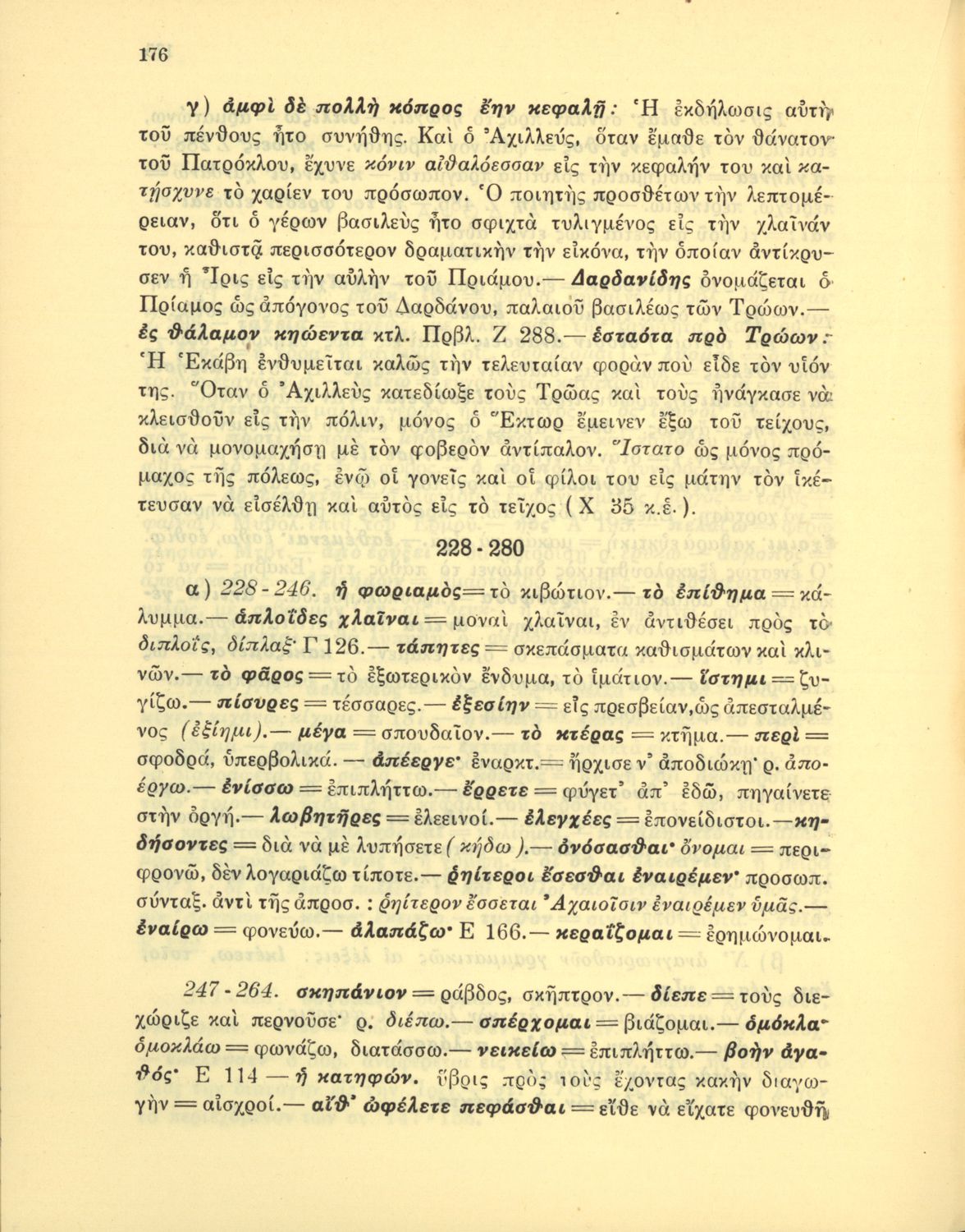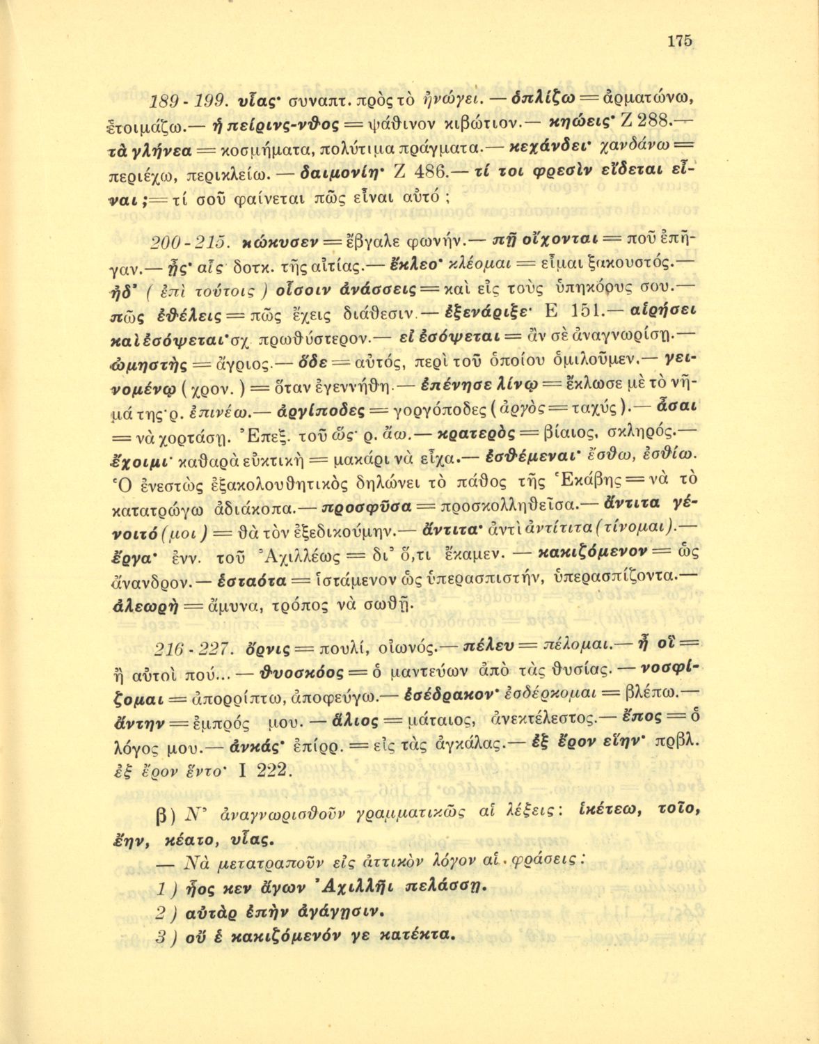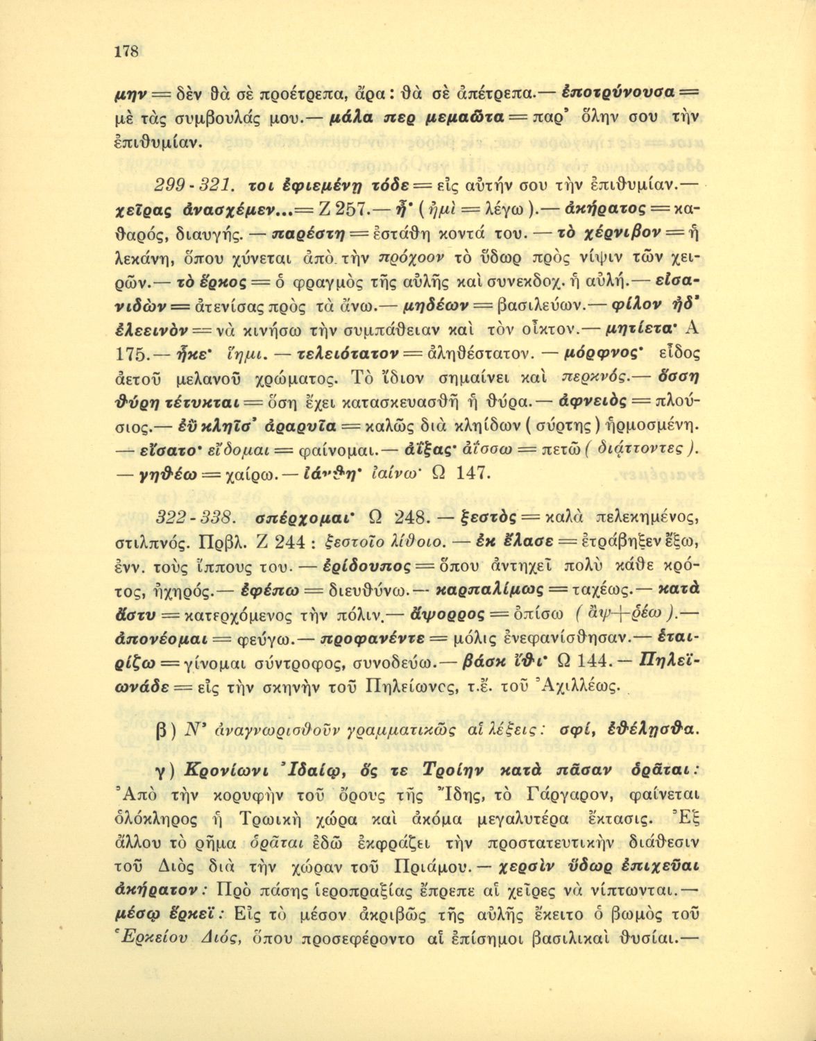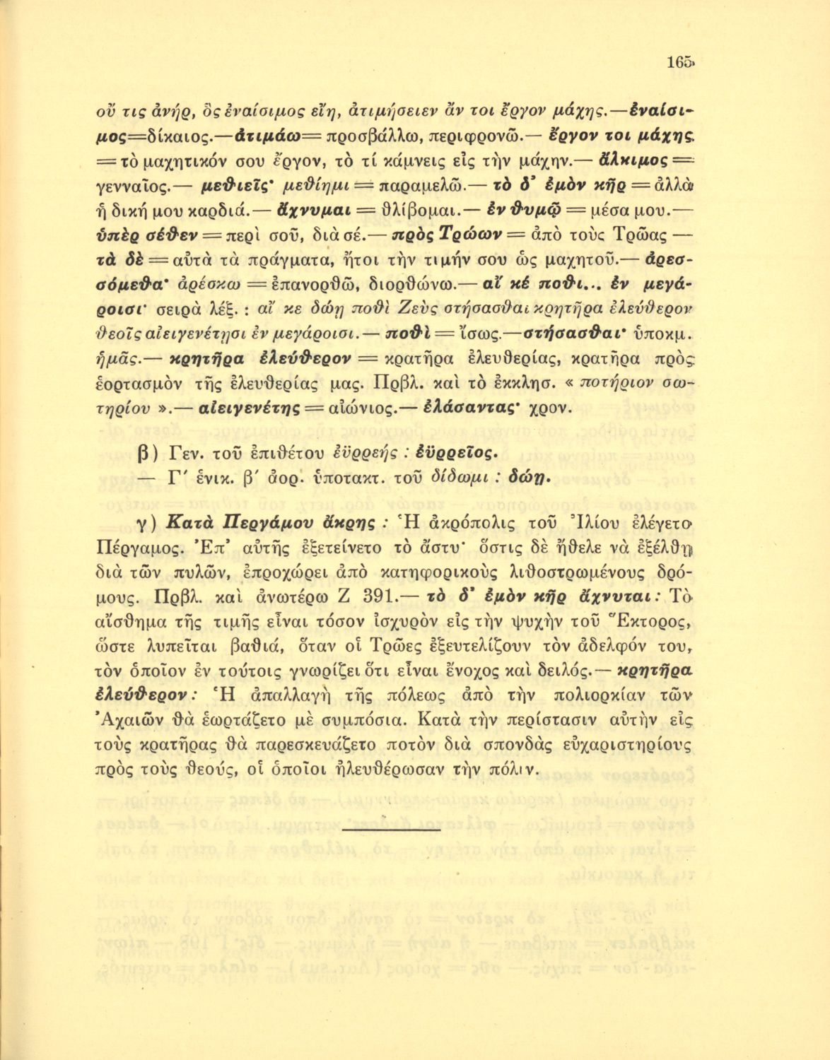 Μαθητικό βοήθημα του Ελληνικού Σχολείου, των Παρθεναγωγείων και του Γυμνασίου για το μάθημα των Αρχαίων Ελληνικών. Περιέχει τις ραψωδίες Ο, Π, Ρ, Σ, Τ, Χ, ψ, Ω από το πρωτότυπο με σχόλια και ερμηνευτικές ...