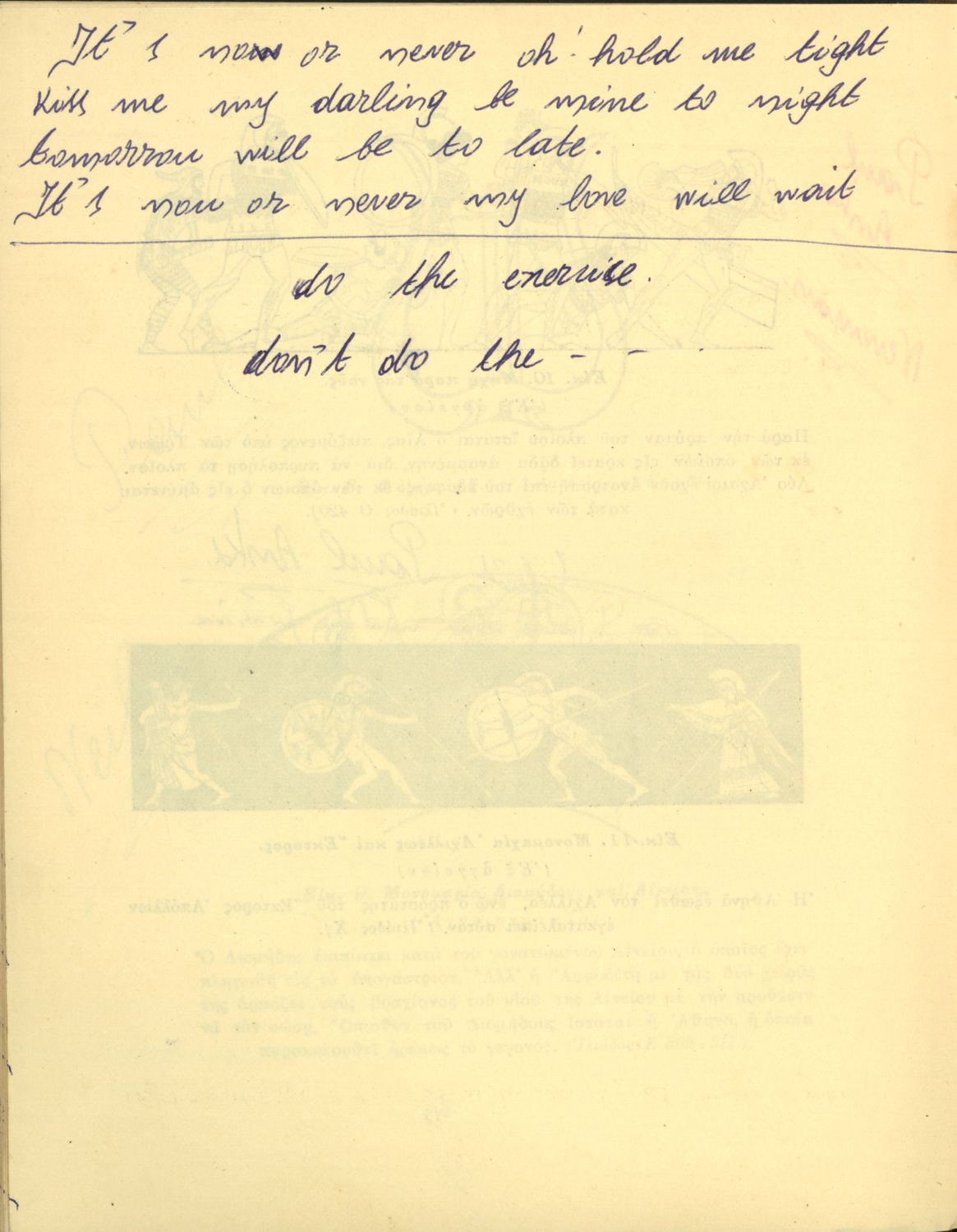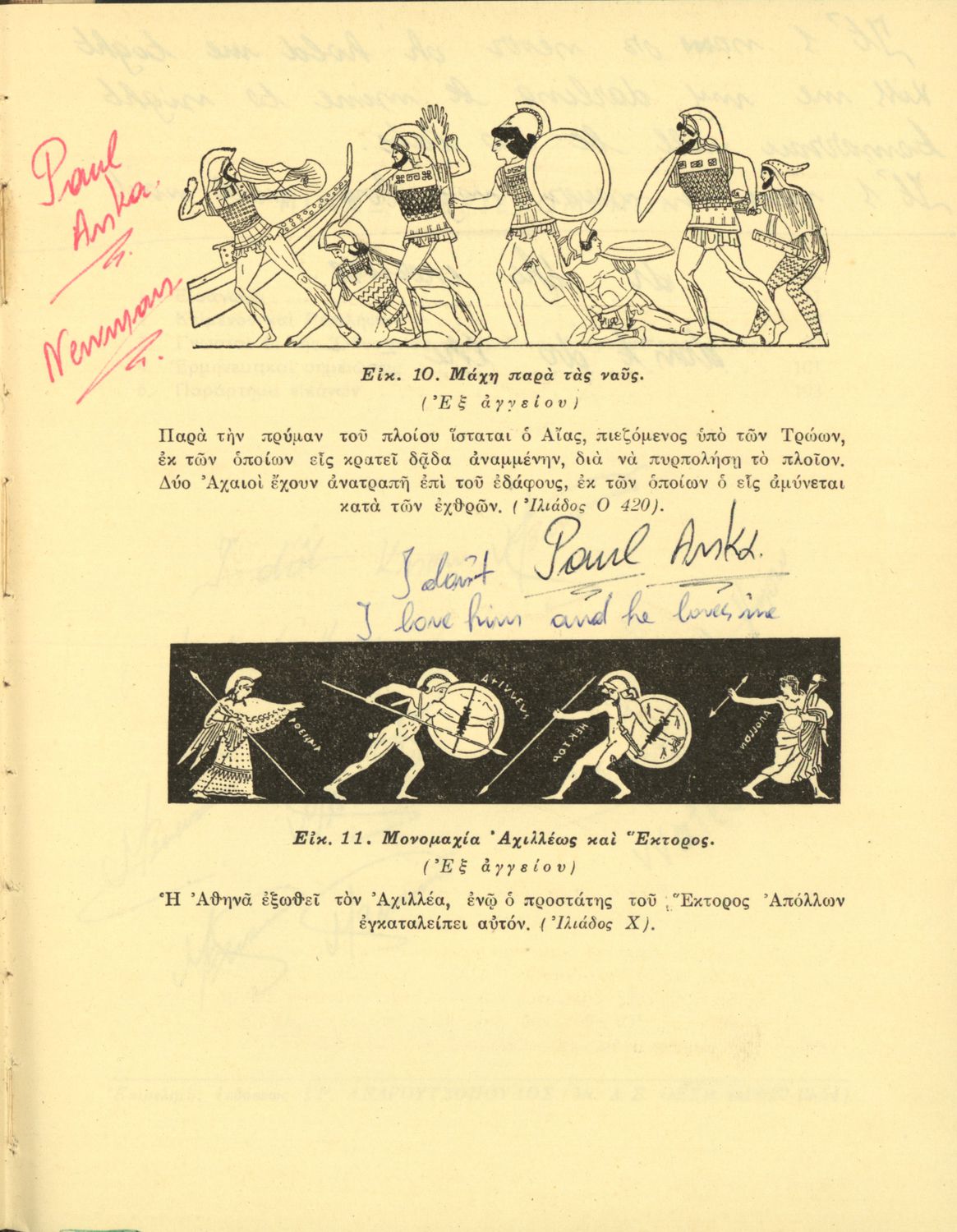 Σχολικό εγχειρίδιο του Γυμνασίου για το μάθημα των Αρχαίων Ελληνικών. Περιέχει ραψωδίες της Ιλιάδα στο αρχαίο κείμενο. Επίσης, περιλαμβάνει τη μετάφραση, τα ερμηνευτικά, πραγματολογικά σχόλια και τις λεξιλογικές παρατηρήσεις των συγγραφέων. Ο συγγραφέας ήταν Καθηγητής στο Κολέγιο Αθηνών. Η συγγραφέας ήταν Καθηγήτρια Φιλόλογος. Σχόλια και στιχάκια του Paul Anka από τη μαθήτρια στο περιθώριο του βιβλίου.