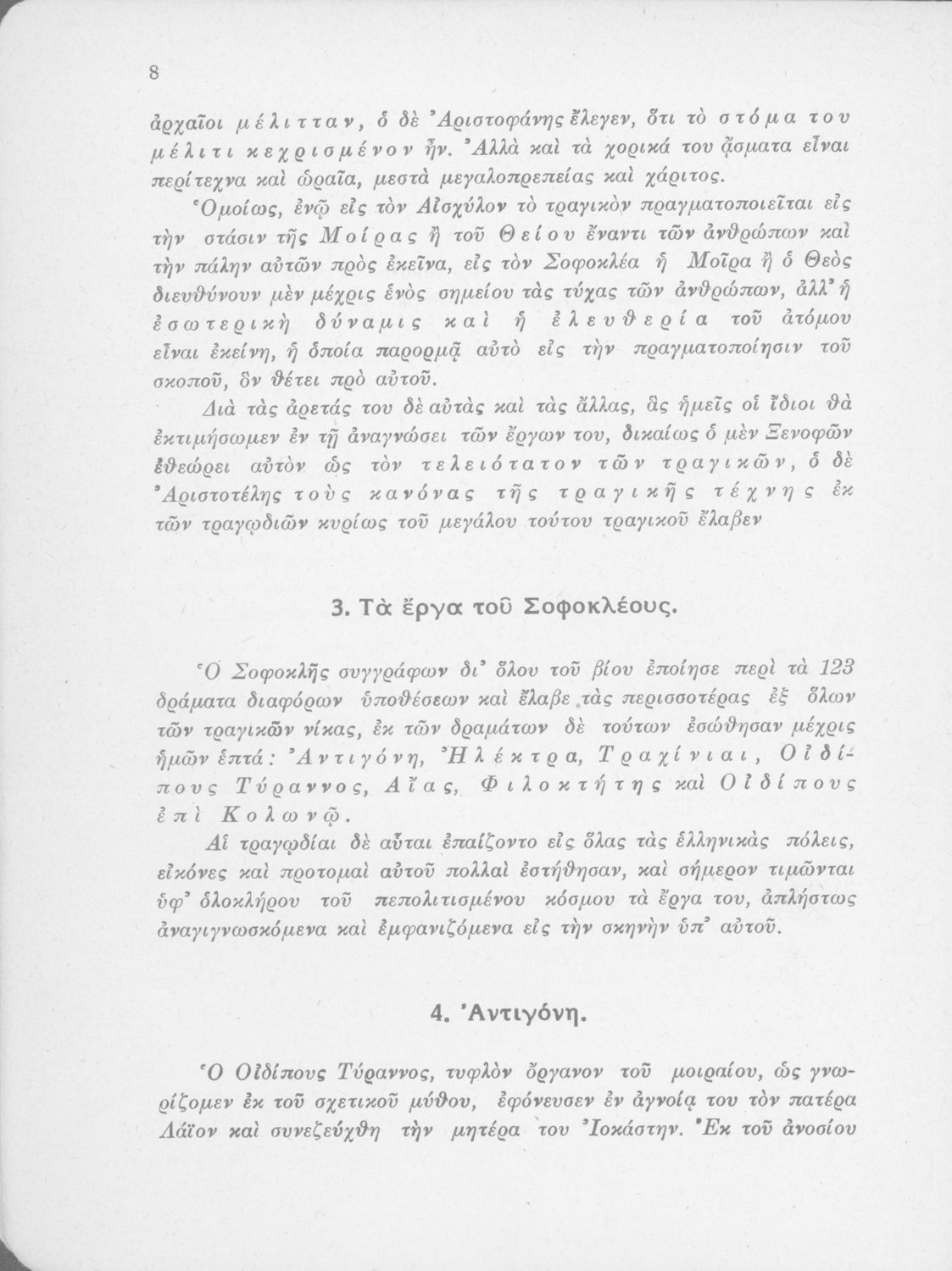 Σχολικό εγχειρίδιο Αρχαίων Ελληνικών της ΣΤ΄ Γυμνασίου. Το βιβλίο παρουσιάζει το έργο του Σοφοκλή, Αντιγόνη. Στο δεύτερο μέρος περιλαμβάνει λεξιλογικά και ερμηνευτικά σχόλια.
