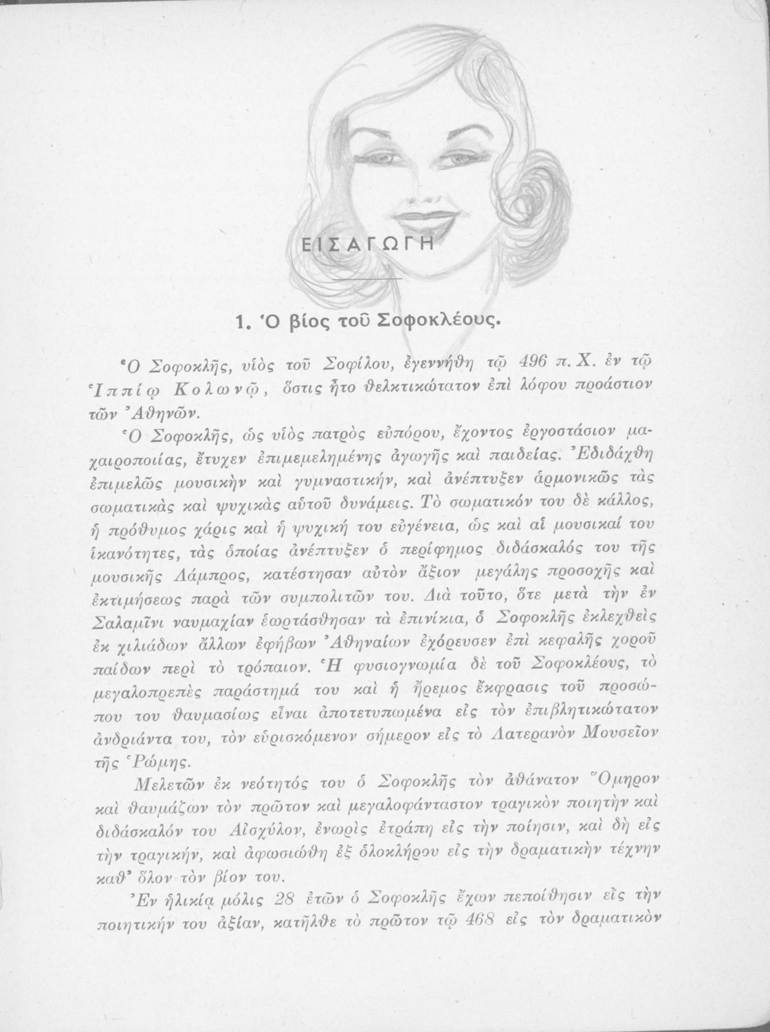 Σχολικό εγχειρίδιο Αρχαίων Ελληνικών για την ΣΤ΄ τάξη των Εξαταξίων Γυμνασίων που περιλαμβάνει εισαγωγή στην αρχαία ελληνική τραγωδία, βιογραφικά στοιχεία του Σοφοκλή, εισαγωγή στο έργο, και κείμενο.