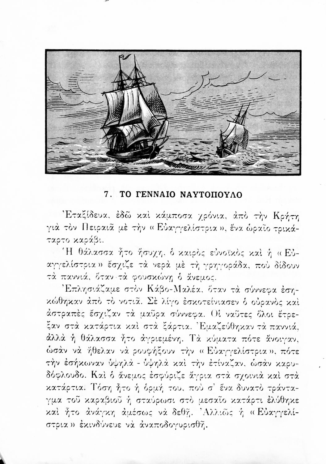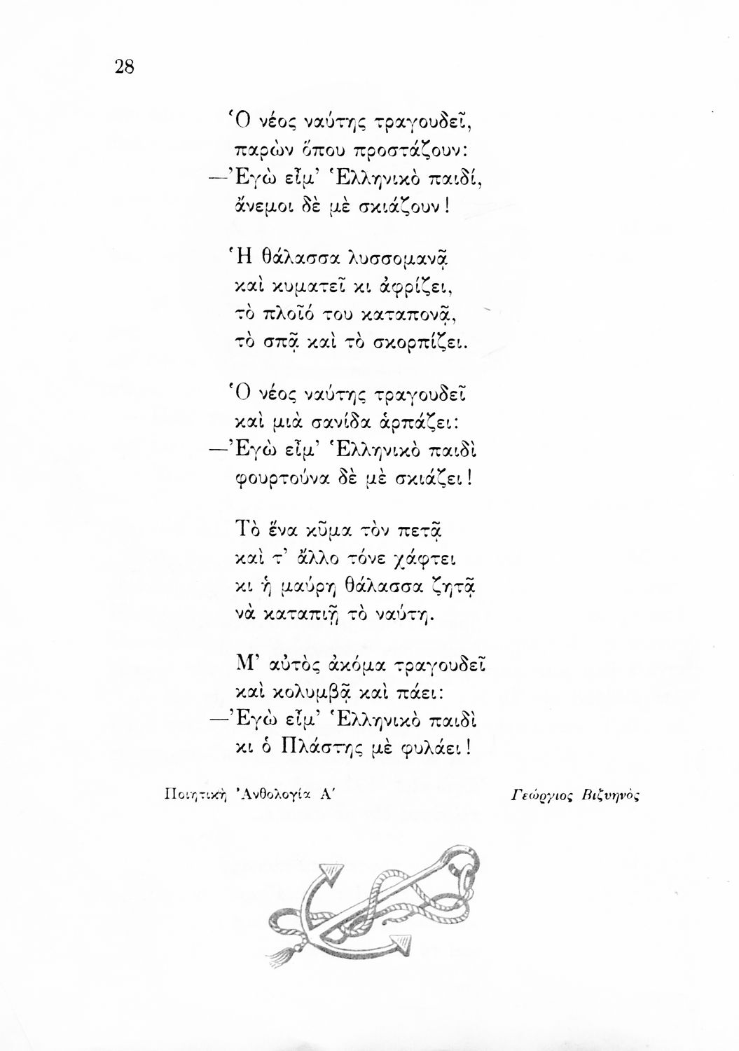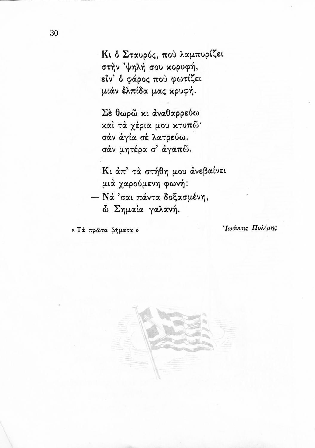 Αναγνωστικό για την Δ΄ τάξη του Δημοτικού. Περιλαμβάνει ένα κείμενο στο οποίο παρεμβάλλονται ποιήματα δημοτικά και Ελλήνων ποιητών.