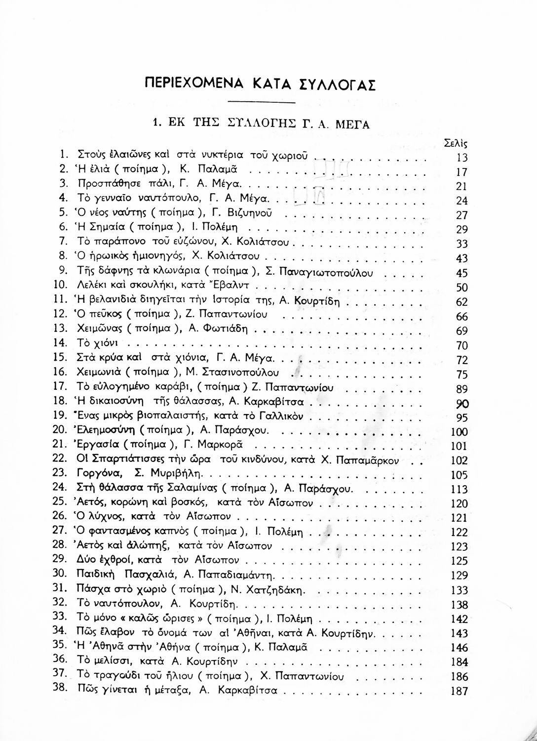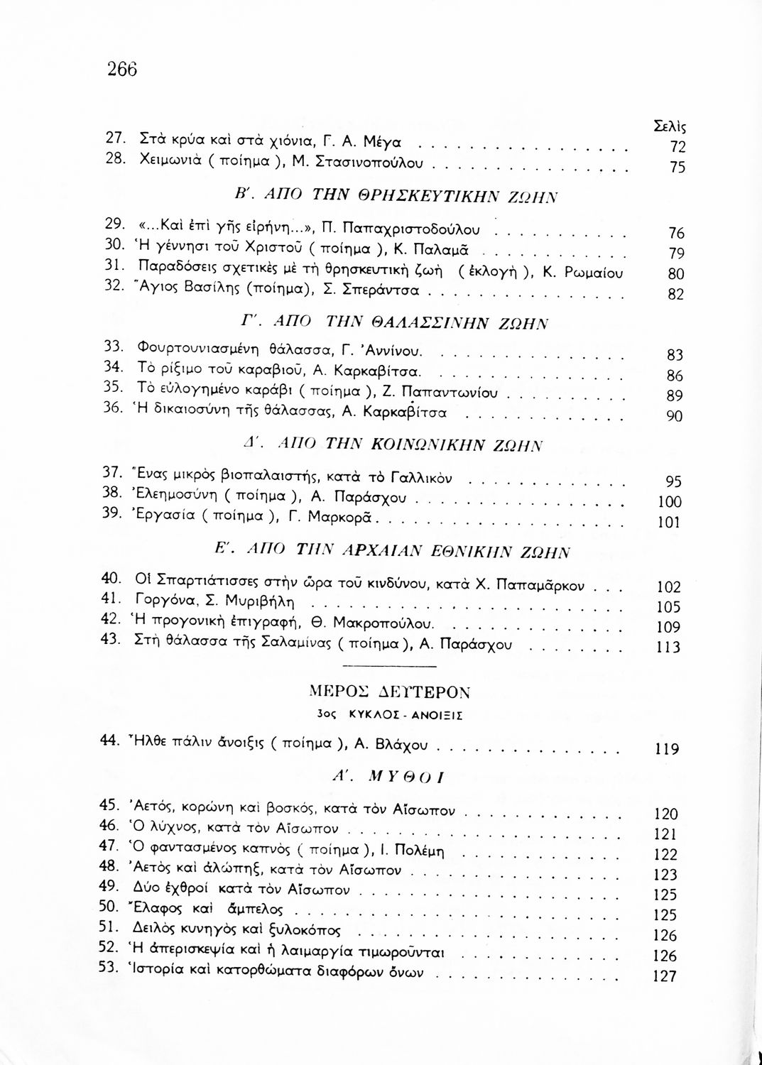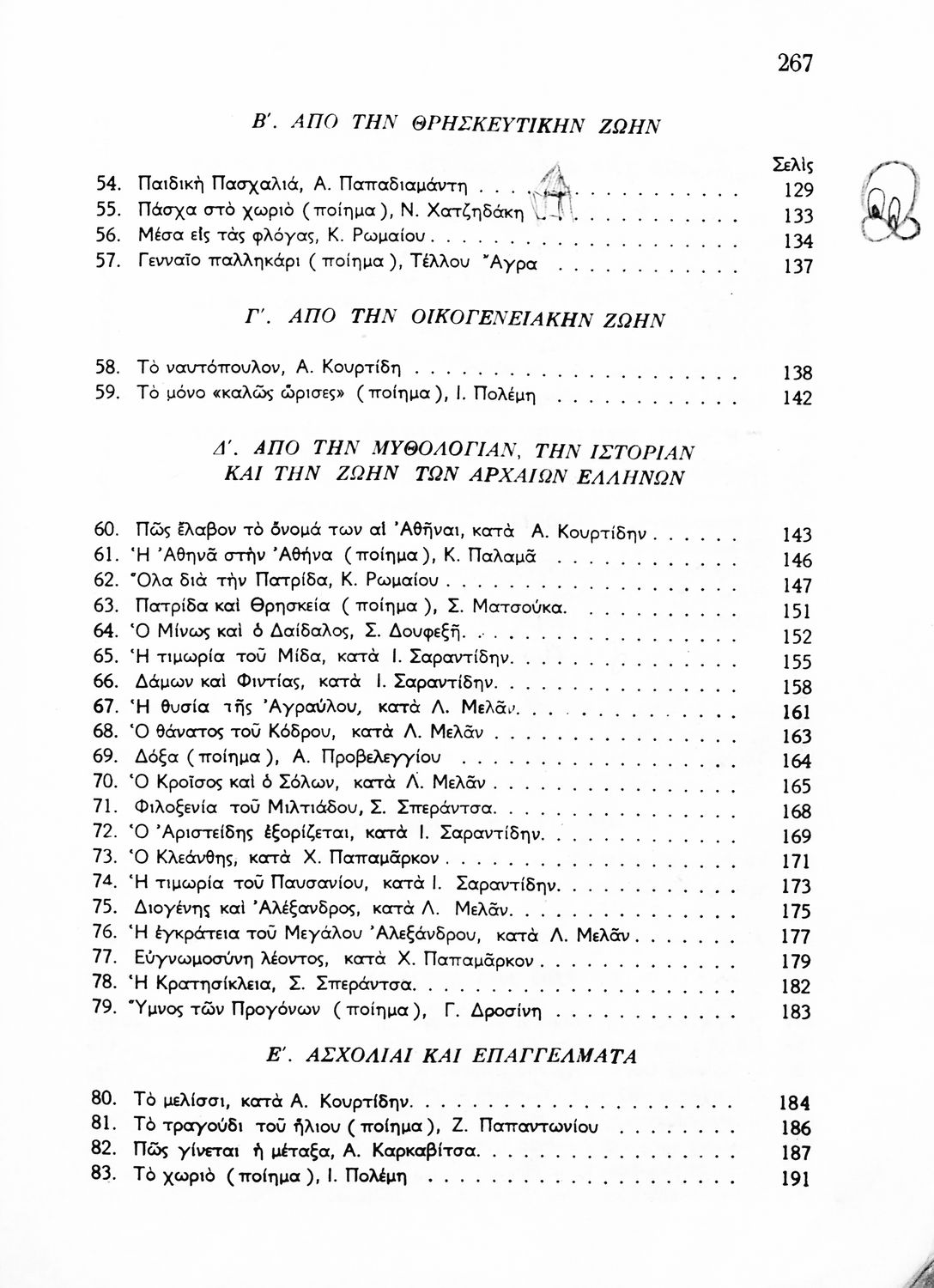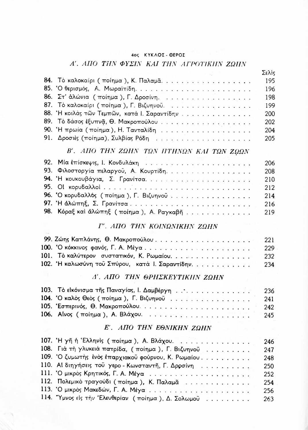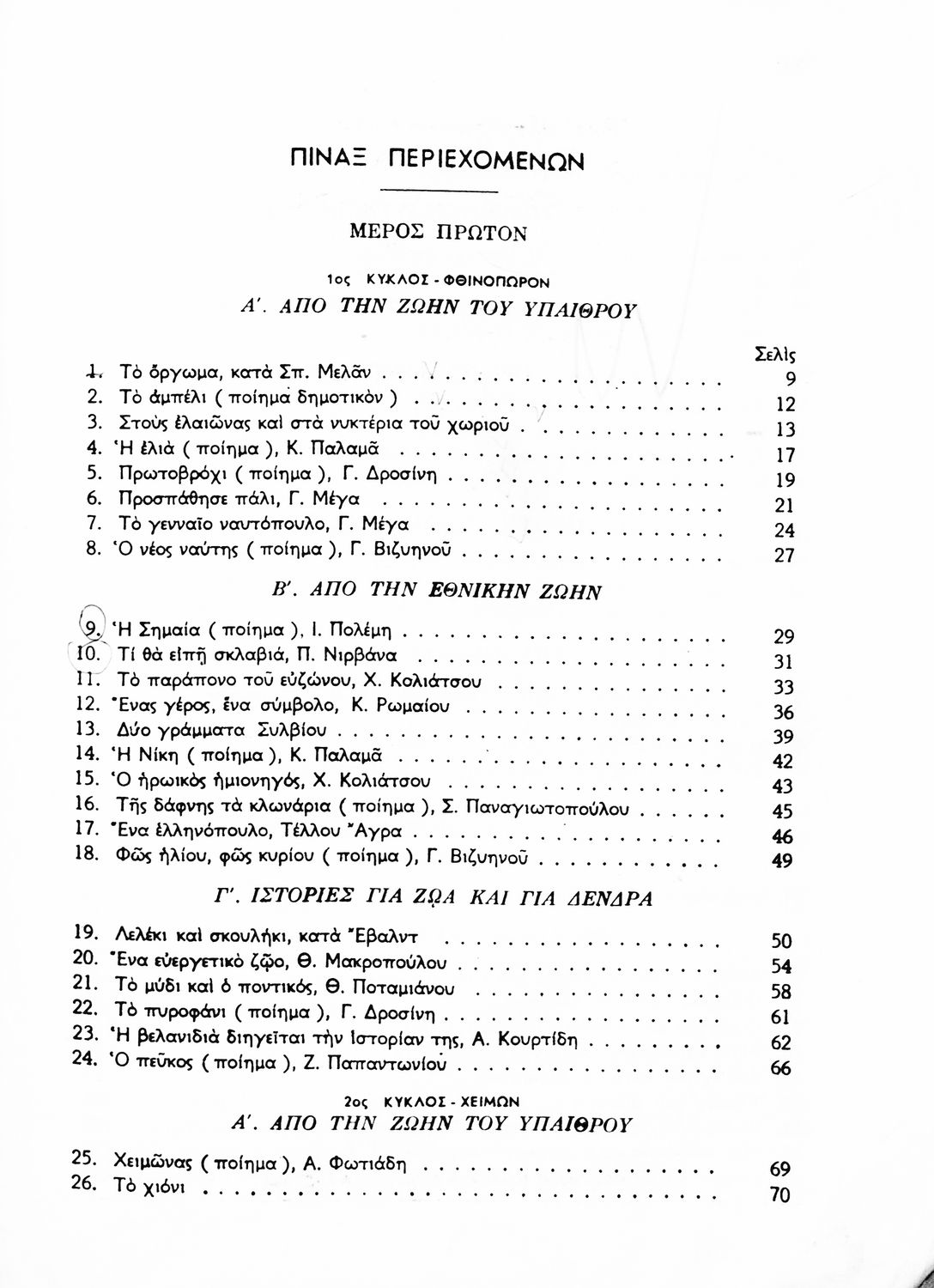 Αναγνωστικό Δ΄ Δημοτικού που περιέχει πεζά και ποιήματα με περιεχόμενο διδακτικό και ηθικοπλαστικό εμπνευσμένα από την ελληνική ιστορία και μυθολογία, και την αγροτική και κοινωνική ζωή.