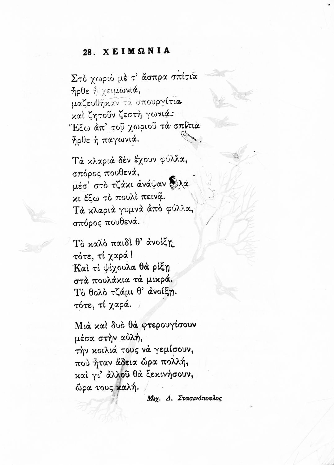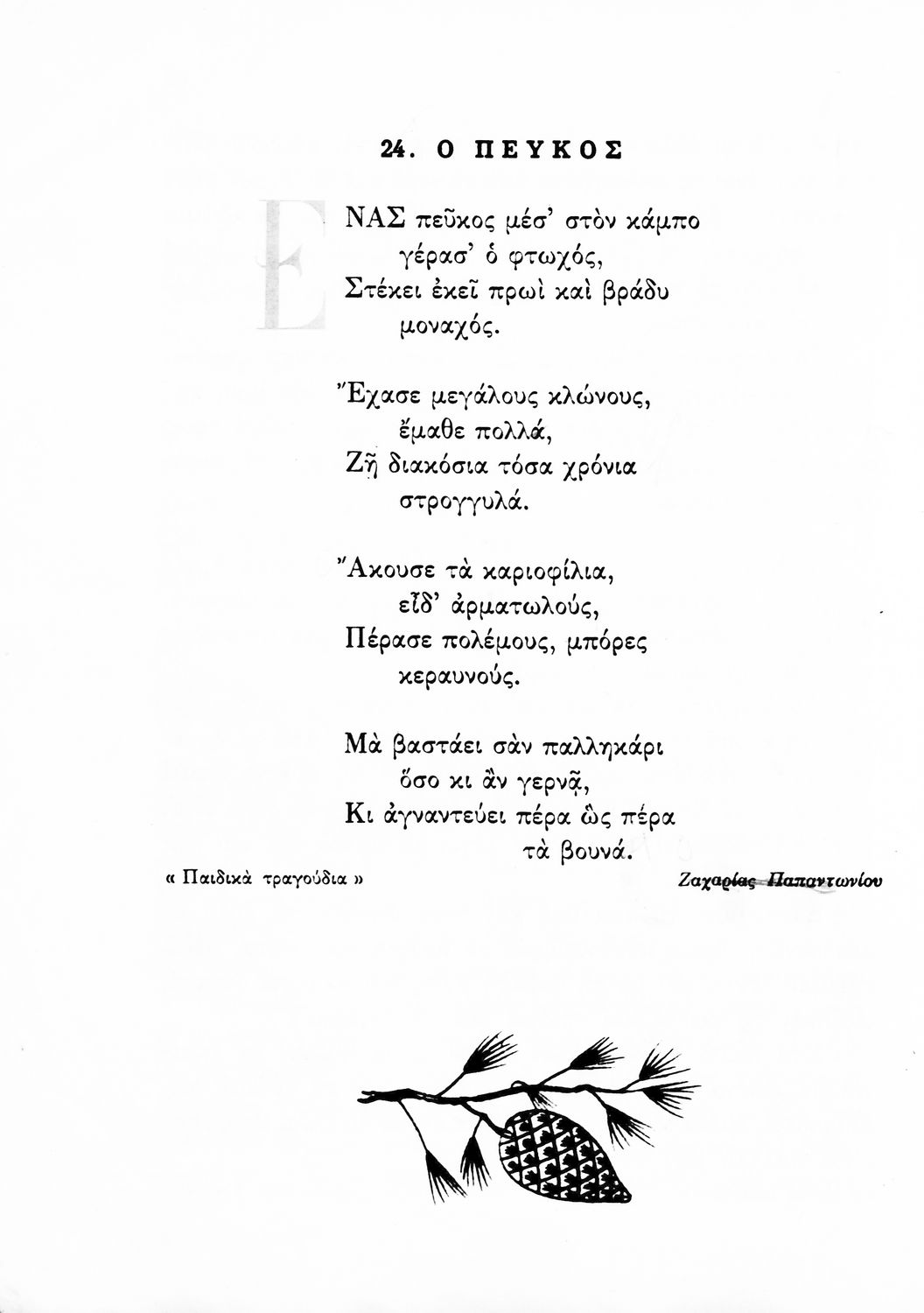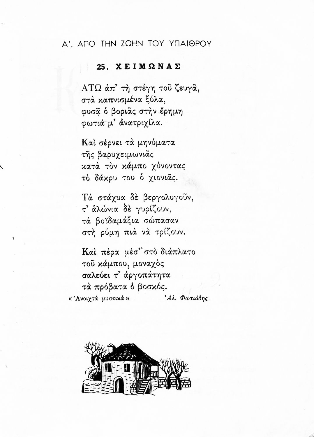 Αναγνωστικό για την Δ΄ τάξη του Δημοτικού. Περιλαμβάνει ένα κείμενο στο οποίο παρεμβάλλονται ποιήματα δημοτικά και Ελλήνων ποιητών.
