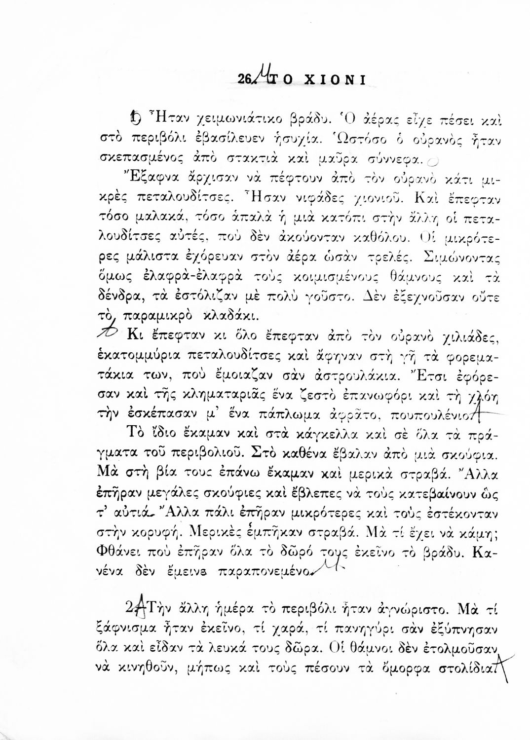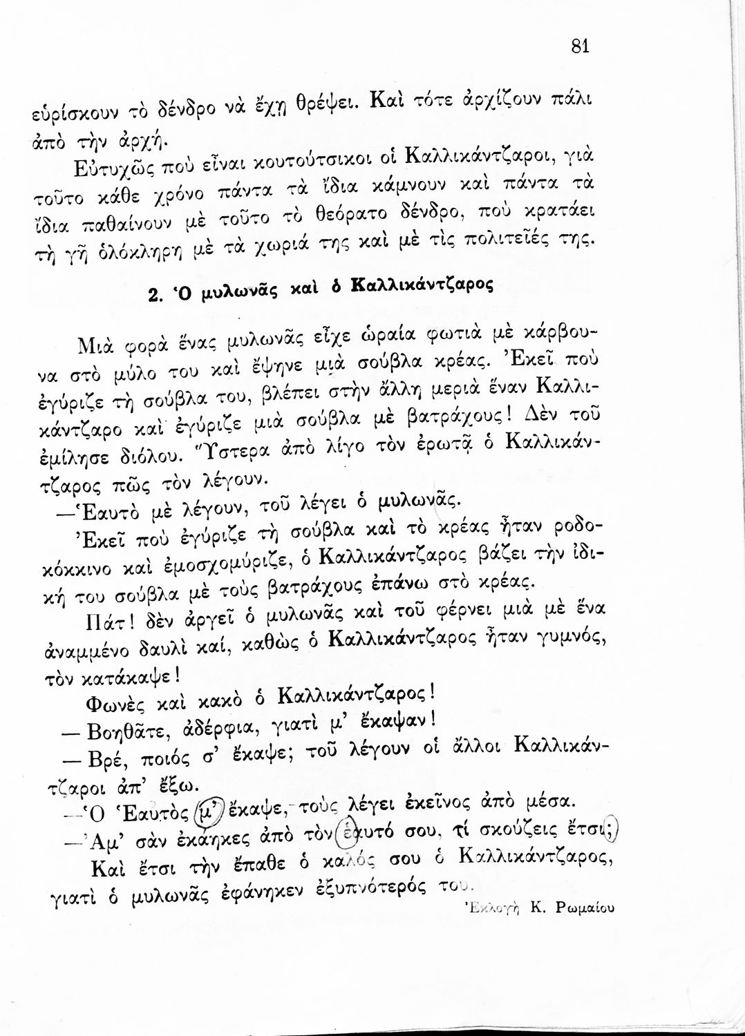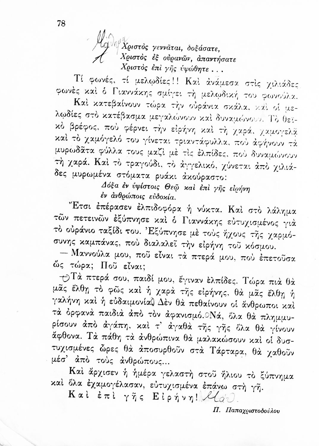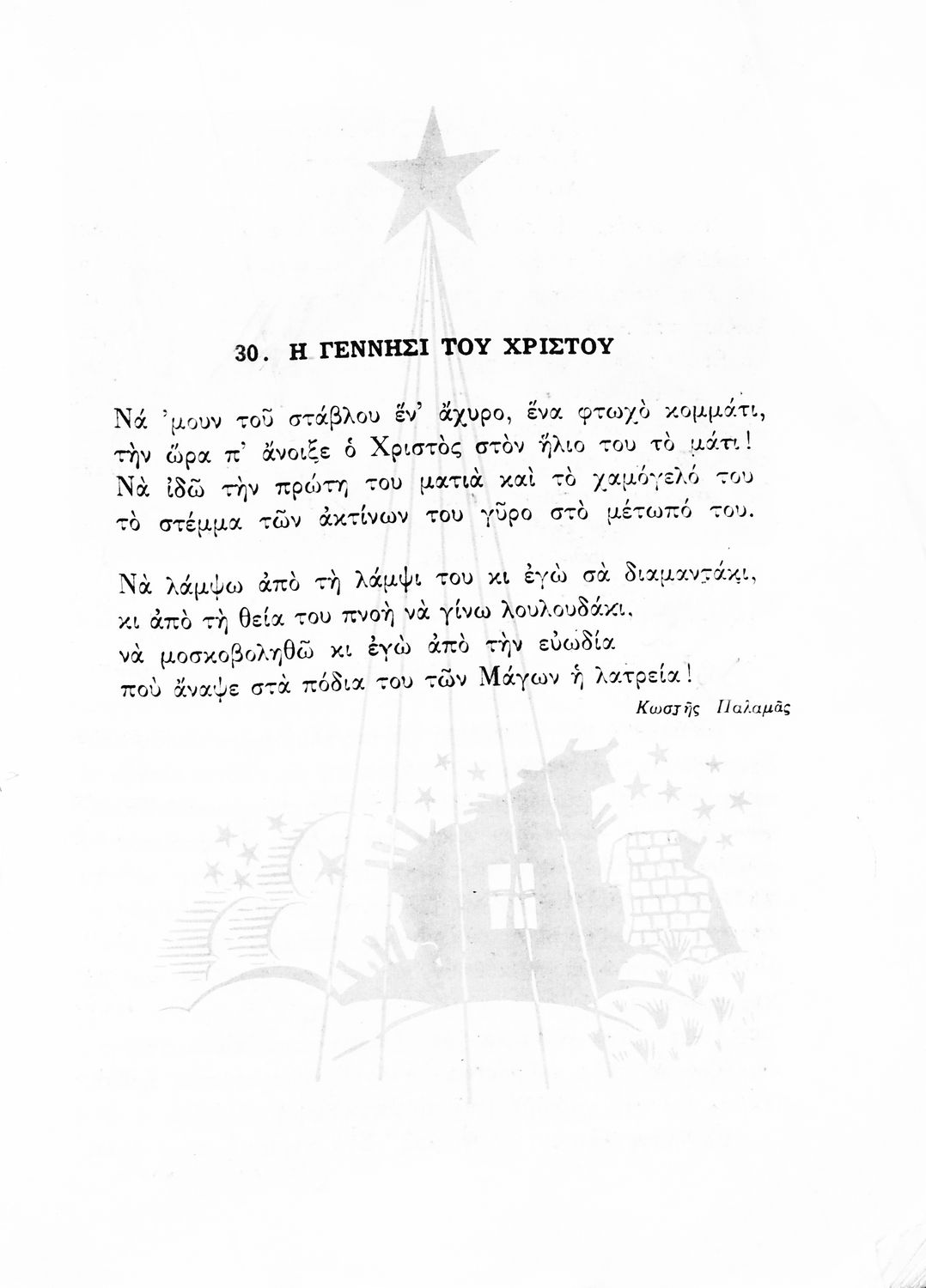 Αναγνωστικό για την Δ΄ τάξη του Δημοτικού. Περιλαμβάνει ένα κείμενο στο οποίο παρεμβάλλονται ποιήματα δημοτικά και Ελλήνων ποιητών.