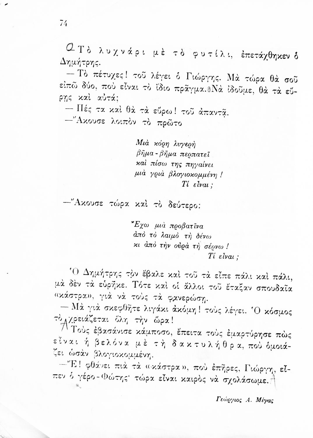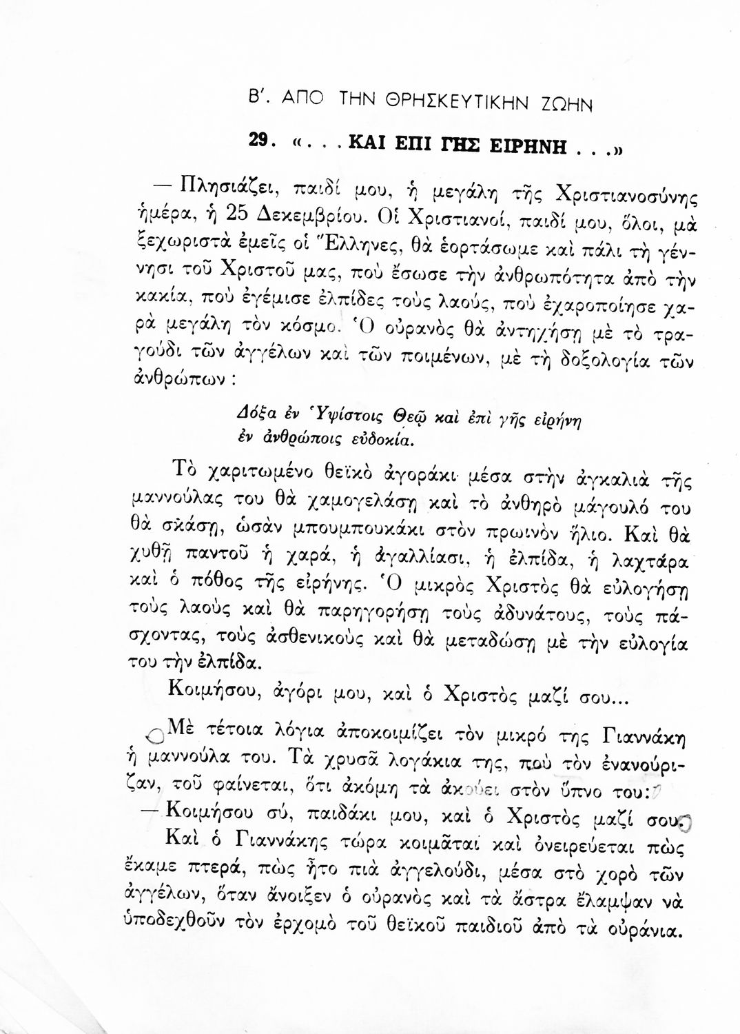 Αναγνωστικό Δ΄ Δημοτικού που περιέχει πεζά και ποιήματα με περιεχόμενο διδακτικό και ηθικοπλαστικό εμπνευσμένα από την ελληνική ιστορία και μυθολογία, και την αγροτική και κοινωνική ζωή.