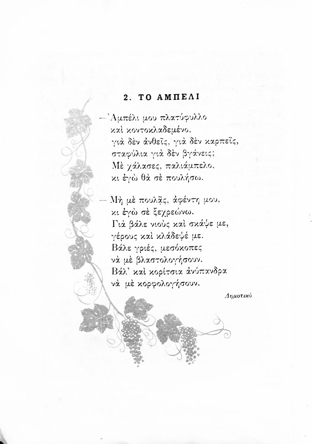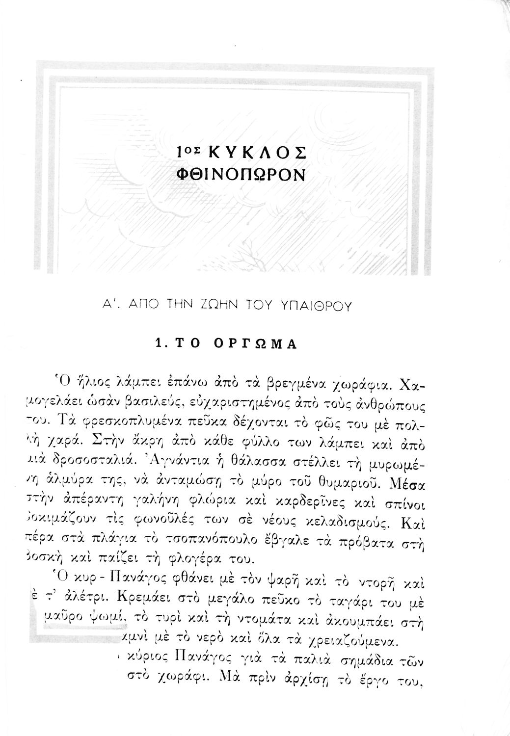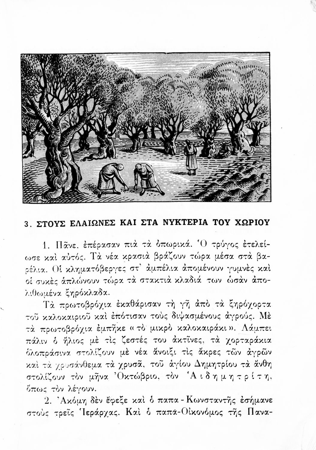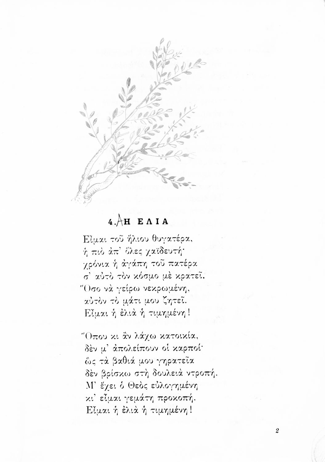 Αναγνωστικό Δ΄ Δημοτικού που περιέχει πεζά και ποιήματα με περιεχόμενο διδακτικό και ηθικοπλαστικό εμπνευσμένα από την ελληνική ιστορία και μυθολογία, και την αγροτική και κοινωνική ζωή.