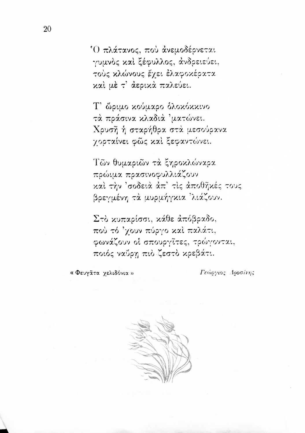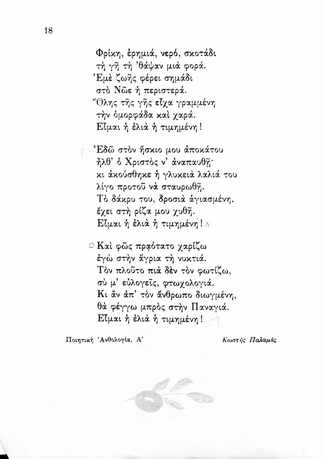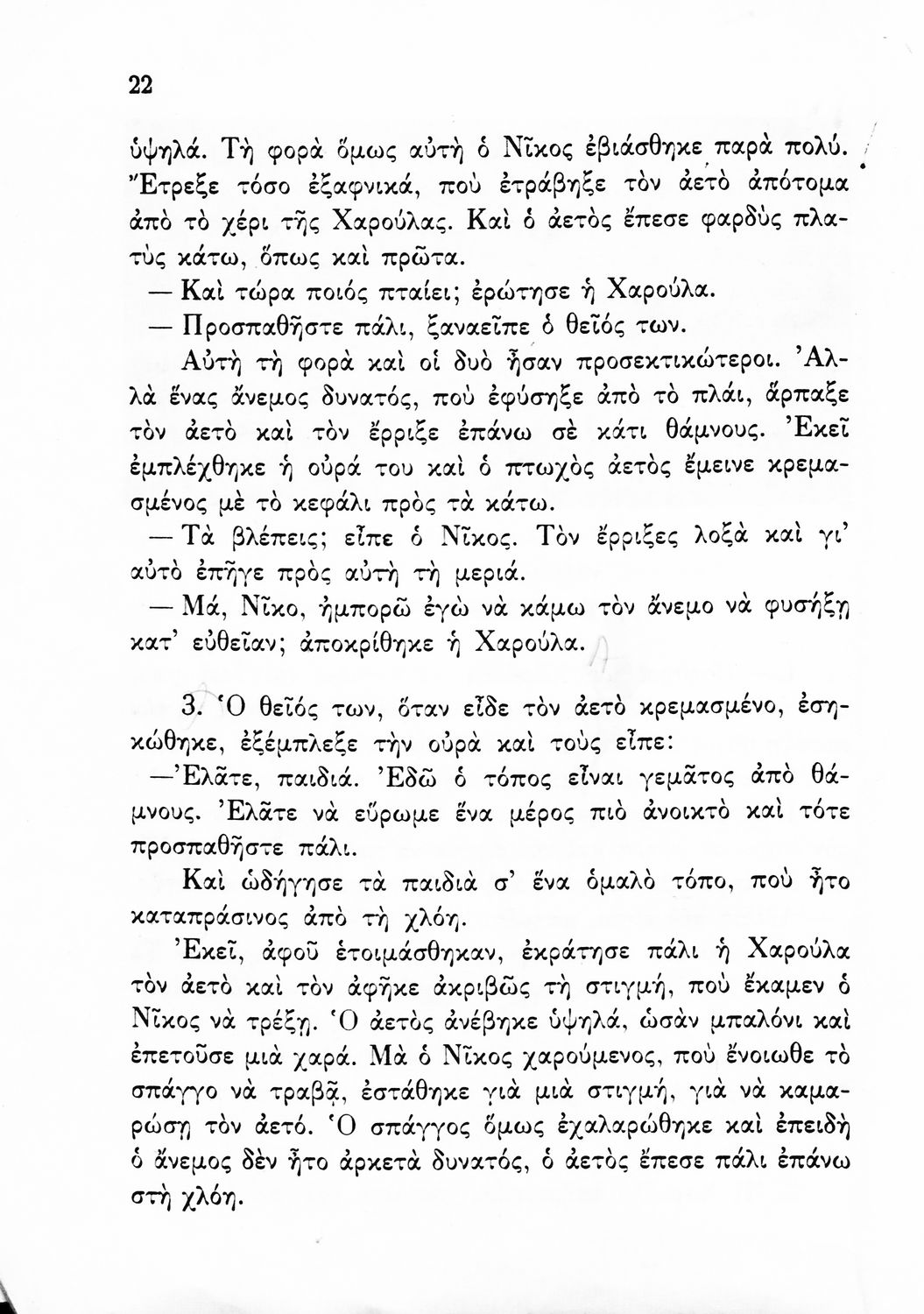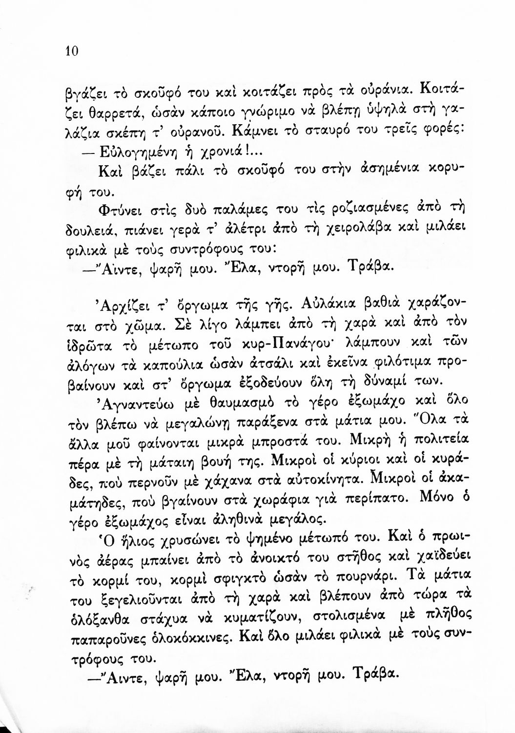 Αναγνωστικό Δ΄ Δημοτικού που περιέχει πεζά και ποιήματα με περιεχόμενο διδακτικό και ηθικοπλαστικό εμπνευσμένα από την ελληνική ιστορία και μυθολογία, και την αγροτική και κοινωνική ζωή.