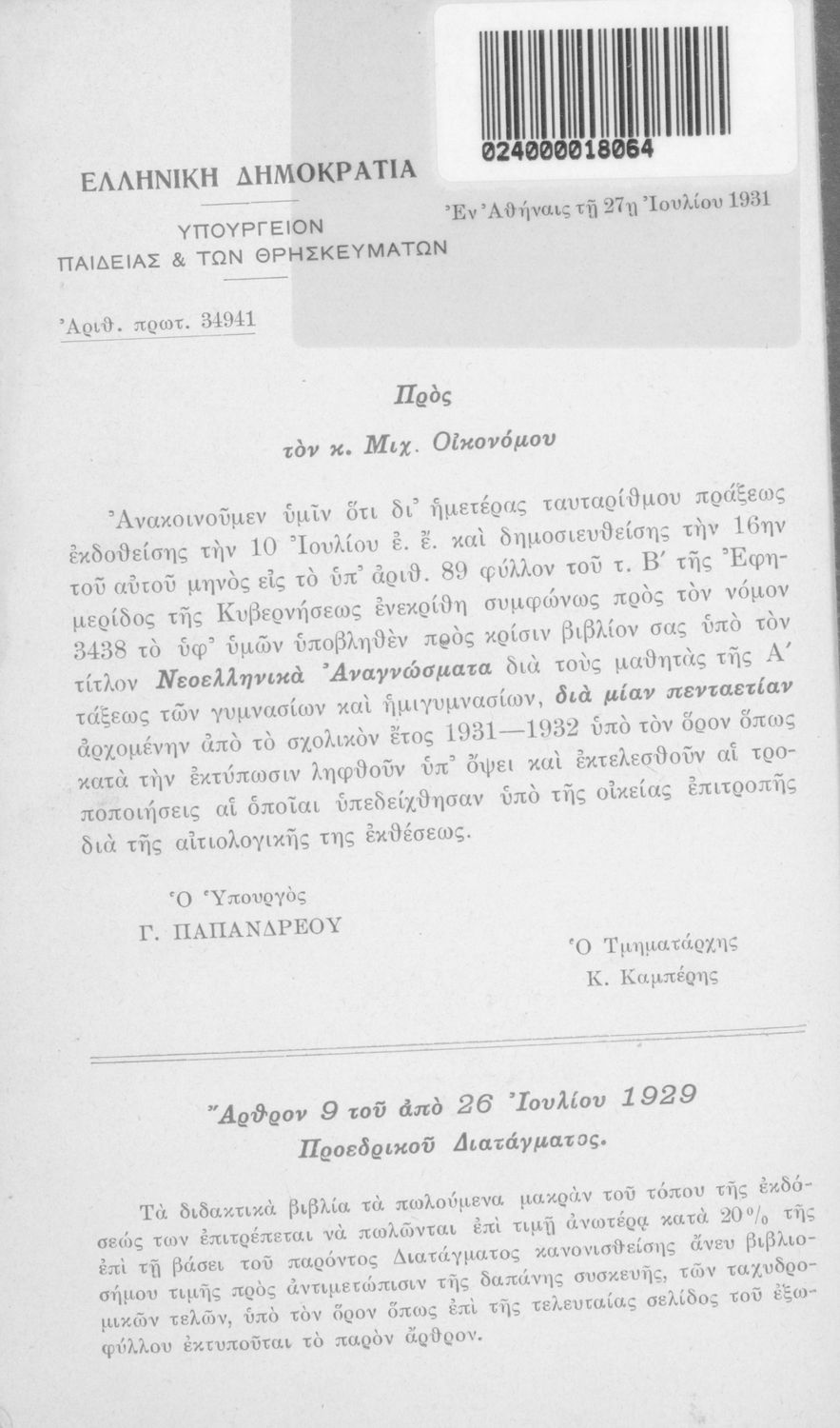 Εκδότης: Ιωάννης Δ. Κολλάρος και ΣΙΑ, Βιβλιοπωλείο της "Εστίας" Έτος έκδοσης: 1931 Τόπος έκδοσης: Αθήνα Υπουργική απόφαση / Σύμβαση: 34941/27-7-1931 Έτος έγκρισης: 1931 |