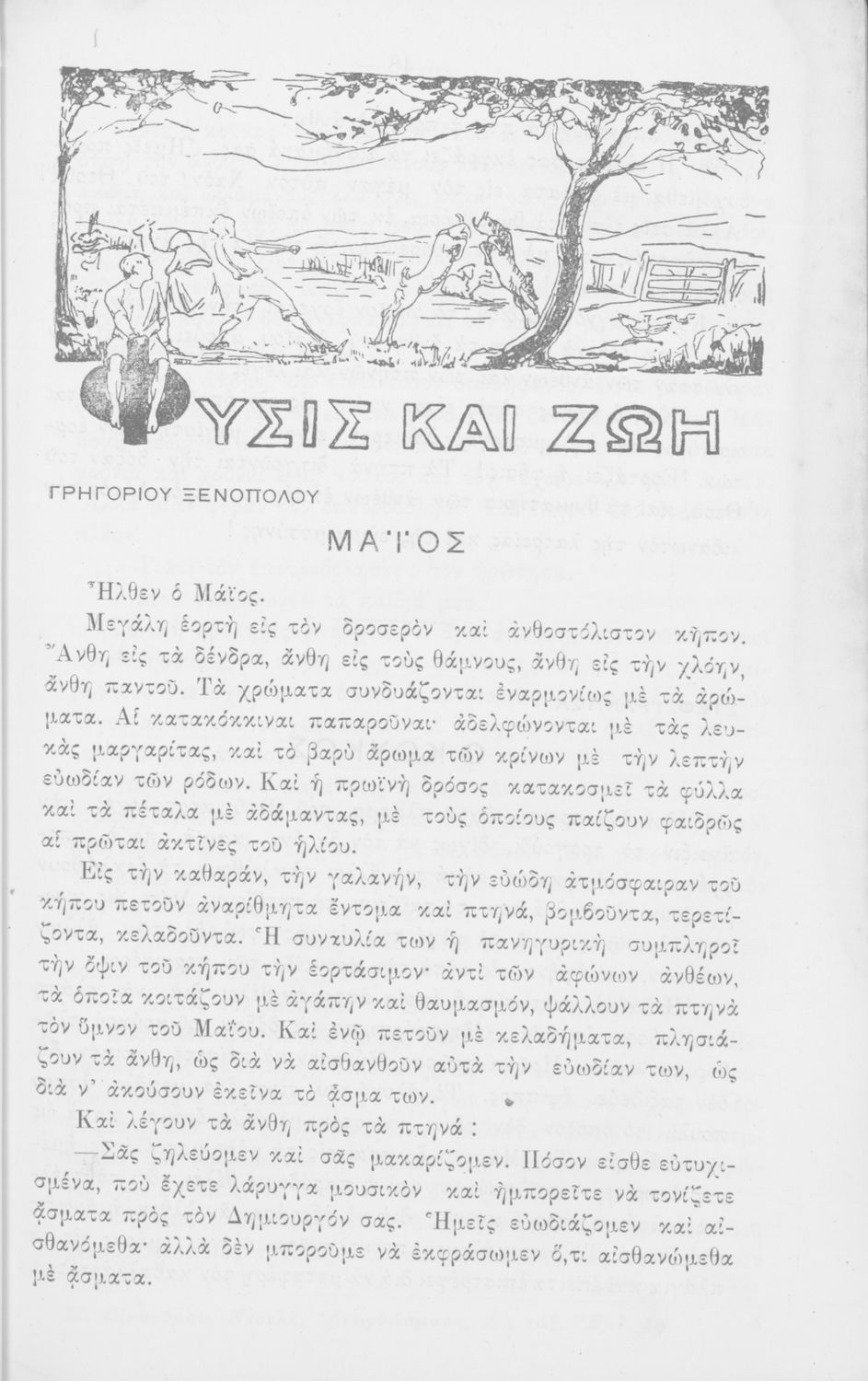 Σχολικό εγχειρίδιο Νέων Ελληνικών Γ΄ Γυμνασίου και Α' Αστικού Σχολείου που περιέχει πεζά και ποιήματα Ελλήνων συγγραφέων εμπνευσμένα από τη θρησκευτική και κοινωνική ζωή, την ελληνική μυθολογία, την αρχαία και