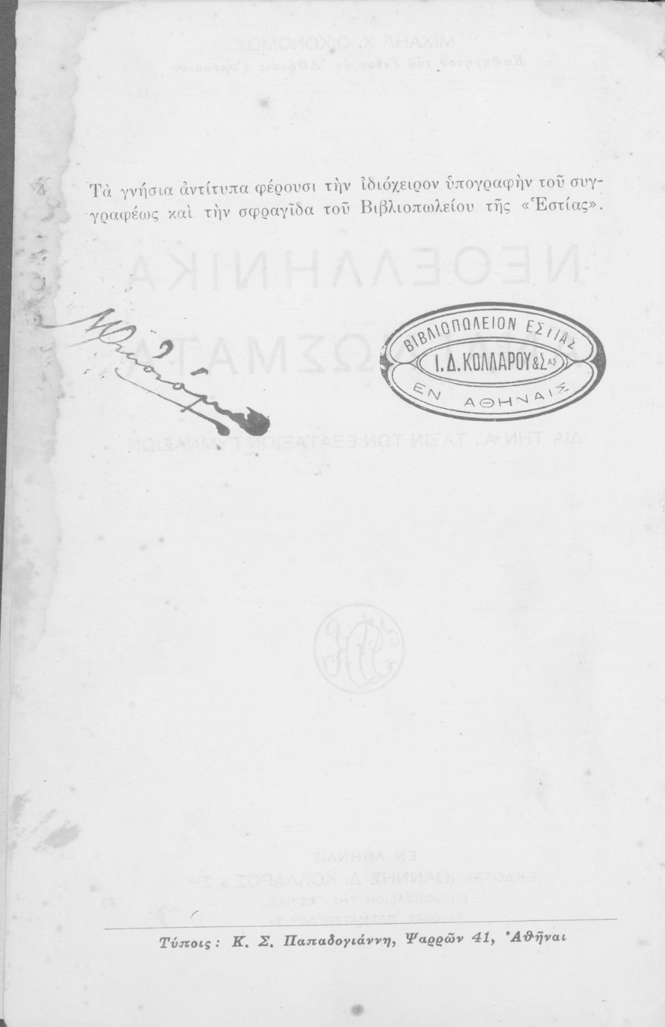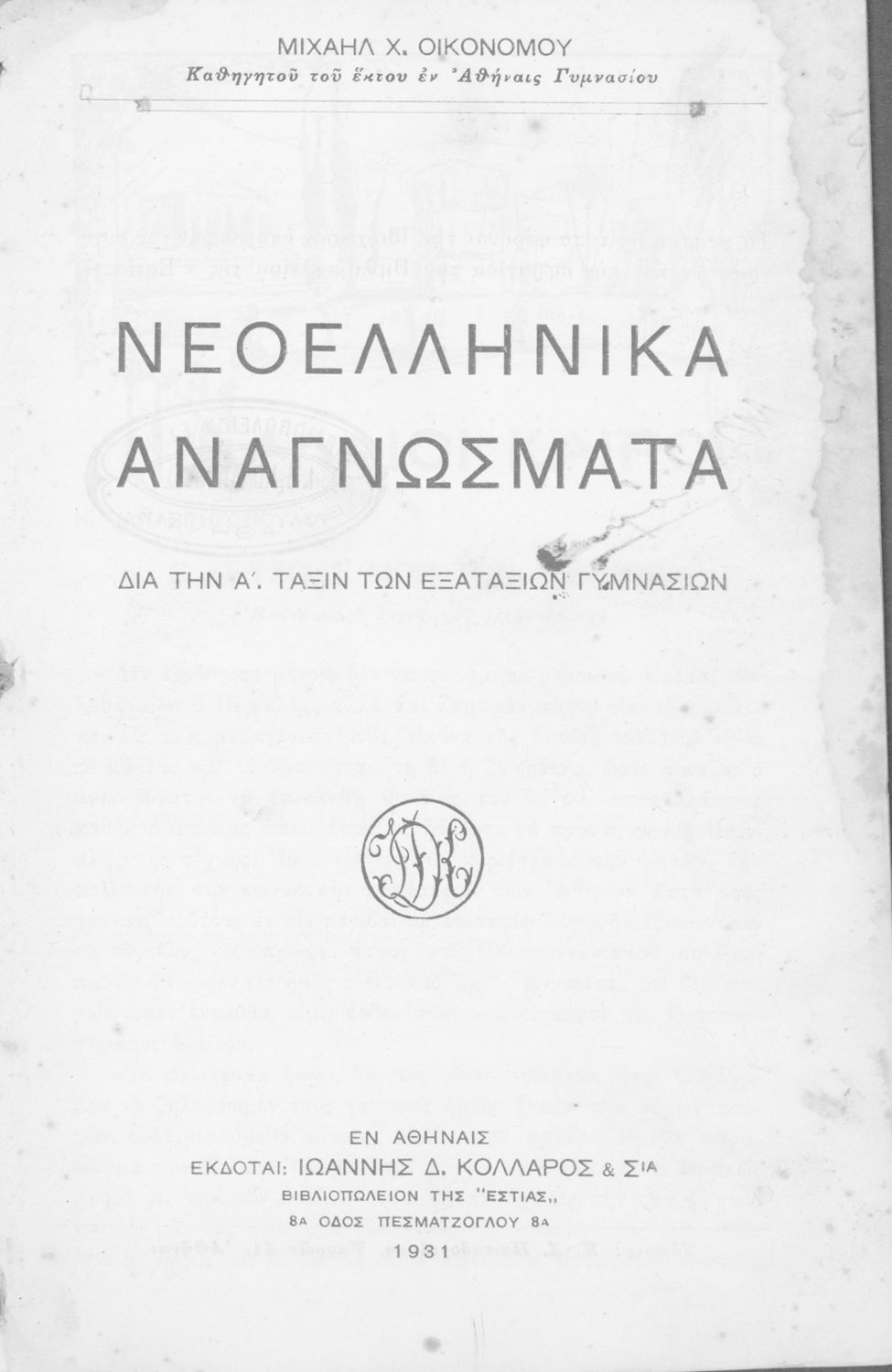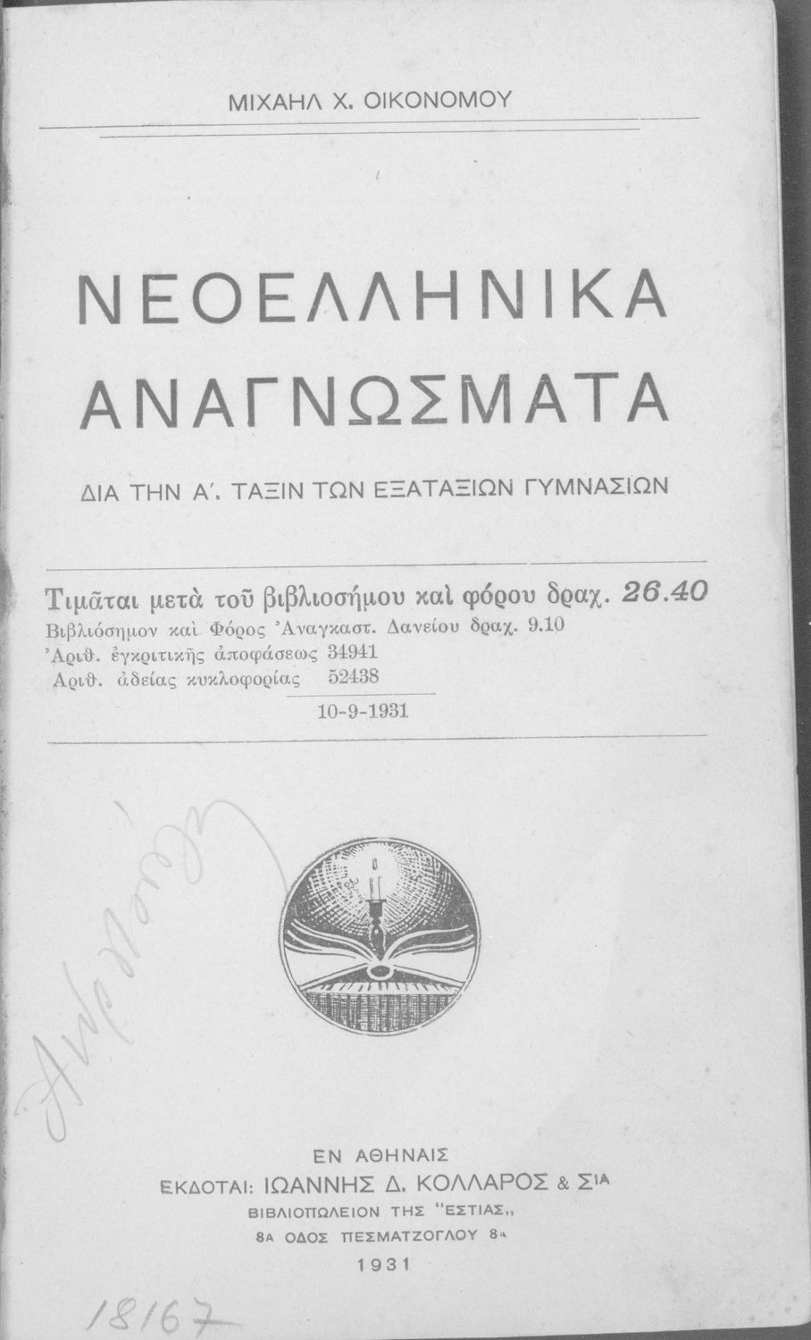 Εκδότης: Ιωάννης Δ. Κολλάρος και ΣΙΑ, Βιβλιοπωλείο της "Εστίας" Έτος έκδοσης: 1931 Τόπος έκδοσης: Αθήνα Υπουργική απόφαση / Σύμβαση: 34941/27-7-1931 Έτος έγκρισης: 1931 |