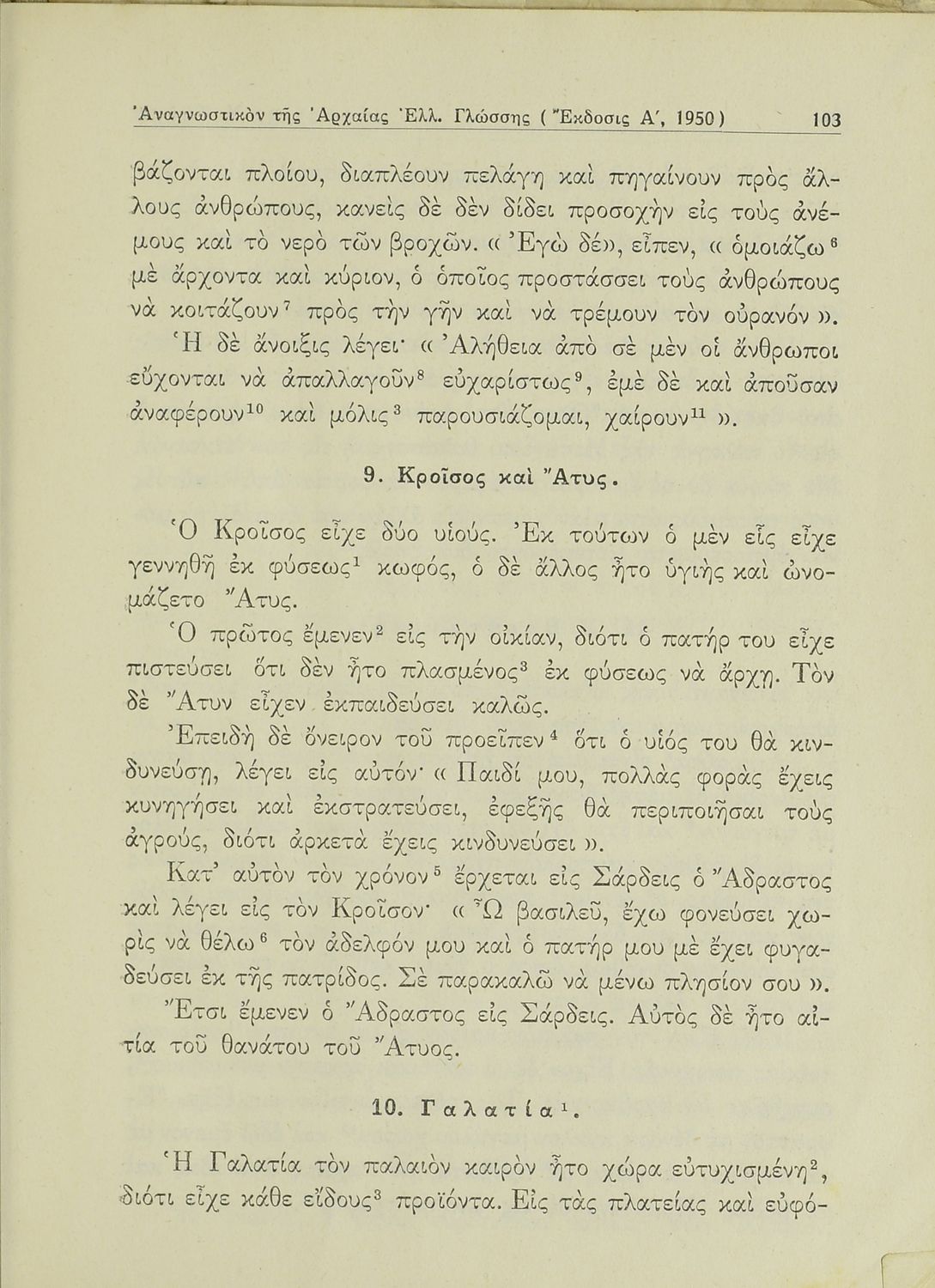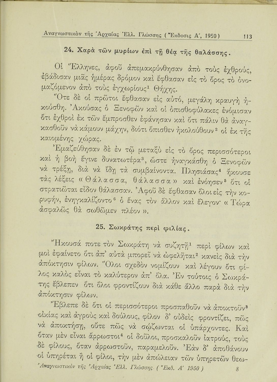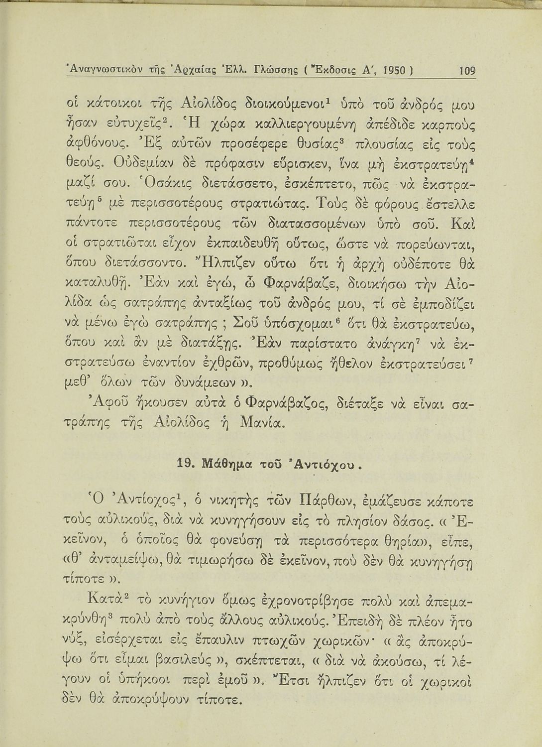 Σχολικό Εγχειρίδιο Αρχαίων Ελληνικών που περιλαμβάνει κείμενα προσαρμοσμένα στη διδασκαλία των γραμματικών και συντακτικών φαινομένων, και ερμηνευτικές και λεξιλογικές σημειώσεις.