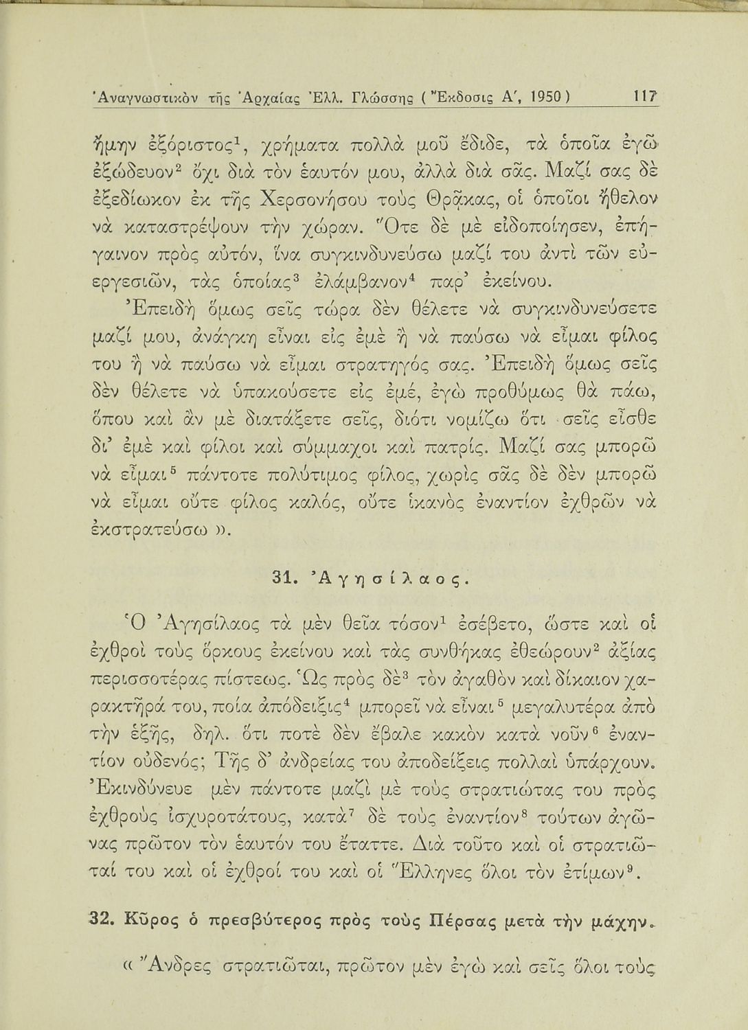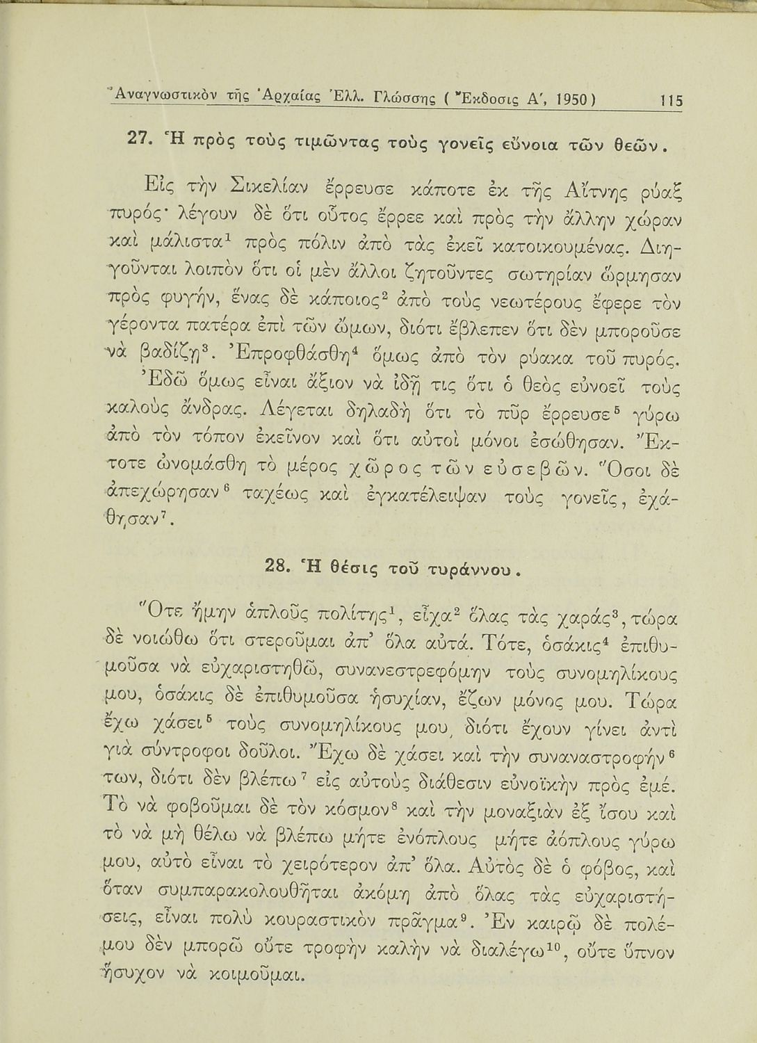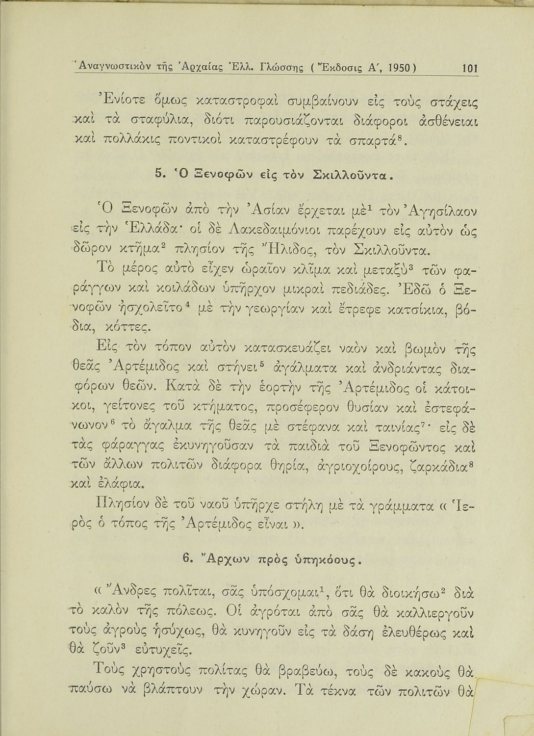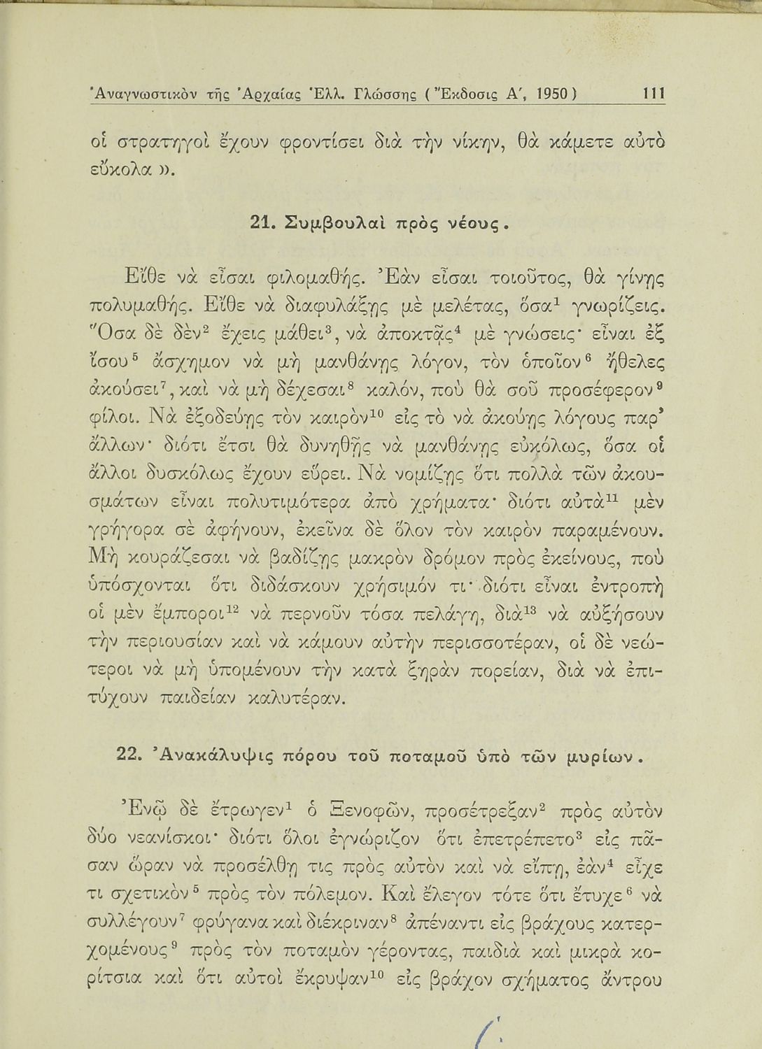 Σχολικό Εγχειρίδιο Αρχαίων Ελληνικών που περιλαμβάνει κείμενα προσαρμοσμένα στη διδασκαλία των γραμματικών και συντακτικών φαινομένων, και ερμηνευτικές και λεξιλογικές σημειώσεις.