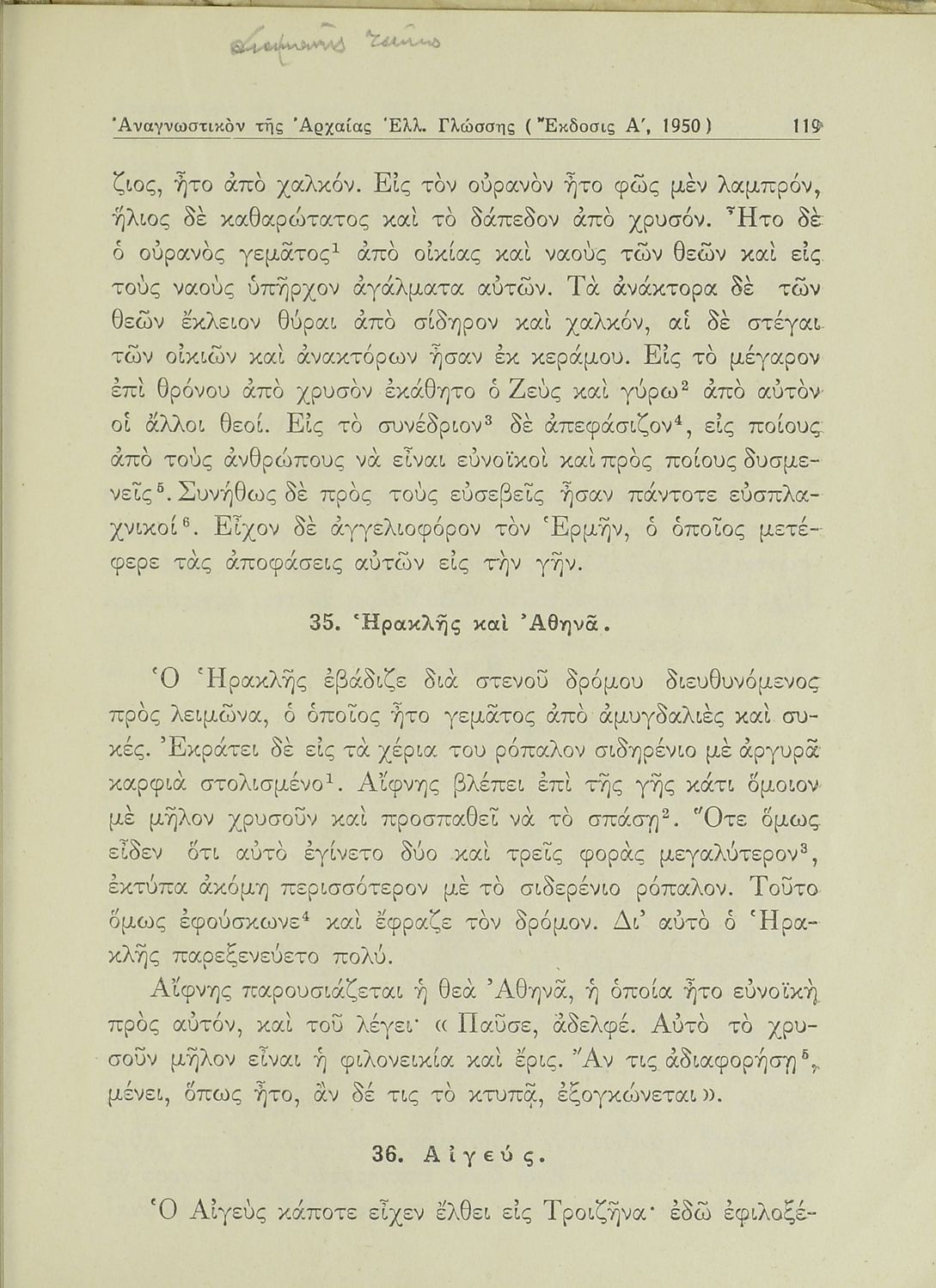 Σχολικό εγχειρίδιο Αρχαίων Ελληνικών Γυμνασίου που περιέχει κείμενα βασισμένα στην αρχαία ελληνική ιστορία και μυθολογία και γραμματικές, συντακτικές και ετυμολογικές παρατηρήσεις.