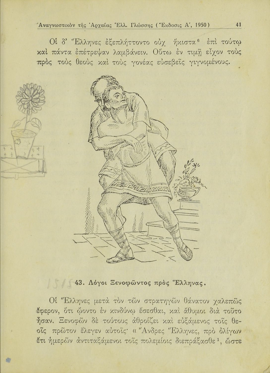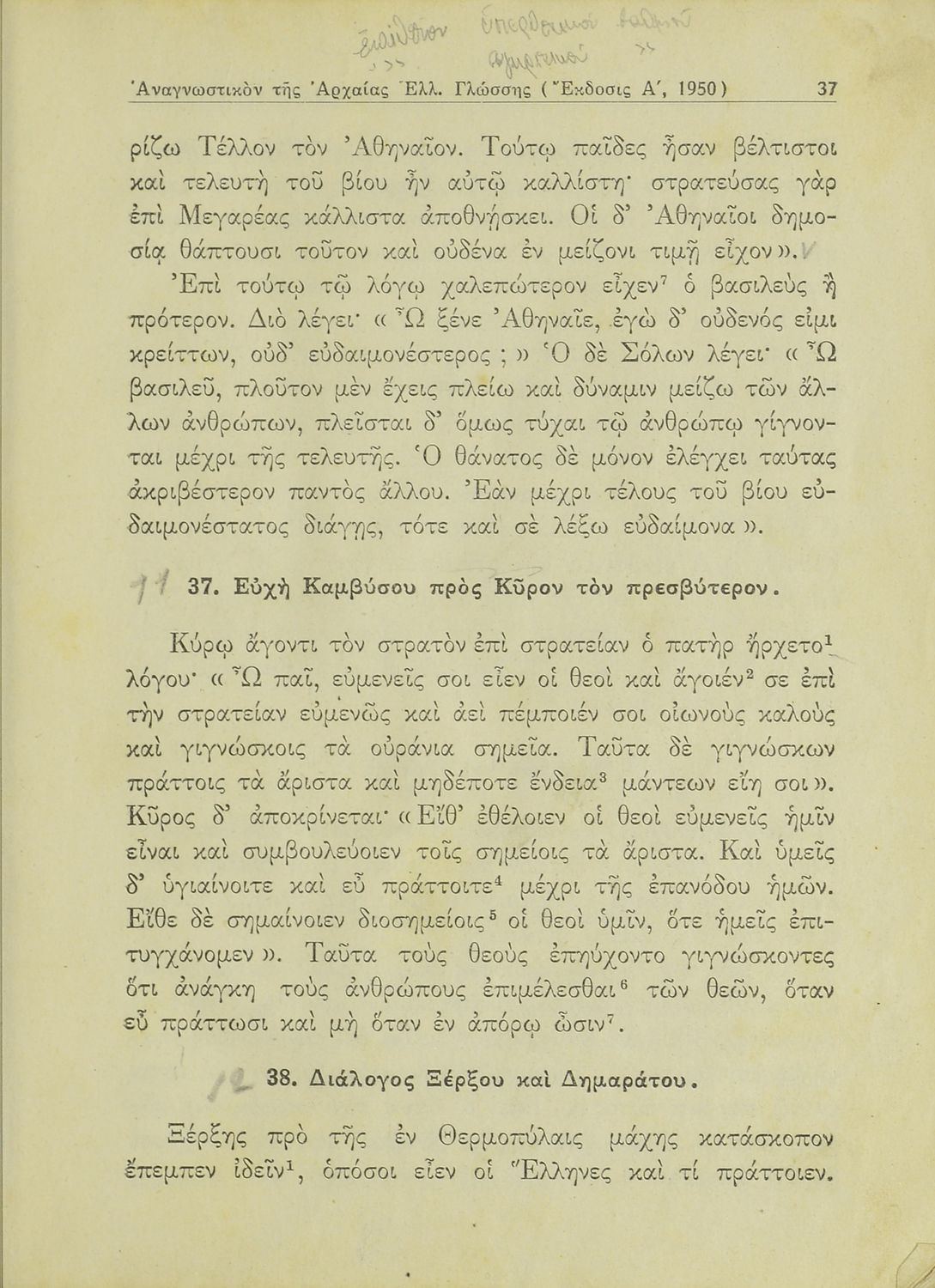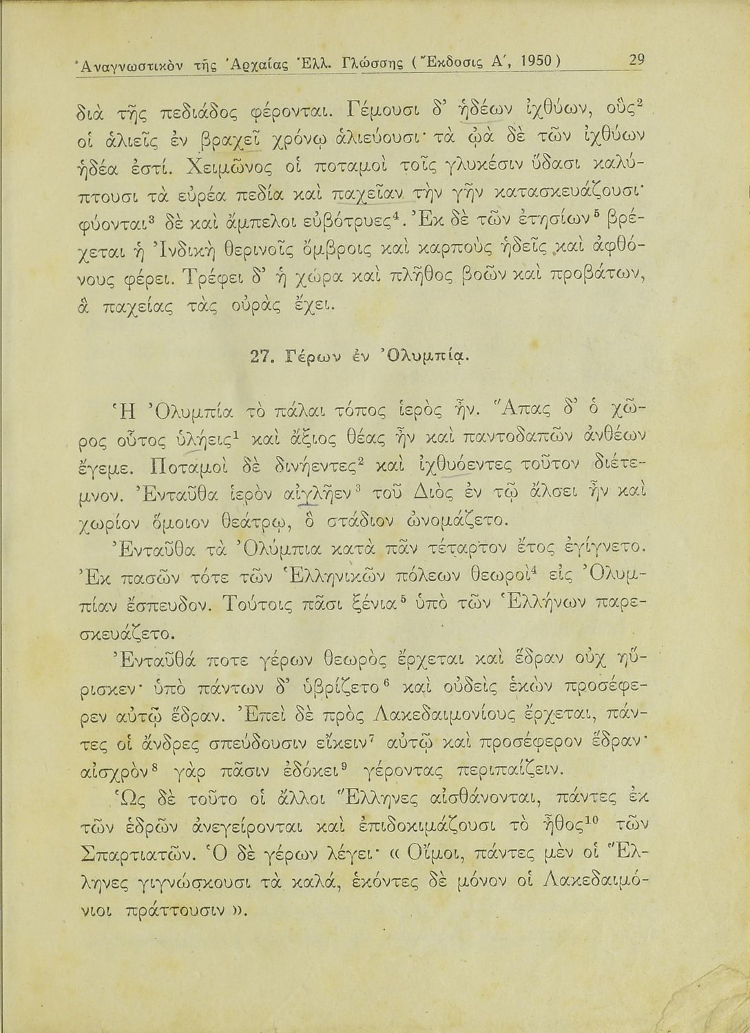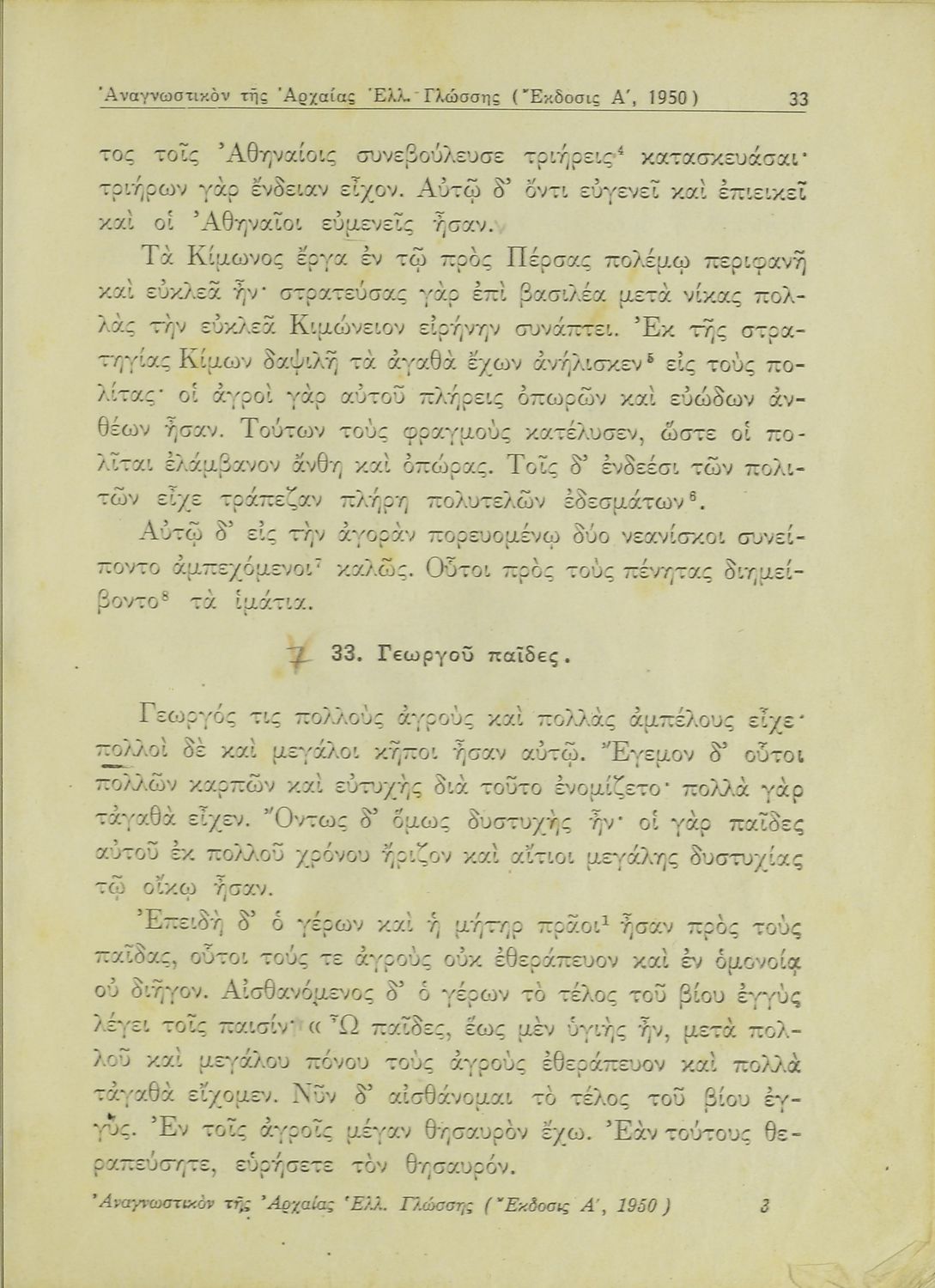 Σχολικό Εγχειρίδιο Αρχαίων Ελληνικών που περιλαμβάνει κείμενα προσαρμοσμένα στη διδασκαλία των γραμματικών και συντακτικών φαινομένων, και ερμηνευτικές και λεξιλογικές σημειώσεις.