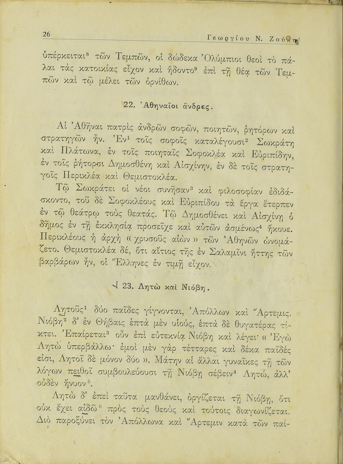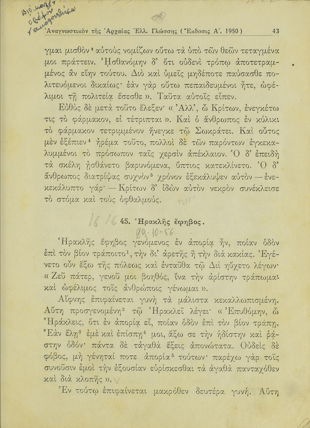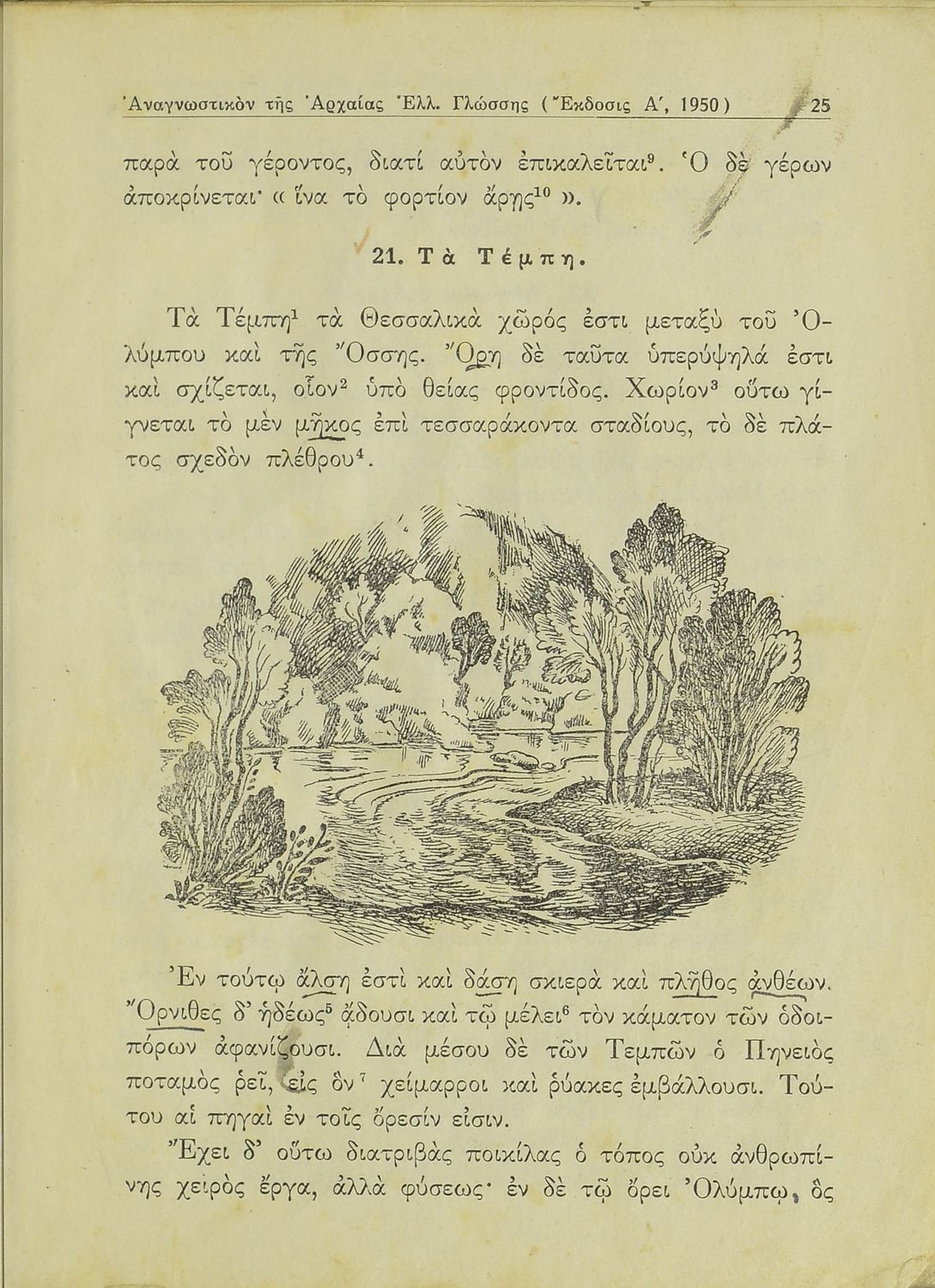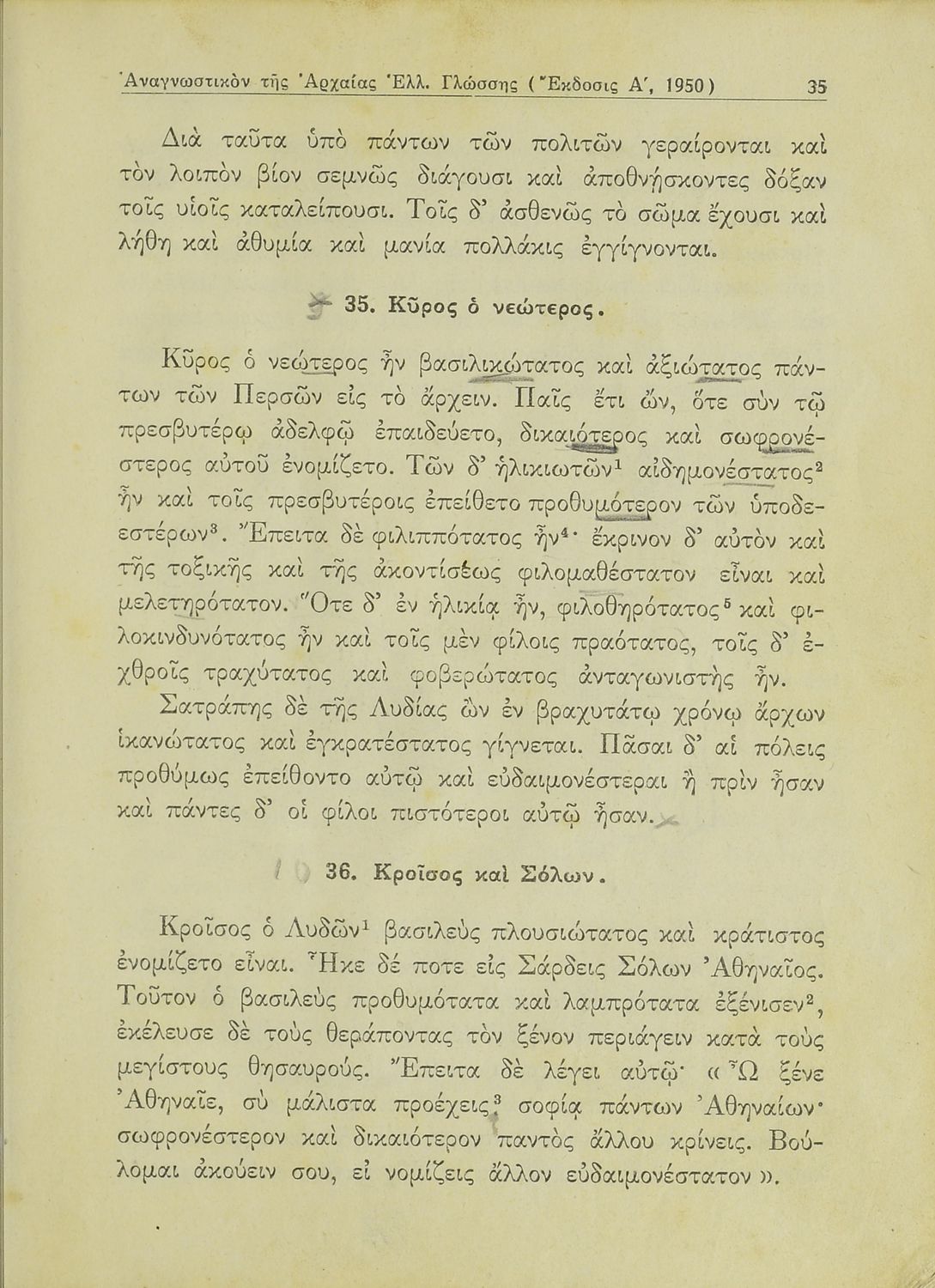 Σχολικό Εγχειρίδιο Αρχαίων Ελληνικών που περιλαμβάνει κείμενα προσαρμοσμένα στη διδασκαλία των γραμματικών και συντακτικών φαινομένων, και ερμηνευτικές και λεξιλογικές σημειώσεις.