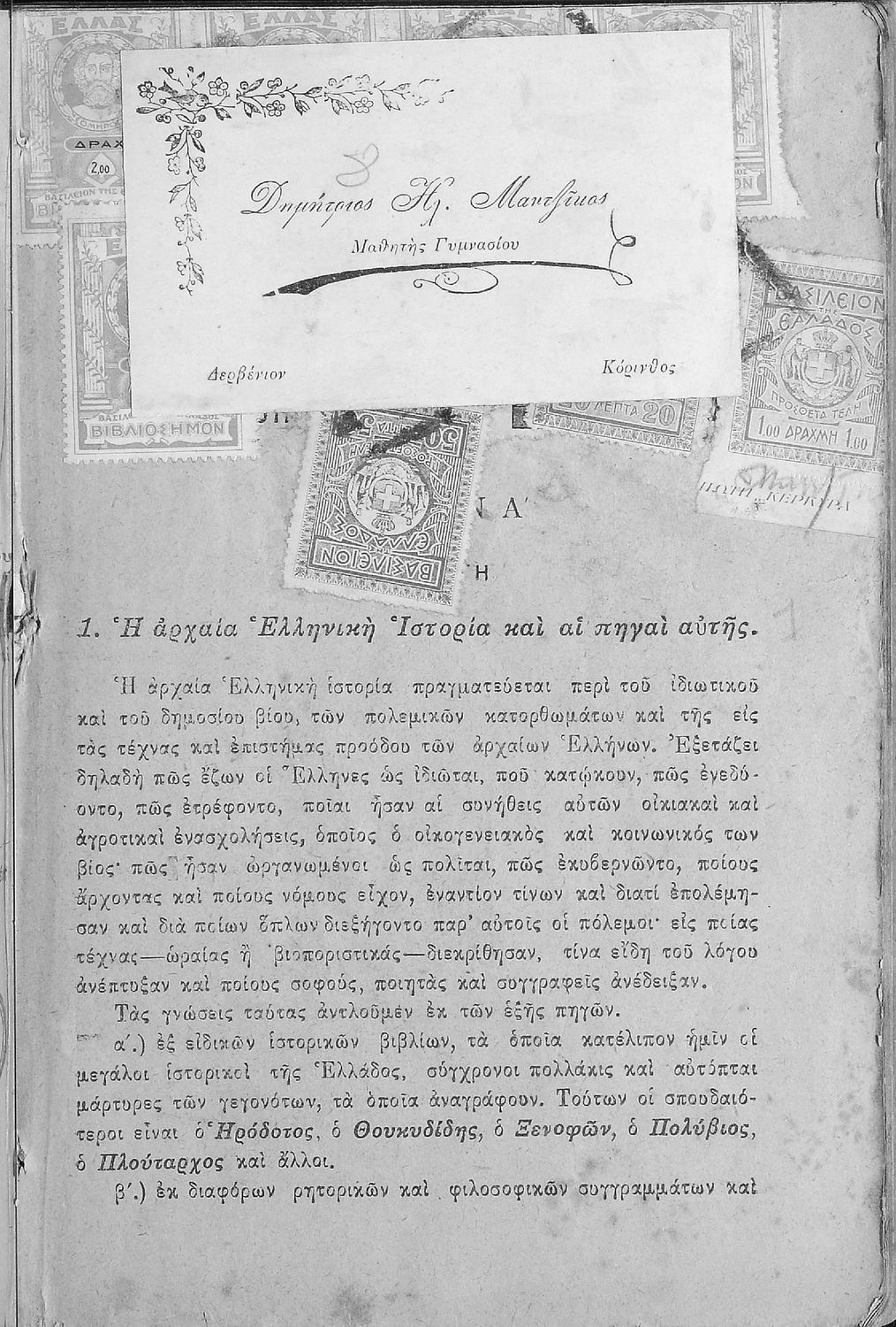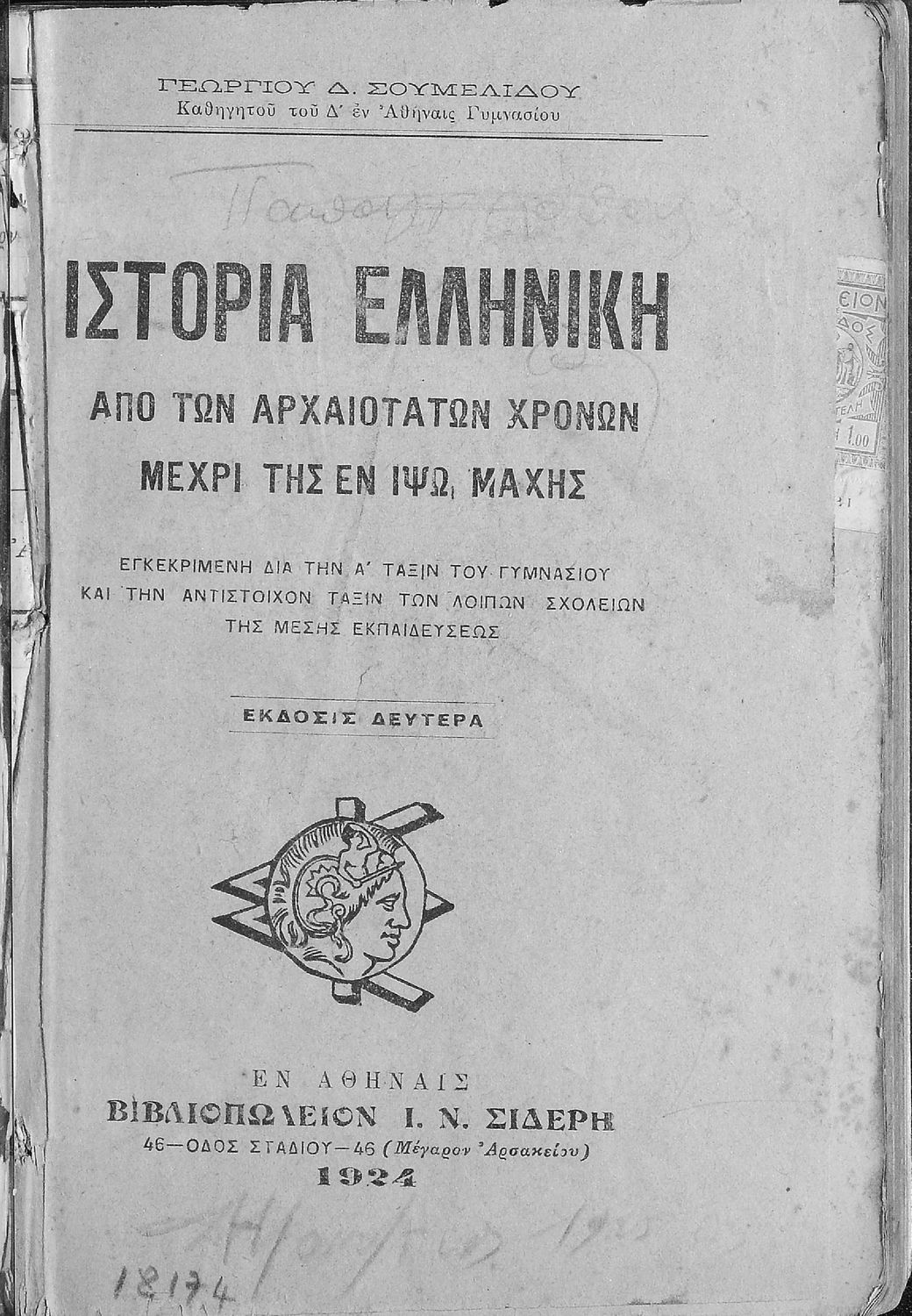 Τίτλος: Ελληνική Ιστορία. Από των αρχαιοτάτων χρόνων μέχρι της εν Ιψώ μάχης εγκεκριμένη δια την Α΄ τάξιν του Γυμνασίου και την αντιστοίχων τάξιν των λοιπών σχολείων της Μέσης Εκπαιδεύσεως