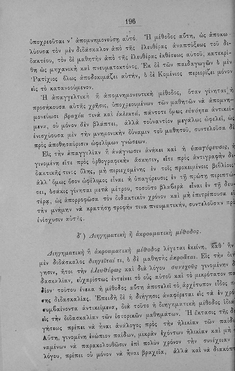 Παρουσίαση περιεχομένου: Παιδαγωγικό βοήθημα που περιλαμβάνει στοιχεία παιδαγωγικής, ψυχολογίας, λογικής και διδακτικής και εγκρίθηκε «δια τους διδασκάλους της Στοιχειώδους Εκπαιδεύσεως ως το μόνον διδακτικόν βιβλίον». Ο συγγραφέας ήταν Δρ. Φιλοσοφίας και καθηγητής στην Ριζάρειο Σχολή και το Αρσάκειο Παρθεναγωγείο.