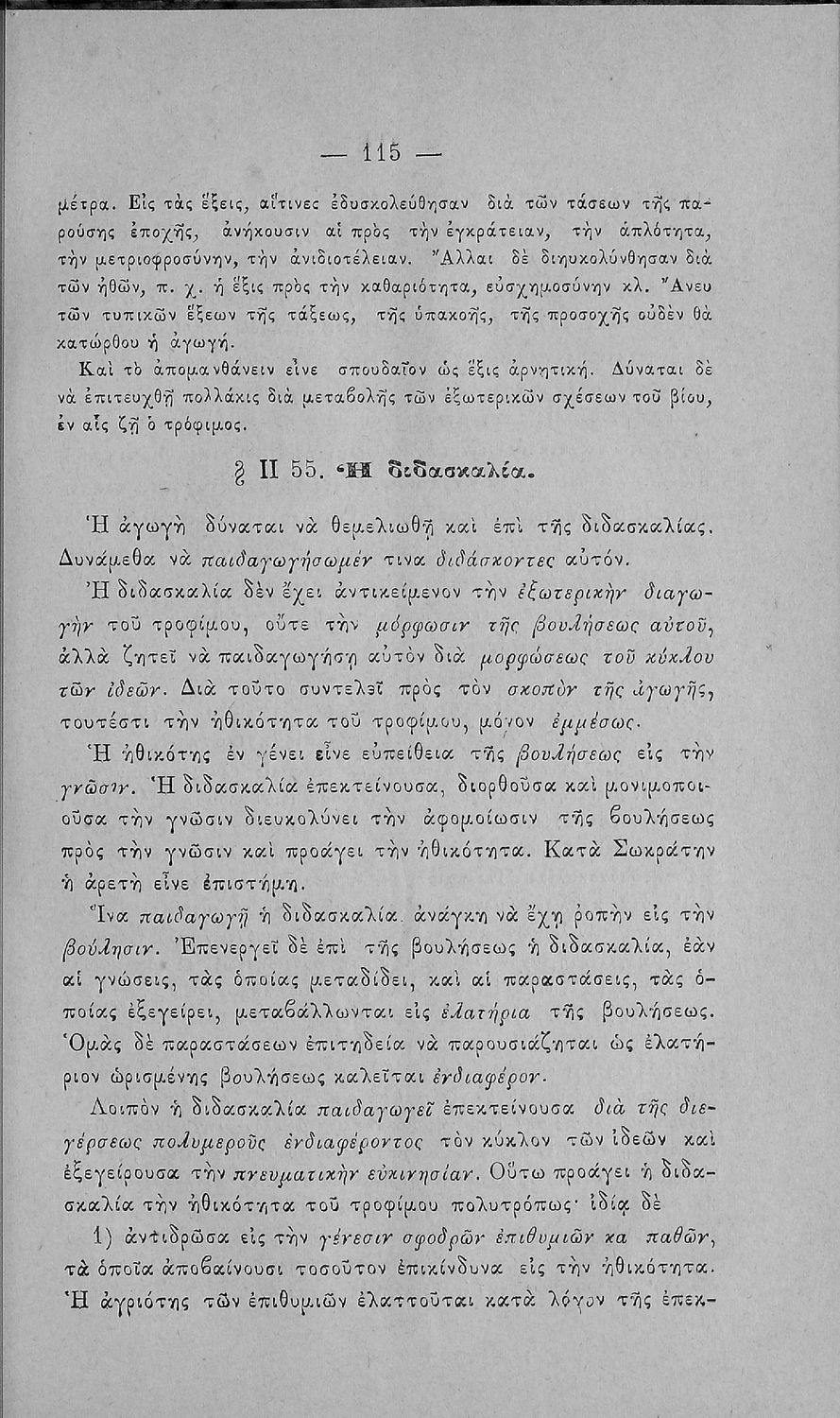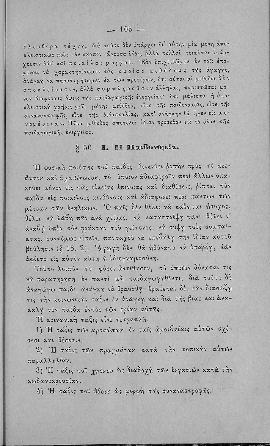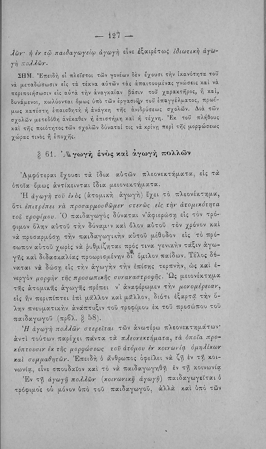 Παρουσίαση περιεχομένου: Σχολικό εγχειρίδιο που απευθύνεται στους μαθητές των Διδασκαλείων και του Πανεπιστημίου και αποσκοπεί να τους εξοικειώσει με ζητήματα παιδαγωγικής, διδακτικής, ψυχολογίας, λογικής και ηθικής. Το πρωτότυπο εγχειρίδιο είχε εγκριθεί από την αυστριακή κυβέρνηση και η μετάφρασή του έχει εγκριθεί από το Υπουργείο Εκκλησιαστικών και Δημόσιας Εκπαίδευσης. Ο μεταφραστής ήταν διευθυντής του Διδασκαλείου της Αθήνας και υφηγητής Φιλοσοφίας στο Πανεπιστήμιο Αθηνών.