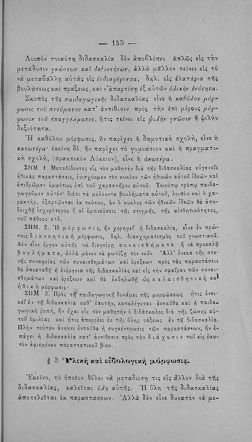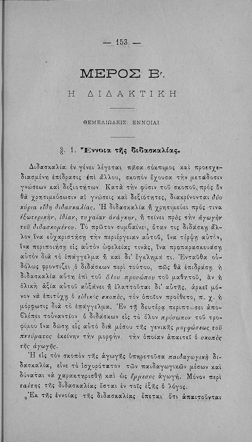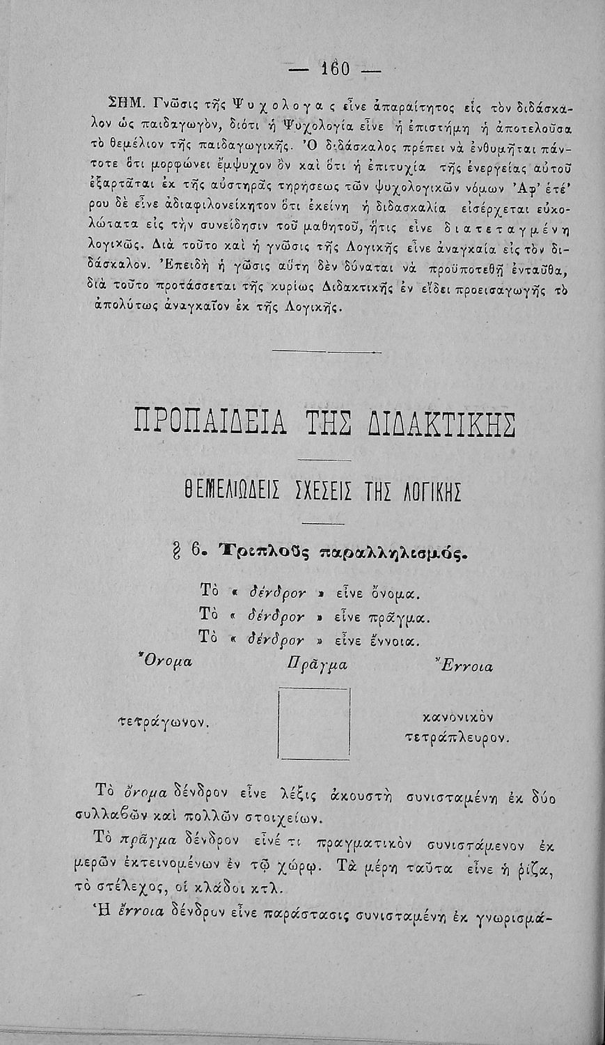 Βαθμίδα εκπαίδευσης: Δευτεροβάθμια Τάξη: Διδασκαλείο Γλώσσα: Καθαρεύουσα Παρουσίαση περιεχομένου: Σχολικό εγχειρίδιο που απευθύνεται στους μαθητές των Διδασκαλείων και του Πανεπιστημίου και αποσκοπεί να τους εξοικειώσει με ζητήματα παιδαγωγικής, διδακτικής, ψυχολογίας, λογικής και ηθικής. Το πρωτότυπο εγχειρίδιο είχε εγκριθεί από την αυστριακή κυβέρνηση και η μετάφρασή του έχει εγκριθεί από το Υπουργείο Εκκλησιαστικών και Δημόσιας Εκπαίδευσης. Ο μεταφραστής ήταν διευθυντής του Διδασκαλείου της Αθήνας και υφηγητής Φιλοσοφίας στο Πανεπιστήμιο Αθηνών. |