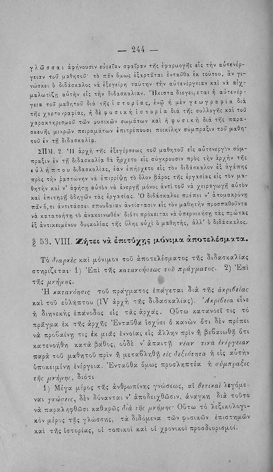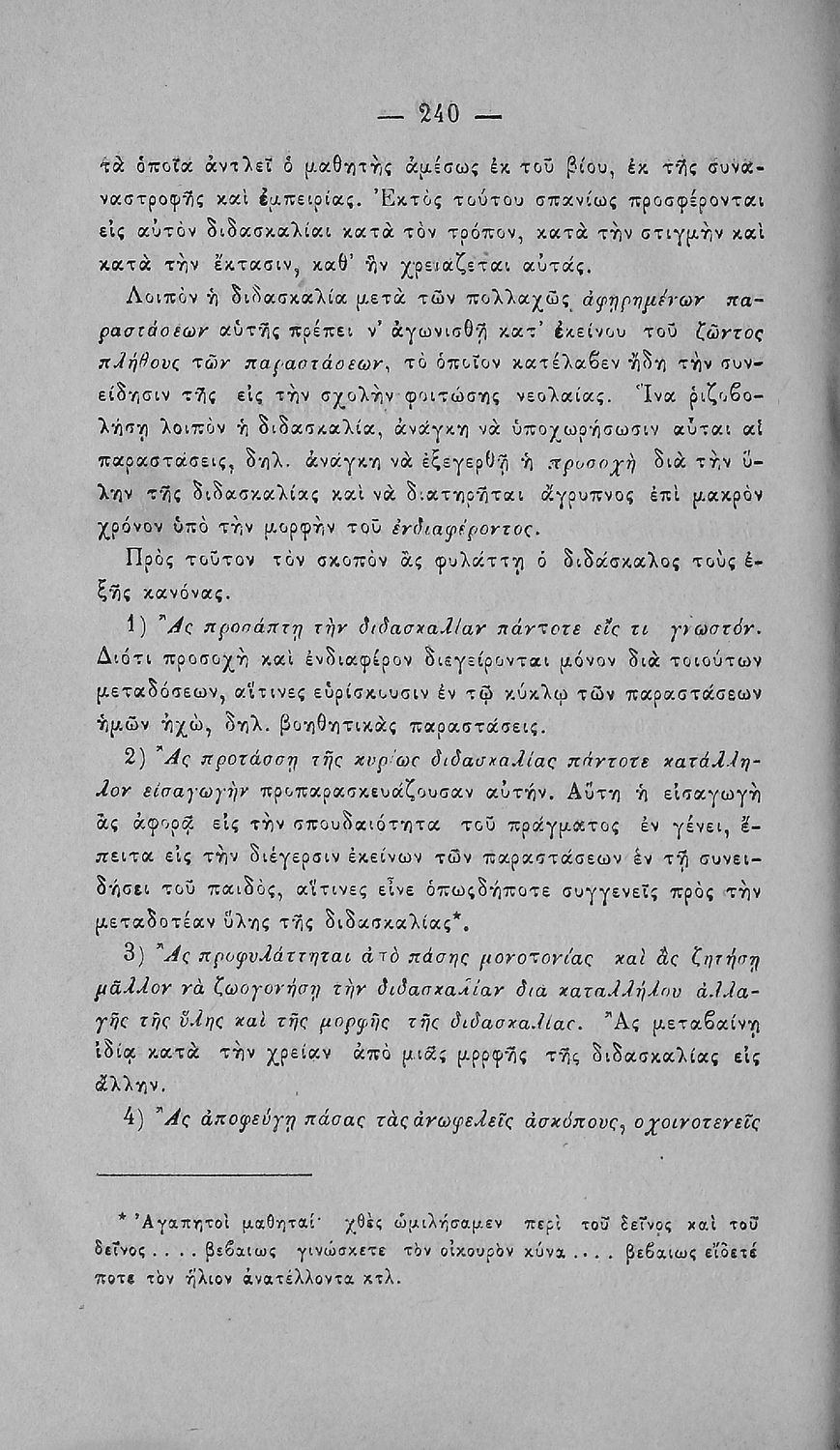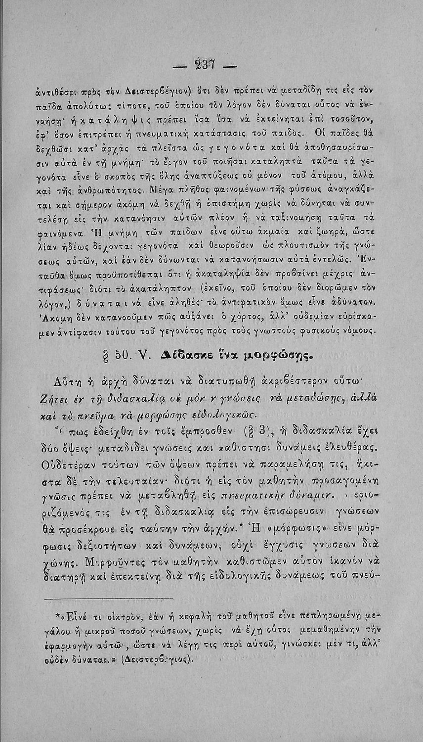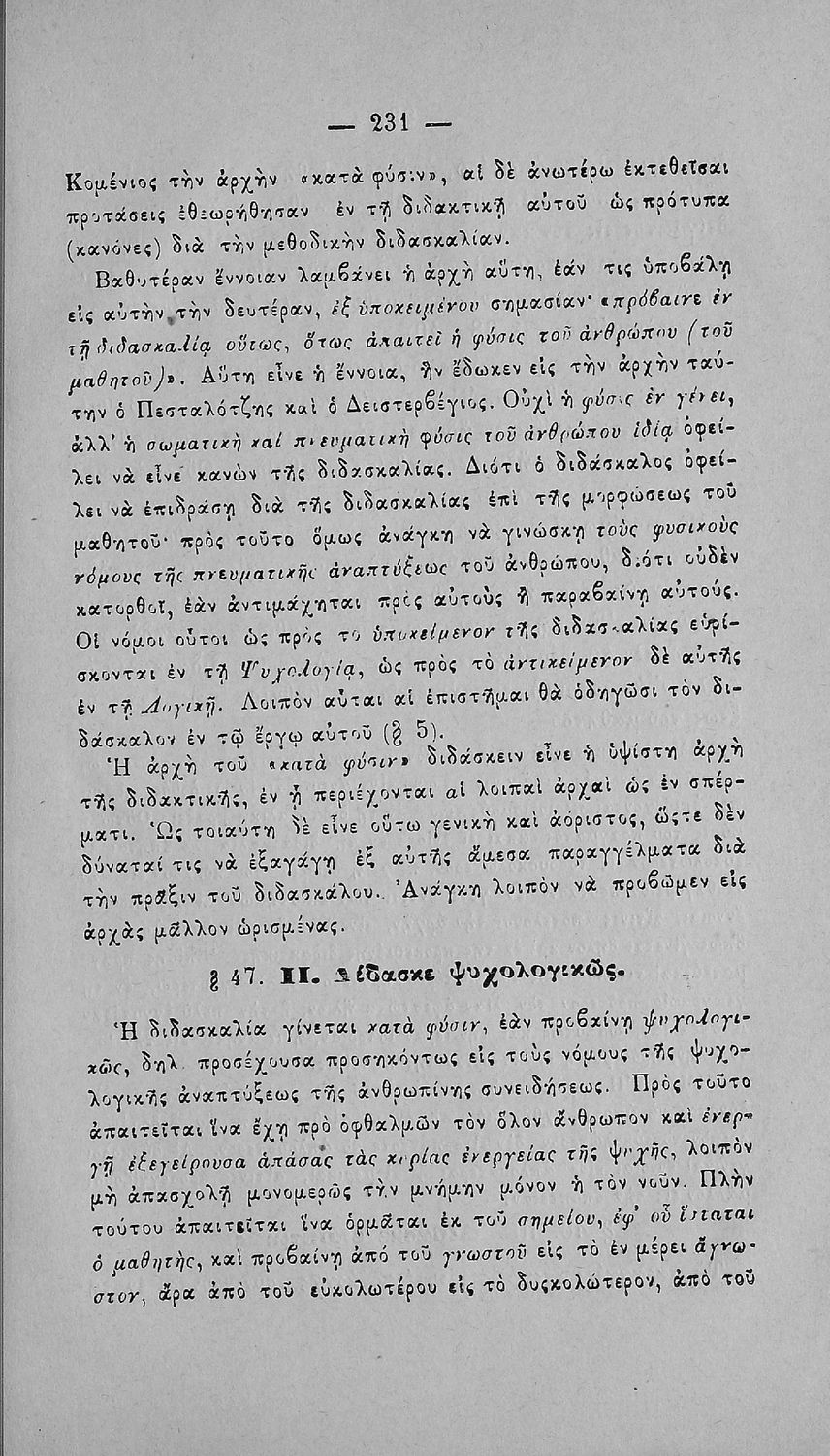 Βαθμίδα εκπαίδευσης: Δευτεροβάθμια Τάξη: Διδασκαλείο Γλώσσα: Καθαρεύουσα Παρουσίαση περιεχομένου: Σχολικό εγχειρίδιο που απευθύνεται στους μαθητές των Διδασκαλείων και του Πανεπιστημίου και αποσκοπεί να τους εξοικειώσει με ζητήματα παιδαγωγικής, διδακτικής, ψυχολογίας, λογικής και ηθικής. Το πρωτότυπο εγχειρίδιο είχε εγκριθεί από την αυστριακή κυβέρνηση και η μετάφρασή του έχει εγκριθεί από το Υπουργείο Εκκλησιαστικών και Δημόσιας Εκπαίδευσης. Ο μεταφραστής ήταν διευθυντής του Διδασκαλείου της Αθήνας και υφηγητής Φιλοσοφίας στο Πανεπιστήμιο Αθηνών. |