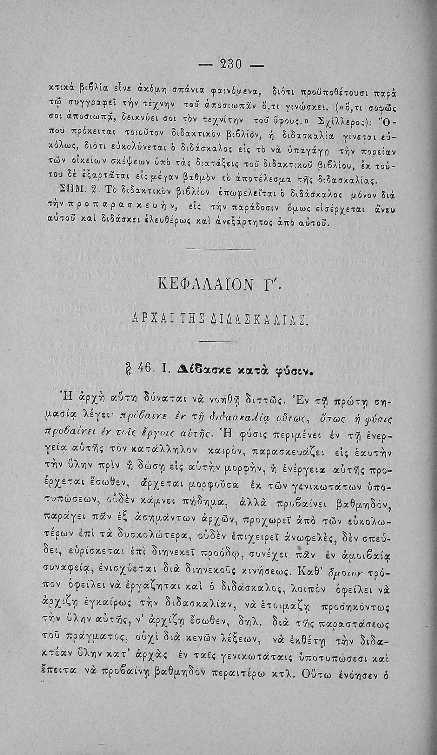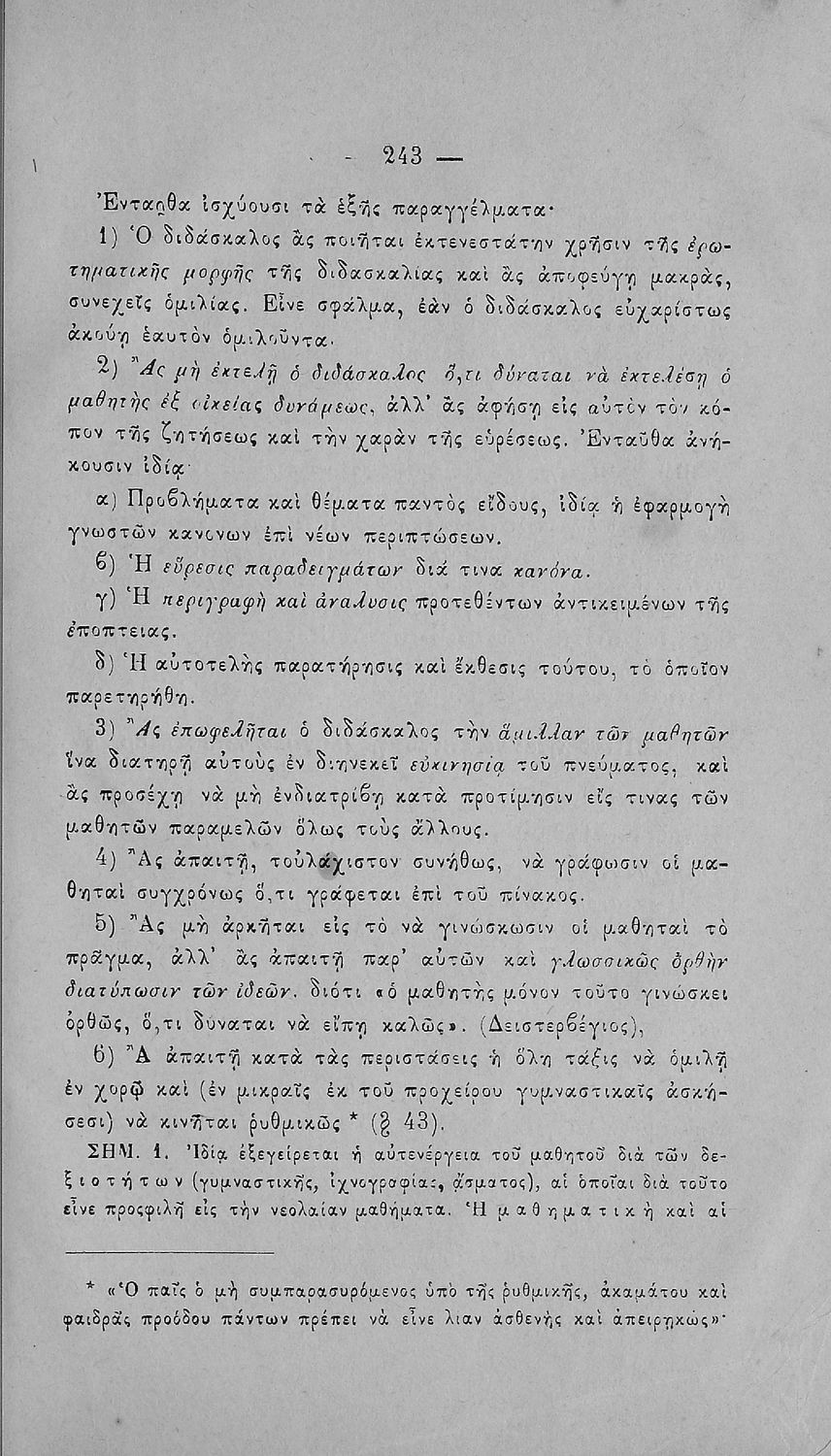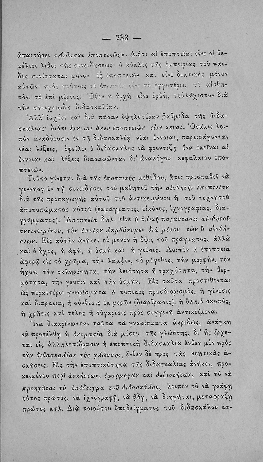Βαθμίδα εκπαίδευσης: Δευτεροβάθμια Τάξη: Διδασκαλείο Γλώσσα: Καθαρεύουσα Παρουσίαση περιεχομένου: Σχολικό εγχειρίδιο που απευθύνεται στους μαθητές των Διδασκαλείων και του Πανεπιστημίου και αποσκοπεί να τους εξοικειώσει με ζητήματα παιδαγωγικής, διδακτικής, ψυχολογίας, λογικής και ηθικής. Το πρωτότυπο εγχειρίδιο είχε εγκριθεί από την αυστριακή κυβέρνηση και η μετάφρασή του έχει εγκριθεί από το Υπουργείο Εκκλησιαστικών και Δημόσιας Εκπαίδευσης. Ο μεταφραστής ήταν διευθυντής του Διδασκαλείου της Αθήνας και υφηγητής Φιλοσοφίας στο Πανεπιστήμιο Αθηνών. |
