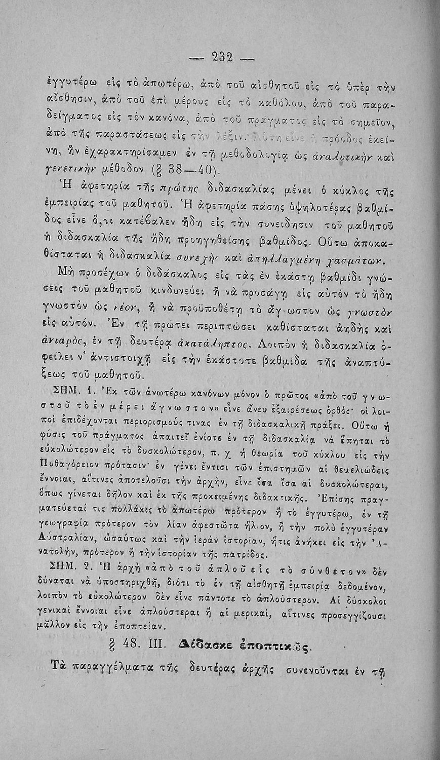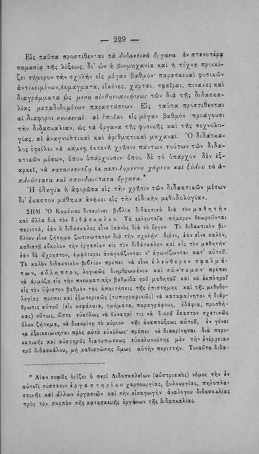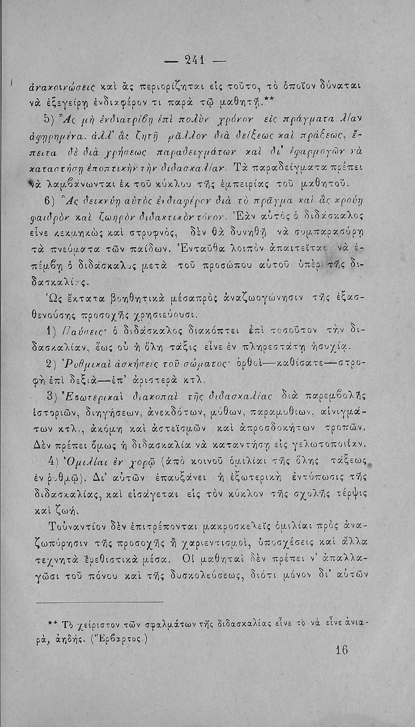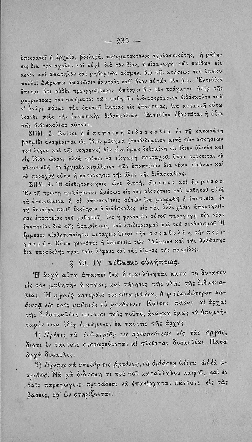 Βαθμίδα εκπαίδευσης: Δευτεροβάθμια Τάξη: Διδασκαλείο Γλώσσα: Καθαρεύουσα Παρουσίαση περιεχομένου: Σχολικό εγχειρίδιο που απευθύνεται στους μαθητές των Διδασκαλείων και του Πανεπιστημίου και αποσκοπεί να τους εξοικειώσει με ζητήματα παιδαγωγικής, διδακτικής, ψυχολογίας, λογικής και ηθικής. Το πρωτότυπο εγχειρίδιο είχε εγκριθεί από την αυστριακή κυβέρνηση και η μετάφρασή του έχει εγκριθεί από το Υπουργείο Εκκλησιαστικών και Δημόσιας Εκπαίδευσης. Ο μεταφραστής ήταν διευθυντής του Διδασκαλείου της Αθήνας και υφηγητής Φιλοσοφίας στο Πανεπιστήμιο Αθηνών. |