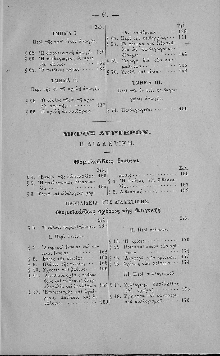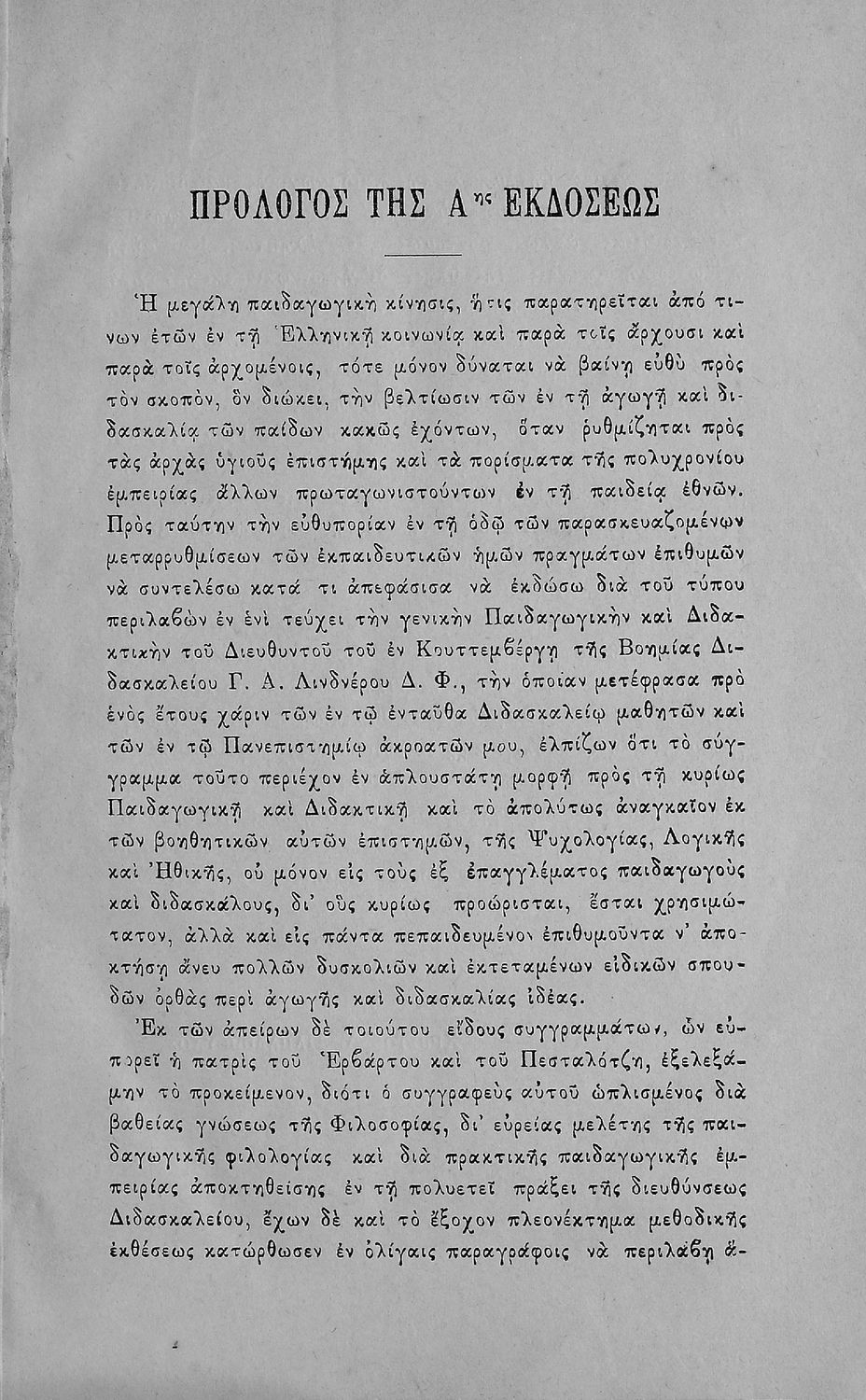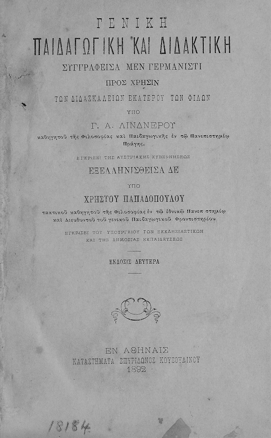 Βαθμίδα εκπαίδευσης: Δευτεροβάθμια Τάξη: Διδασκαλείο Γλώσσα: Καθαρεύουσα Παρουσίαση περιεχομένου: Σχολικό εγχειρίδιο που απευθύνεται στους μαθητές των Διδασκαλείων και του Πανεπιστημίου και αποσκοπεί να τους εξοικειώσει με ζητήματα παιδαγωγικής, διδακτικής, ψυχολογίας, λογικής και ηθικής. Το πρωτότυπο εγχειρίδιο είχε εγκριθεί από την αυστριακή κυβέρνηση και η μετάφρασή του έχει εγκριθεί από το Υπουργείο Εκκλησιαστικών και Δημόσιας Εκπαίδευσης. Ο μεταφραστής ήταν διευθυντής του Διδασκαλείου της Αθήνας και υφηγητής Φιλοσοφίας στο Πανεπιστήμιο Αθηνών. |