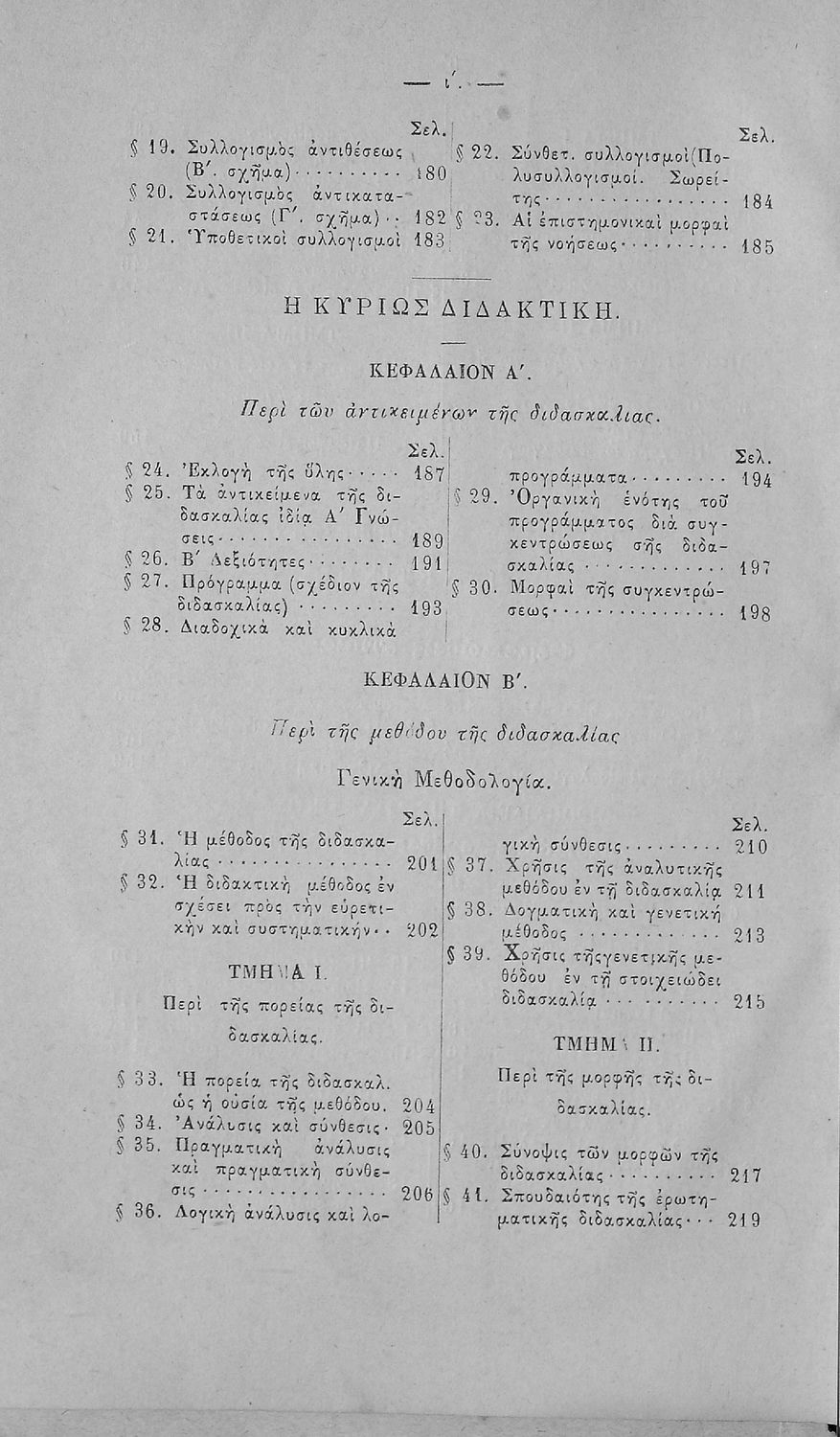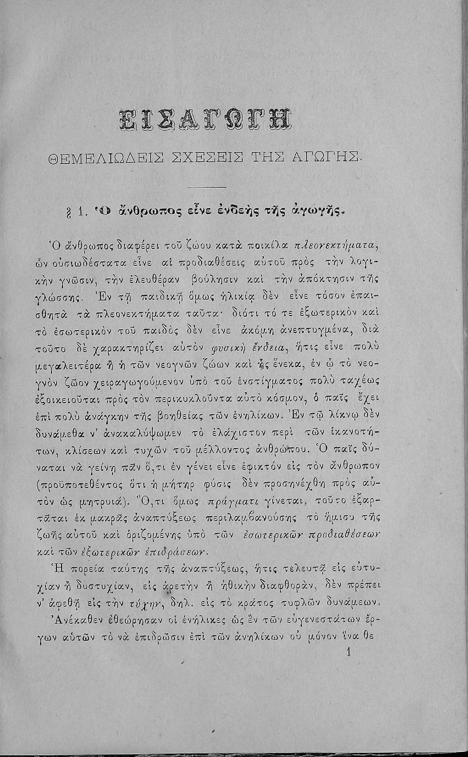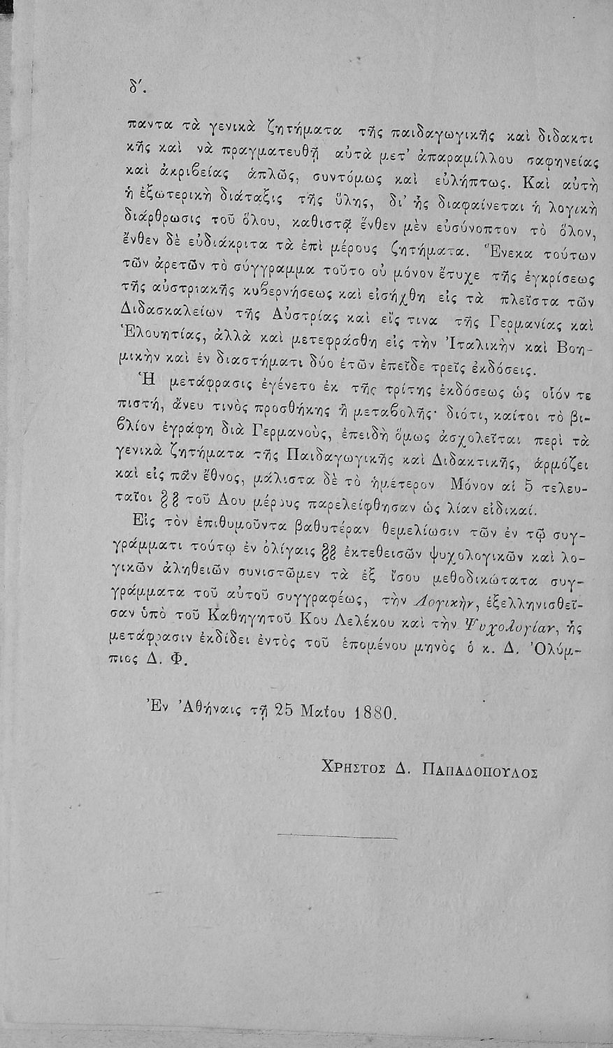 Βαθμίδα εκπαίδευσης: Δευτεροβάθμια Τάξη: Διδασκαλείο Γλώσσα: Καθαρεύουσα Παρουσίαση περιεχομένου: Σχολικό εγχειρίδιο που απευθύνεται στους μαθητές των Διδασκαλείων και του Πανεπιστημίου και αποσκοπεί να τους εξοικειώσει με ζητήματα παιδαγωγικής, διδακτικής, ψυχολογίας, λογικής και ηθικής. Το πρωτότυπο εγχειρίδιο είχε εγκριθεί από την αυστριακή κυβέρνηση και η μετάφρασή του έχει εγκριθεί από το Υπουργείο Εκκλησιαστικών και Δημόσιας Εκπαίδευσης. Ο μεταφραστής ήταν διευθυντής του Διδασκαλείου της Αθήνας και υφηγητής Φιλοσοφίας στο Πανεπιστήμιο Αθηνών. |