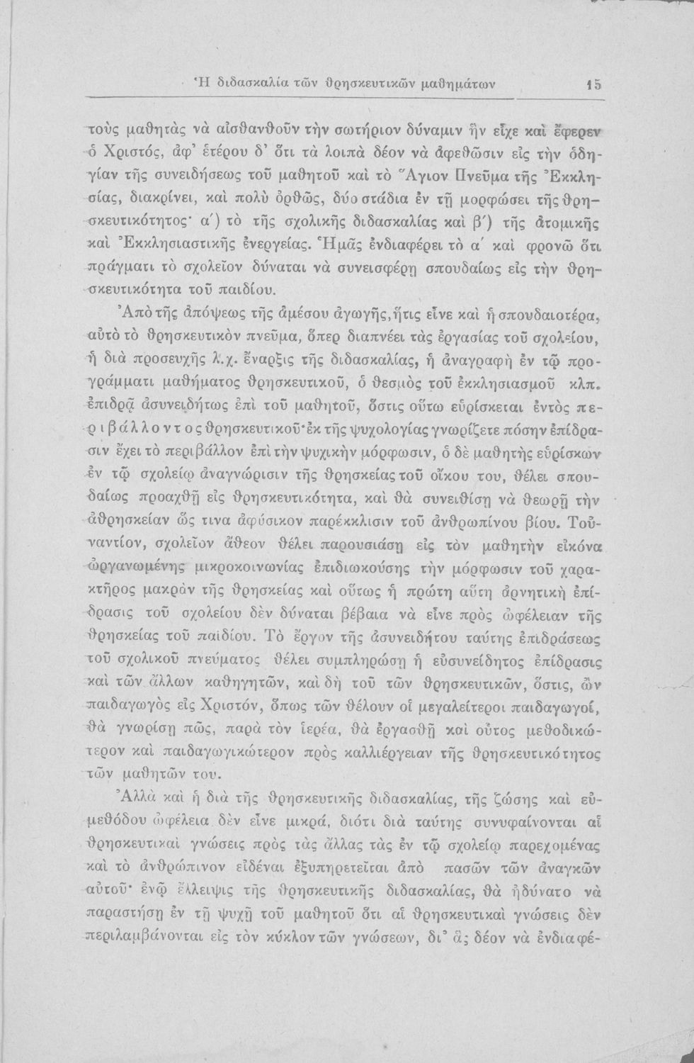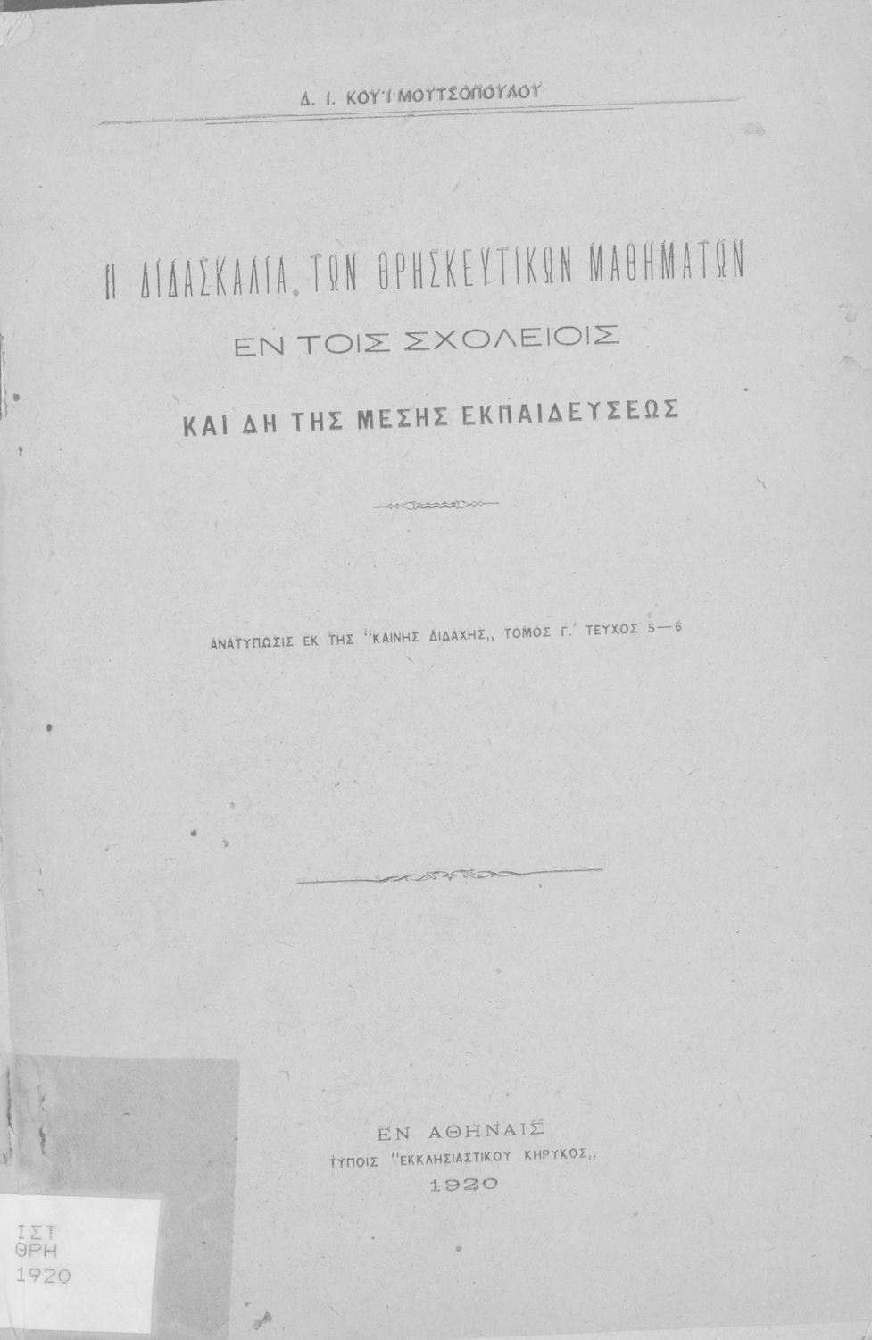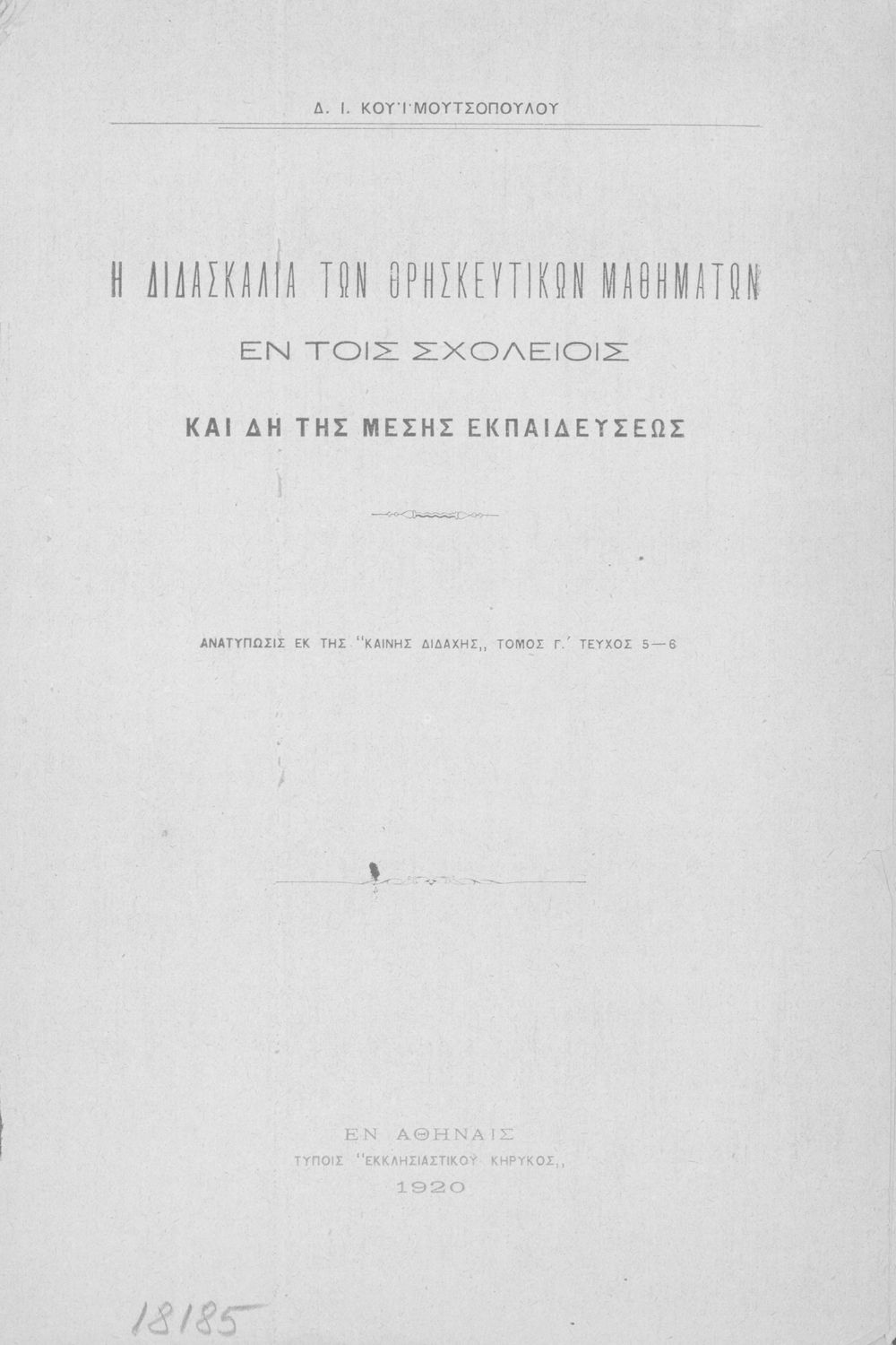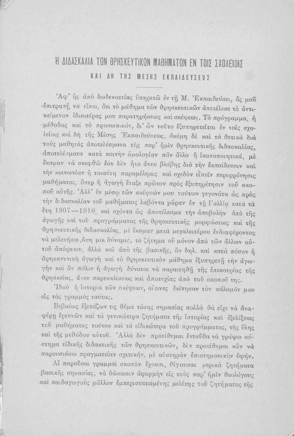 Ανάτυπο άρθρου που δημοσιεύτηκε στην Καινή Διδαχή τόμος Γ΄, τχ. 5-6, ένα περιοδικό που εξέδιδε ο Μητροπολίτης Αθηνών και μετέπειτα Αρχιεπίσκοπος Ελλάδας Μελέτιος, και αποτυπώνει τις απόψεις του συγγραφέα σχετικά με τη διδασκαλία των Θρησκευτικών στη Δευτεροβάθμια Εκπαίδευση. Το άρθρο γράφτηκε με αφορμή την κατάργηση του μαθήματος στα γαλλικά σχολεία το 1907-1910.