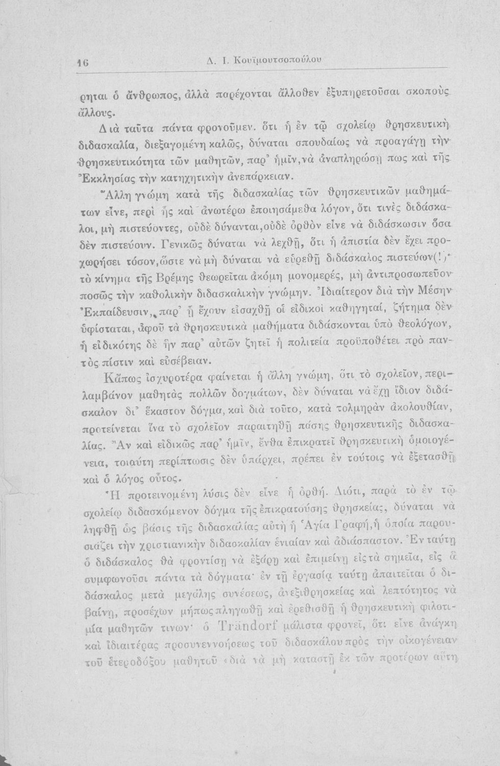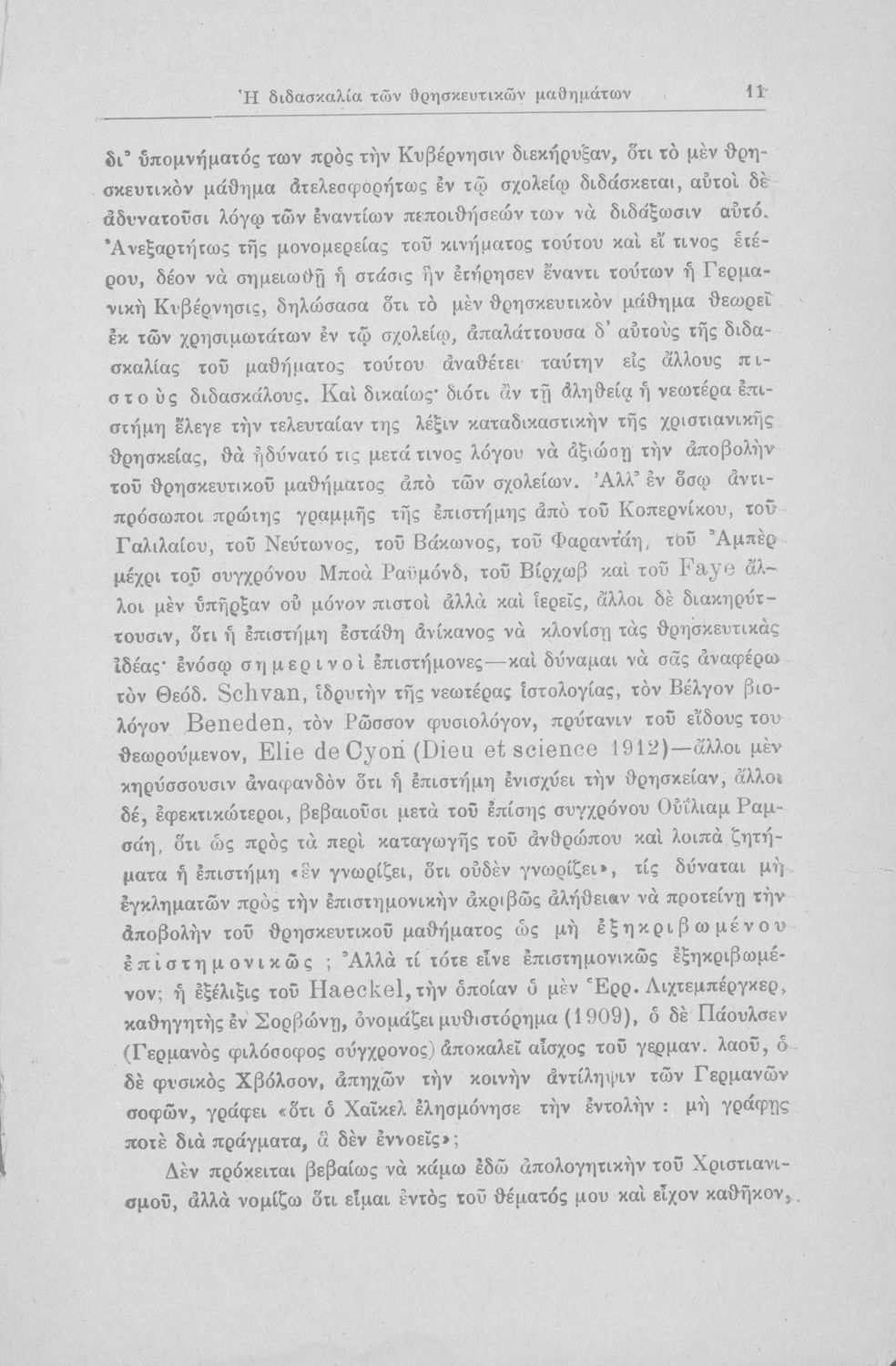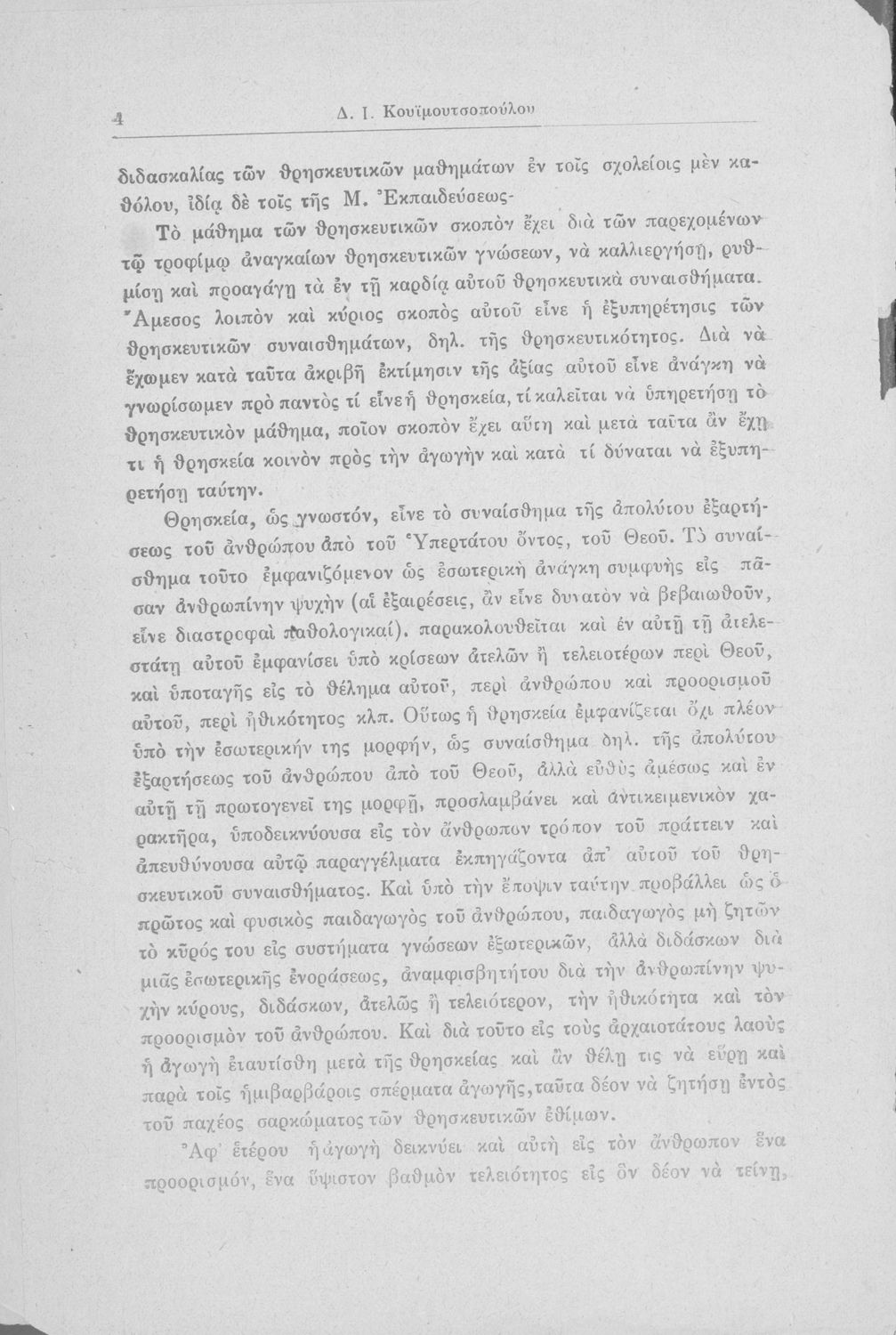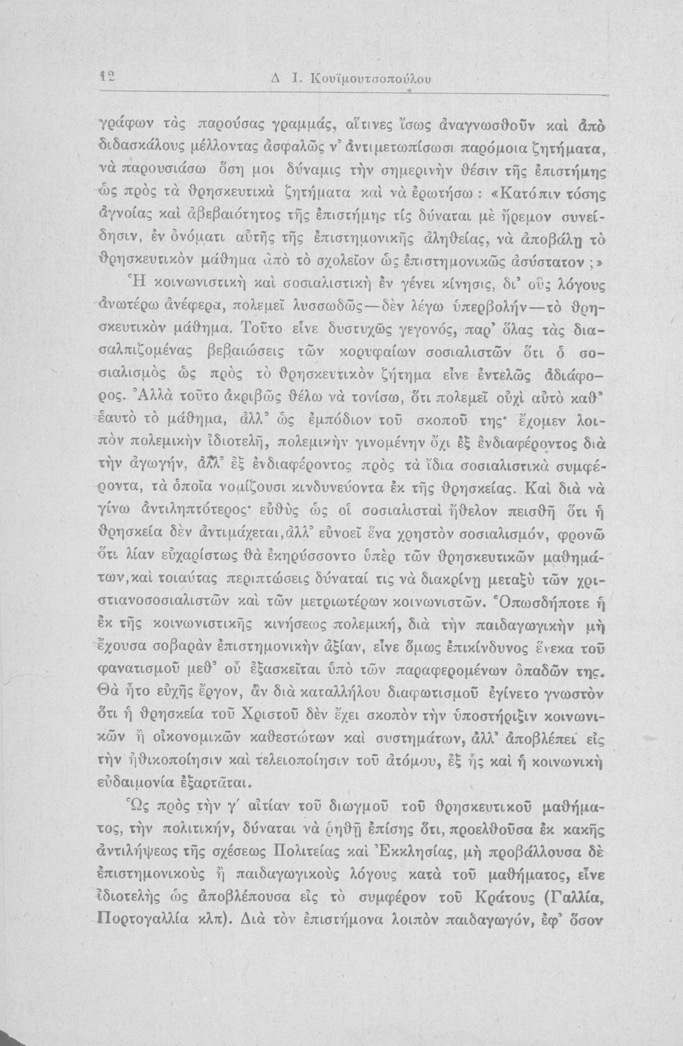 Ανάτυπο άρθρου που δημοσιεύτηκε στην Καινή Διδαχή τόμος Γ΄, τχ. 5-6, ένα περιοδικό που εξέδιδε ο Μητροπολίτης Αθηνών και μετέπειτα Αρχιεπίσκοπος Ελλάδας Μελέτιος, και αποτυπώνει τις απόψεις του συγγραφέα σχετικά με τη διδασκαλία των Θρησκευτικών στη Δευτεροβάθμια Εκπαίδευση. Το άρθρο γράφτηκε με αφορμή την κατάργηση του μαθήματος στα γαλλικά σχολεία το 1907-1910.