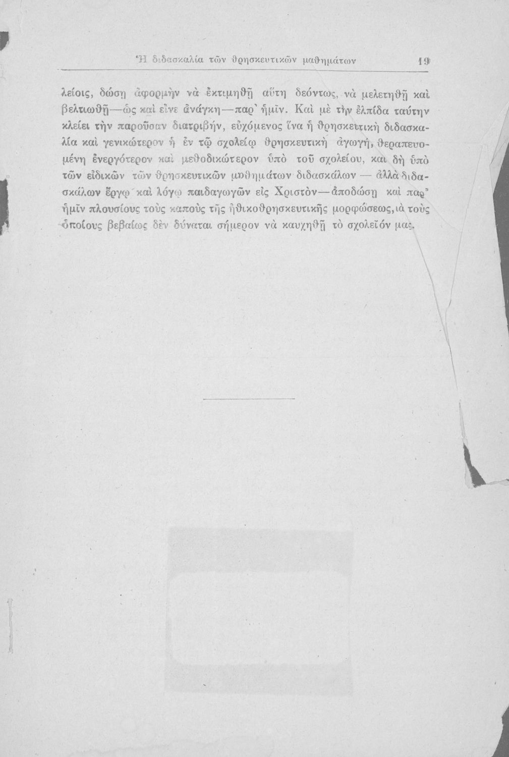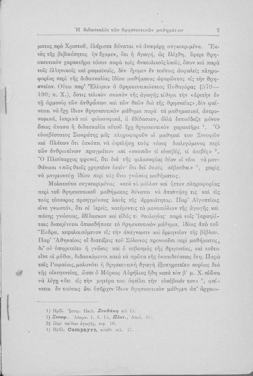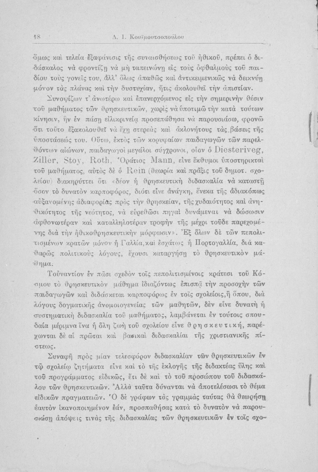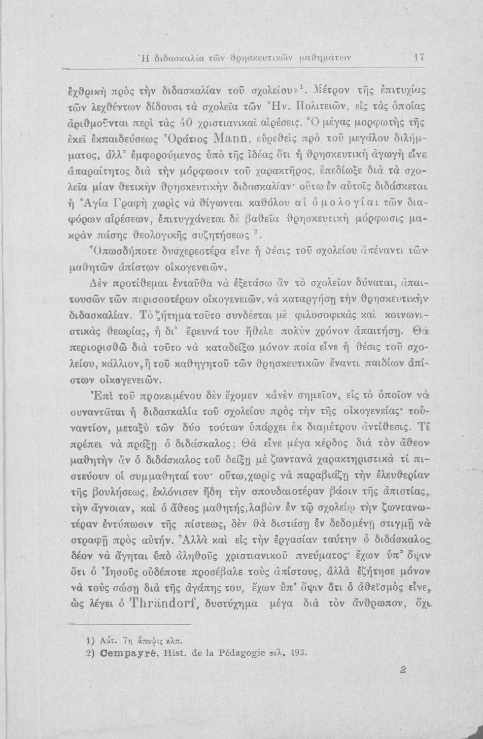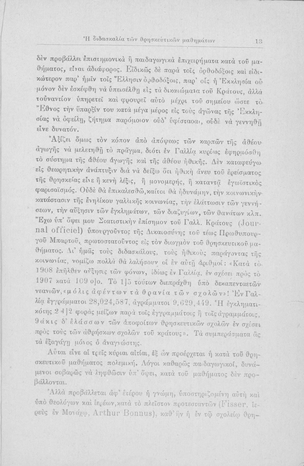 Ανάτυπο άρθρου που δημοσιεύτηκε στην Καινή Διδαχή τόμος Γ΄, τχ. 5-6, ένα περιοδικό που εξέδιδε ο Μητροπολίτης Αθηνών και μετέπειτα Αρχιεπίσκοπος Ελλάδας Μελέτιος, και αποτυπώνει τις απόψεις του συγγραφέα σχετικά με τη διδασκαλία των Θρησκευτικών στη Δευτεροβάθμια Εκπαίδευση. Το άρθρο γράφτηκε με αφορμή την κατάργηση του μαθήματος στα γαλλικά σχολεία το 1907-1910.