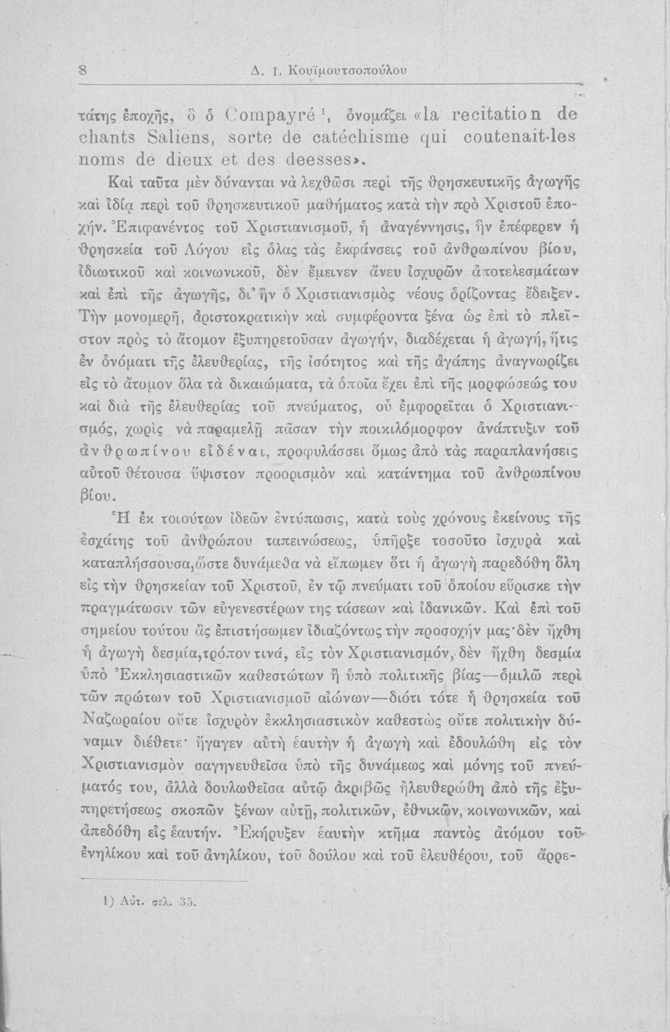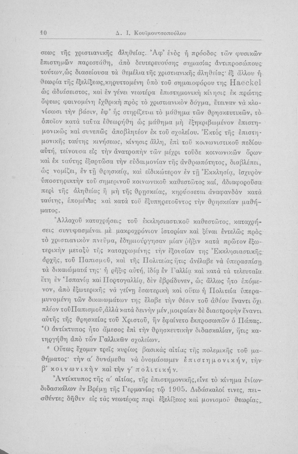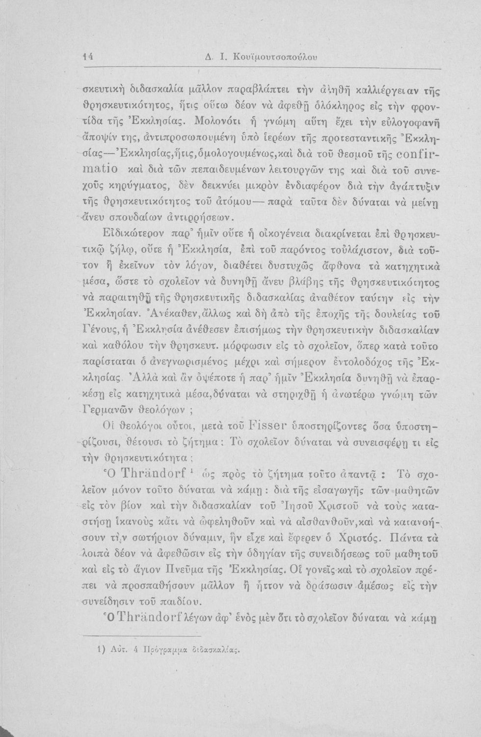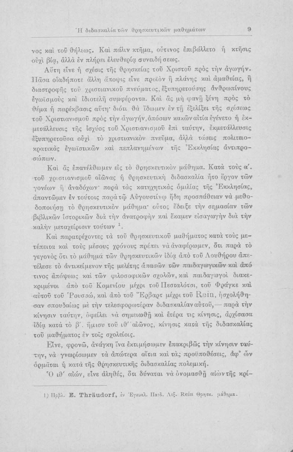 Ανάτυπο άρθρου που δημοσιεύτηκε στην Καινή Διδαχή τόμος Γ΄, τχ. 5-6, ένα περιοδικό που εξέδιδε ο Μητροπολίτης Αθηνών και μετέπειτα Αρχιεπίσκοπος Ελλάδας Μελέτιος, και αποτυπώνει τις απόψεις του συγγραφέα σχετικά με τη διδασκαλία των Θρησκευτικών στη Δευτεροβάθμια Εκπαίδευση. Το άρθρο γράφτηκε με αφορμή την κατάργηση του μαθήματος στα γαλλικά σχολεία το 1907-1910.