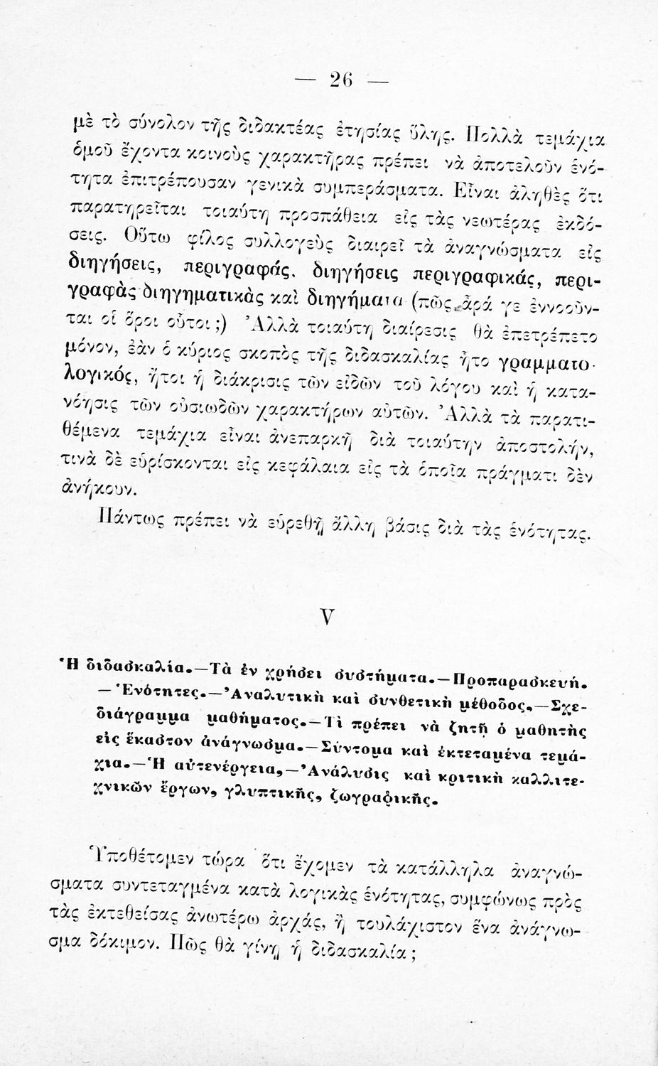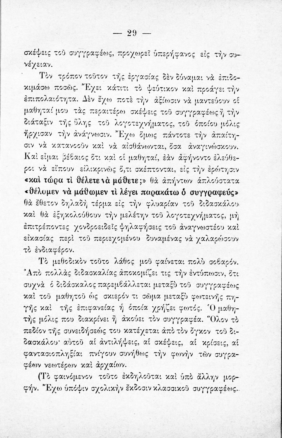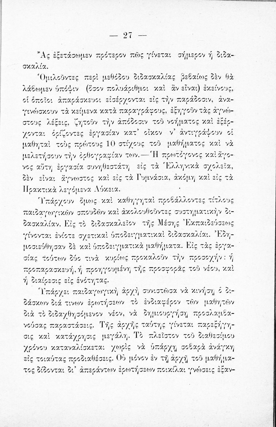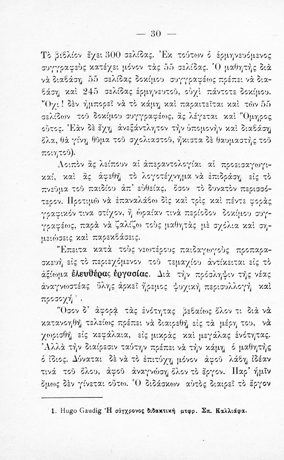 Παιδαγωγικό βοήθημα που αποσκοπεί να συμβάλει στην "ανοικοδόμηση του παιδαγωγικού σχολείου" και στη βάση του ότι "το σχολείον είναι εν πρώτοις παιδαγωγικόν καθίδρυμα και επομένως και διδακτικόν". Ο μεταφραστής