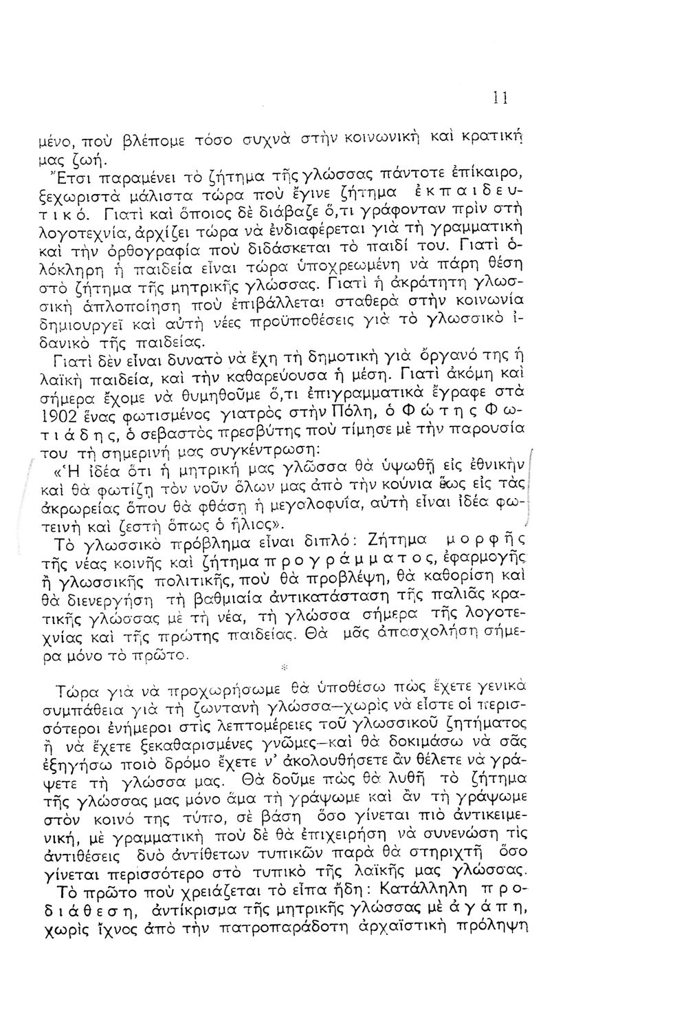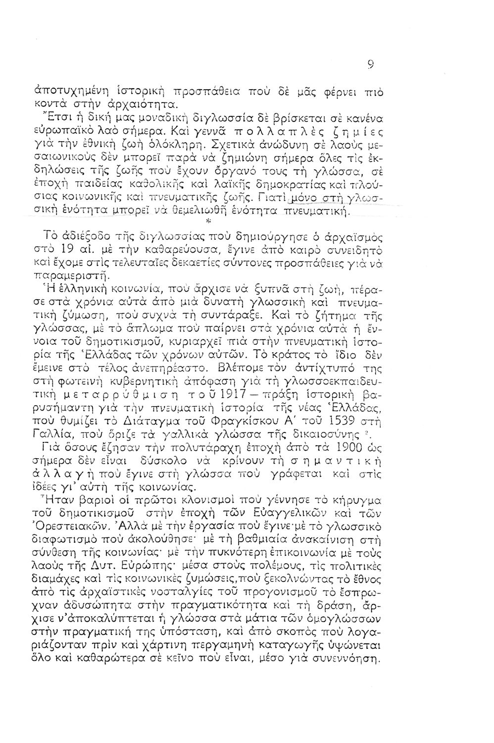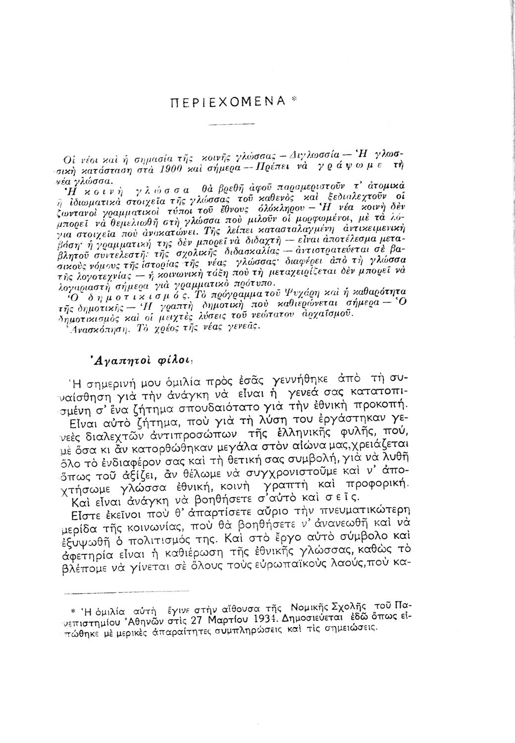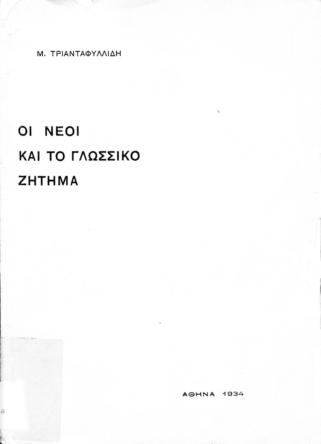 Έκδοση της ομιλίας του Μ. Τριανταφυλλίδη στη Νομική Σχολή Αθηνών στις 27 Μαρτίου 1934 με κάποιες συμπληρώσεις. Αναφέρεται στο γλωσσικό ζήτημα.