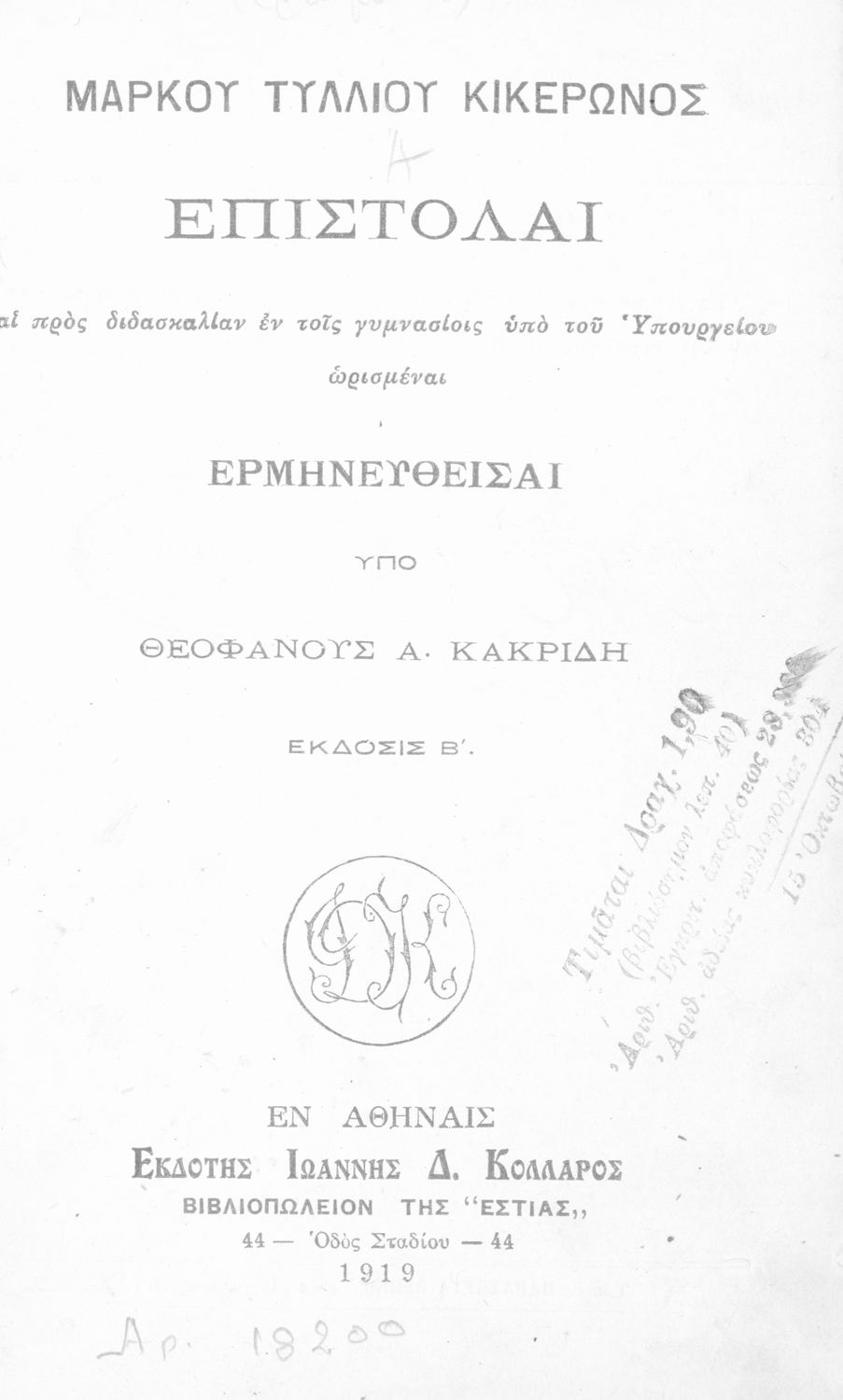 Τίτλος: Μάρκου Τυλλίου Κικέρωνος επιστολαί αι προς διδασκαλίαν εν τοις Γυμνασίοις υπό του Υπουργείου ωρισμέναι