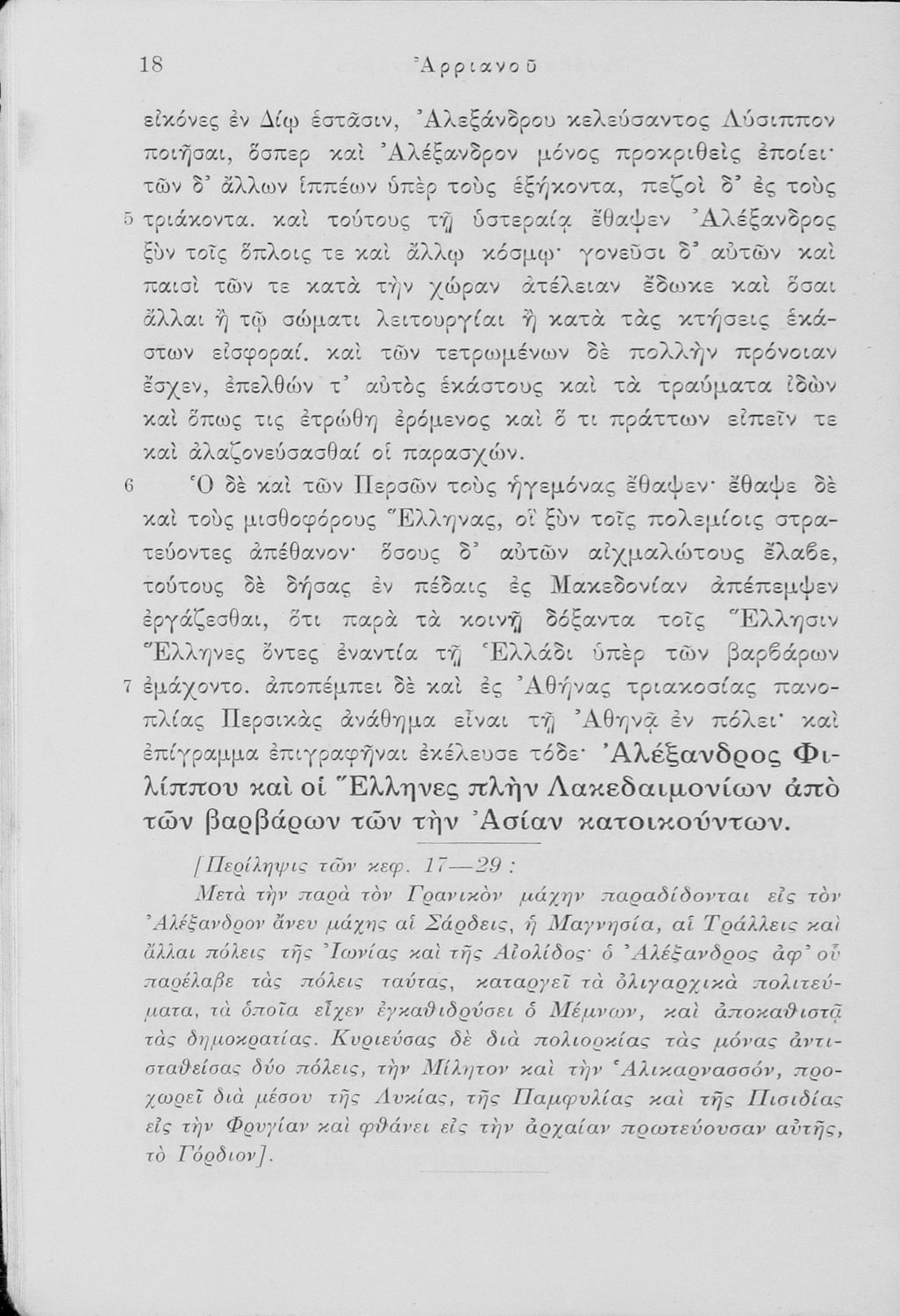 Σχολικό εγχειρίδιο Αρχαίων Ελληνικών Ε΄ Γυμνασίου που περιέχει αποσπάσματα από την Αλεξάνδρου Ανάβασις του Αρριανού, ερμηνευτικά και πραγματολογικά σχόλια και λεξιλογικές παρατηρήσεις.