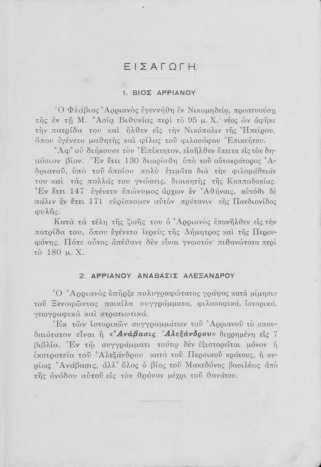Σχολικό εγχειρίδιο Αρχαίων Ελληνικών Γ΄ Γυμνασίου που περιλαμβάνει σύντομο βιογραφικό σημείωμα του Αρριανού, εισαγωγή στο έργο, αποσπάσματα από το πρώτο και δεύτερο βιβλίο της Ανάβασης του Αλέξανδρου και ετυμολογικές σημειώσεις