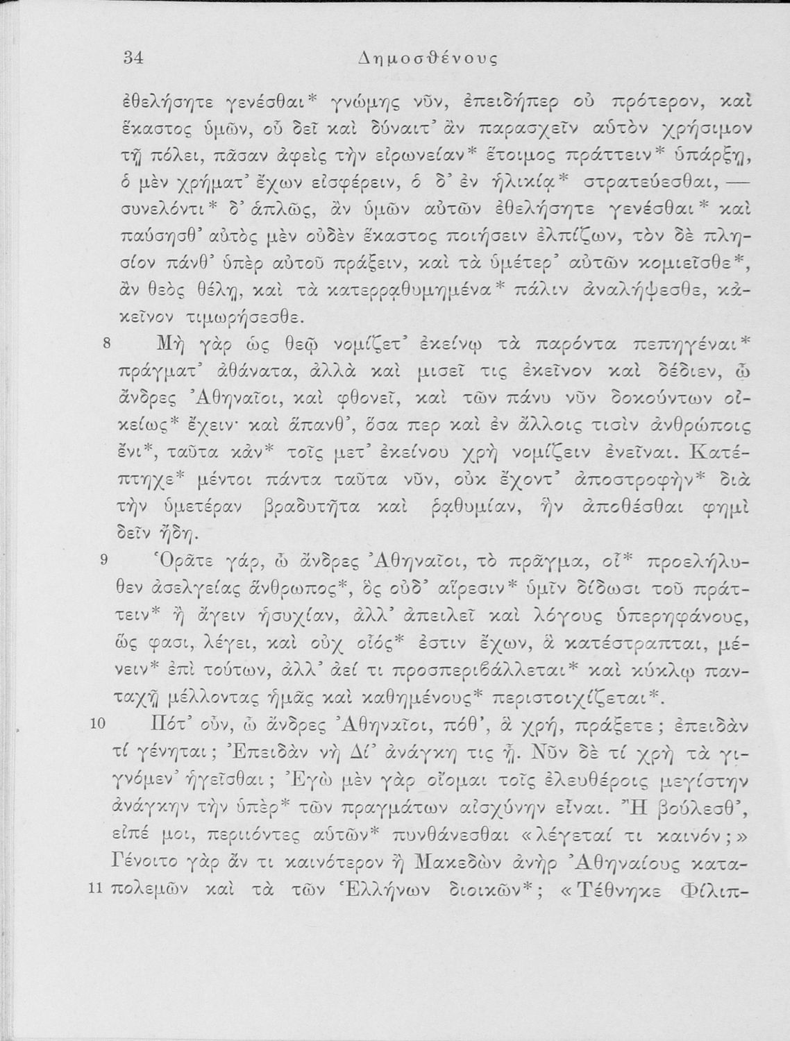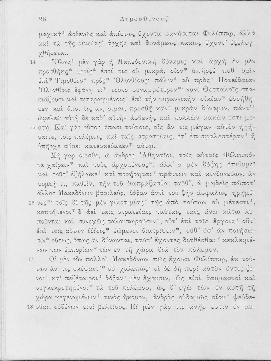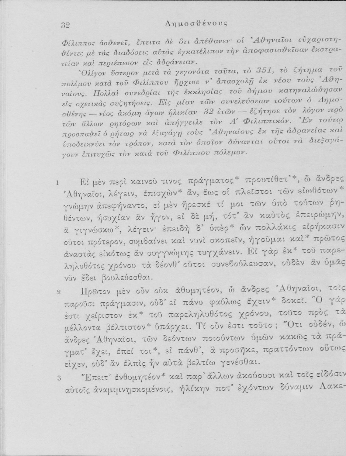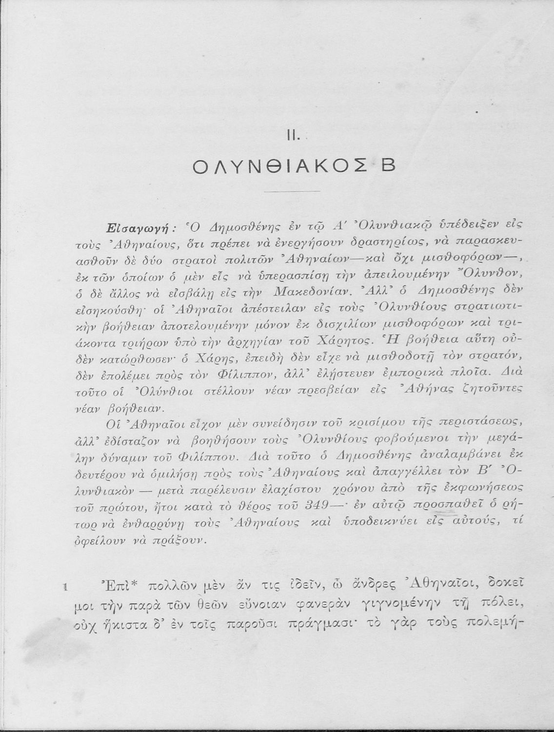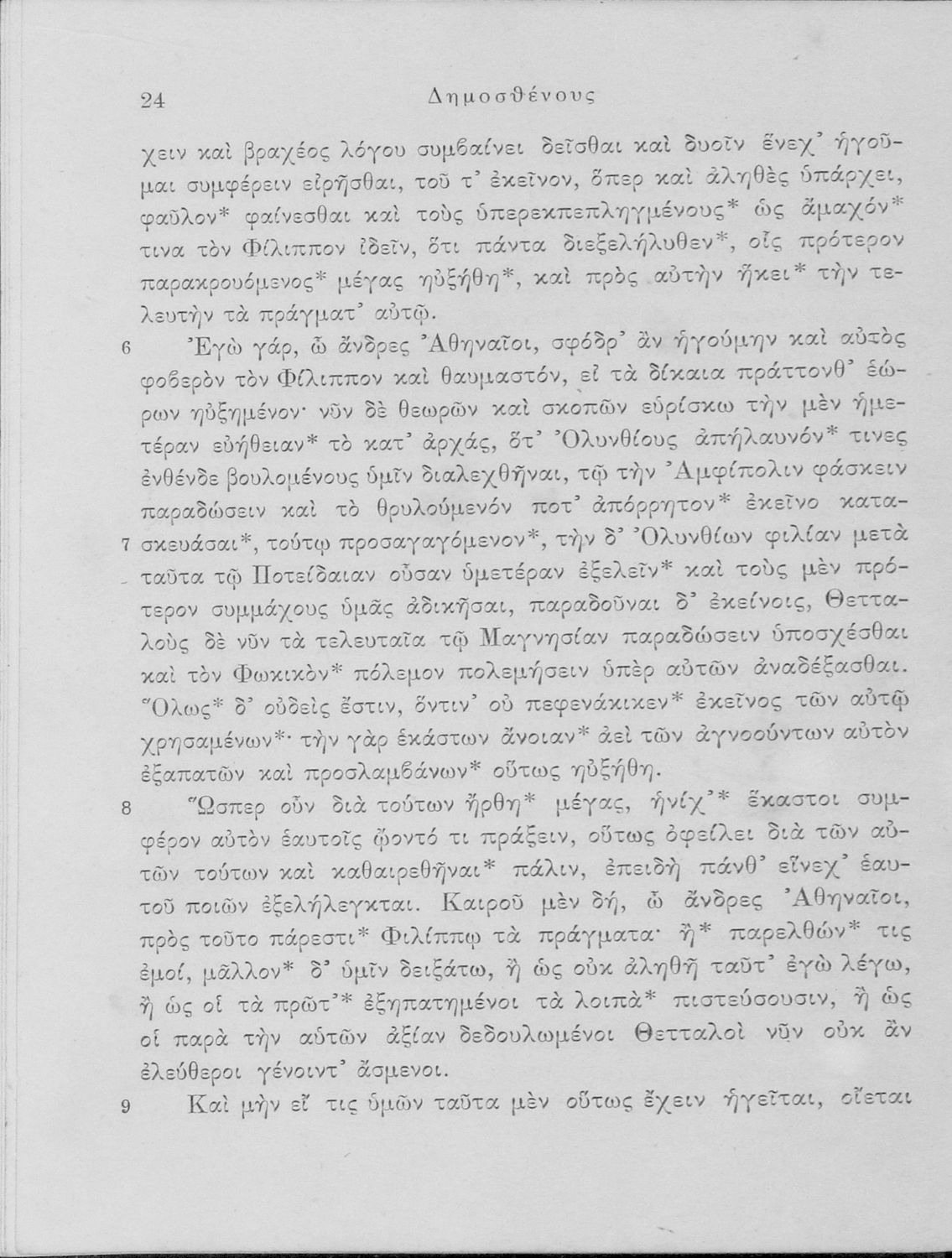 Σχολικό εγχειρίδιο Αρχαίων Ελληνικών Δ΄ και Ε΄ Γυμνασίου που περιέχει τους Ολυνθιακούς Α΄ και Β΄ και τους Φιλιππικούς Α΄ και Β΄ του Δημοσθένη, βιογραφικό σημείωμα, λεξιλόγιο και ερμηνευτικά και ετυμολογικά σχόλια.